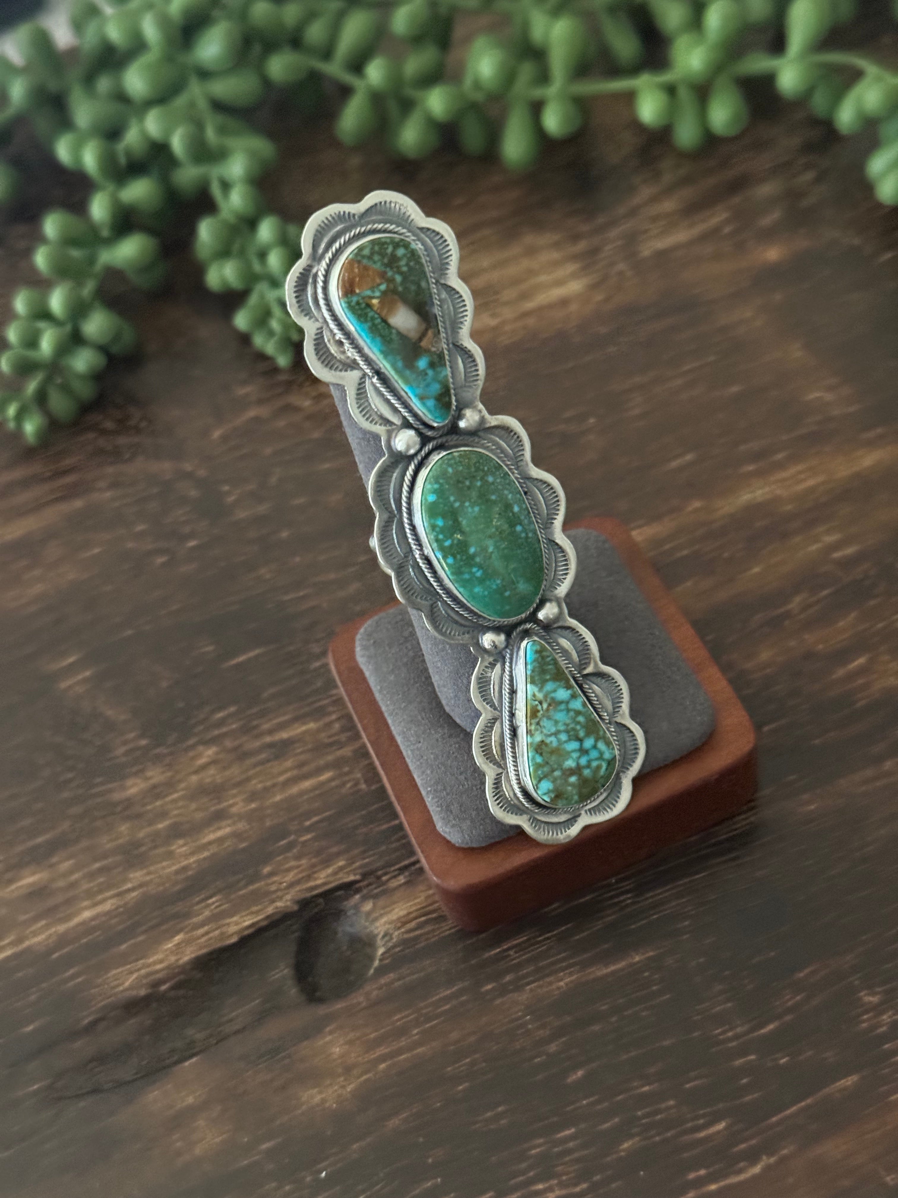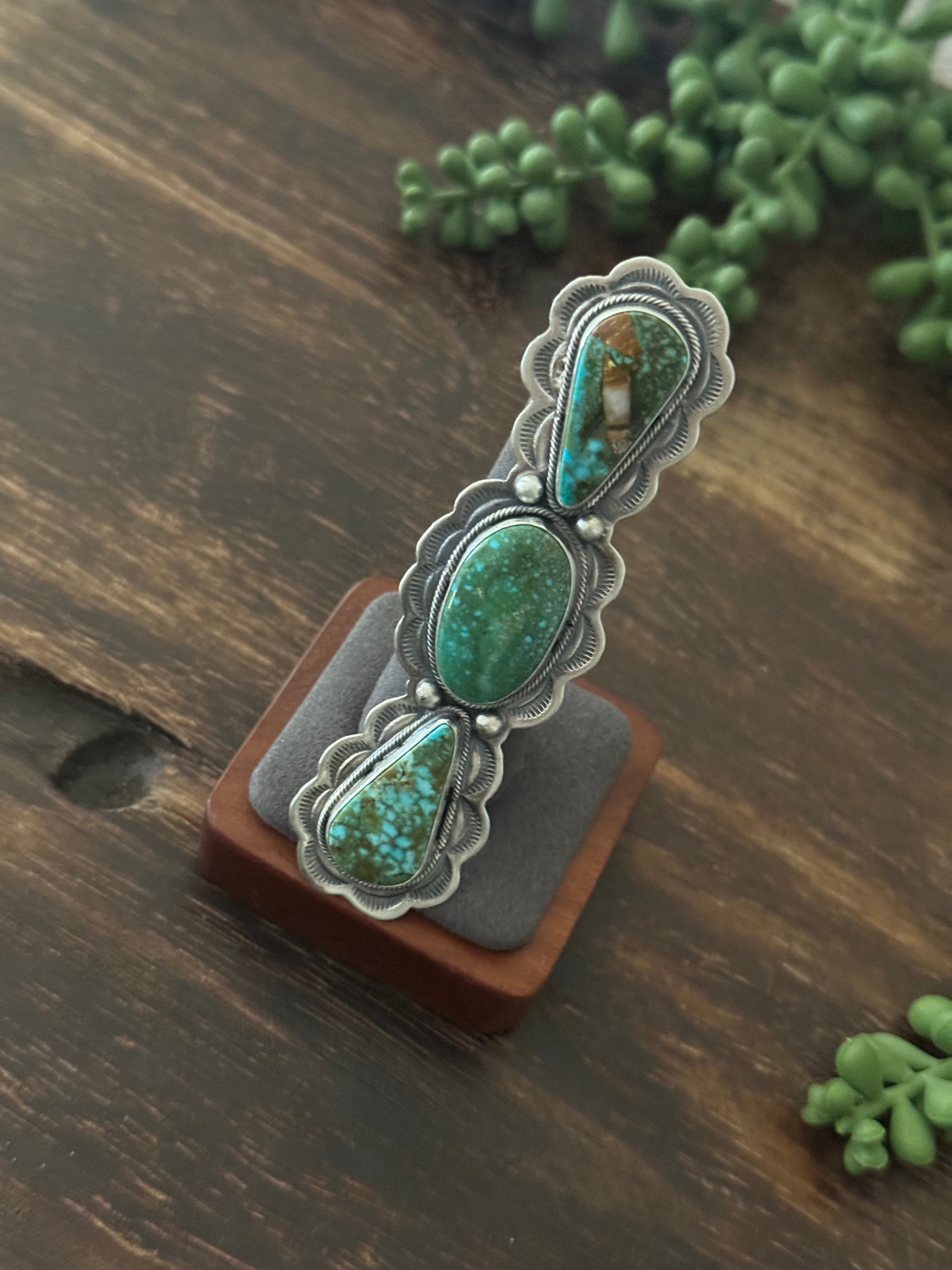 Danny Henio High Grade Kingman Turquoise & Sterling Silver Adjustable Ring. It measures 2 5/8 inch long and 1 inch wide. Signed by the artist and stamped sterling silver.