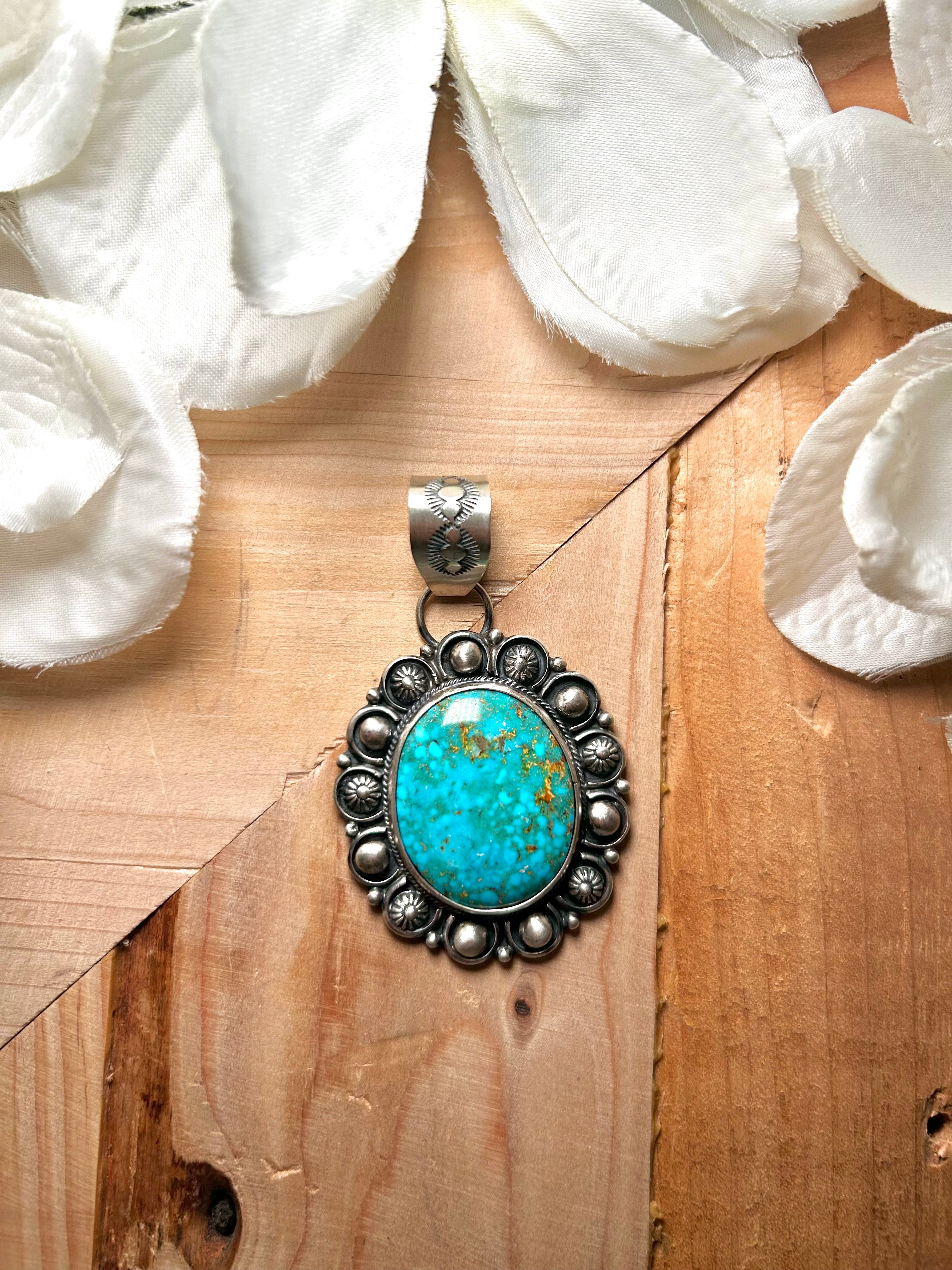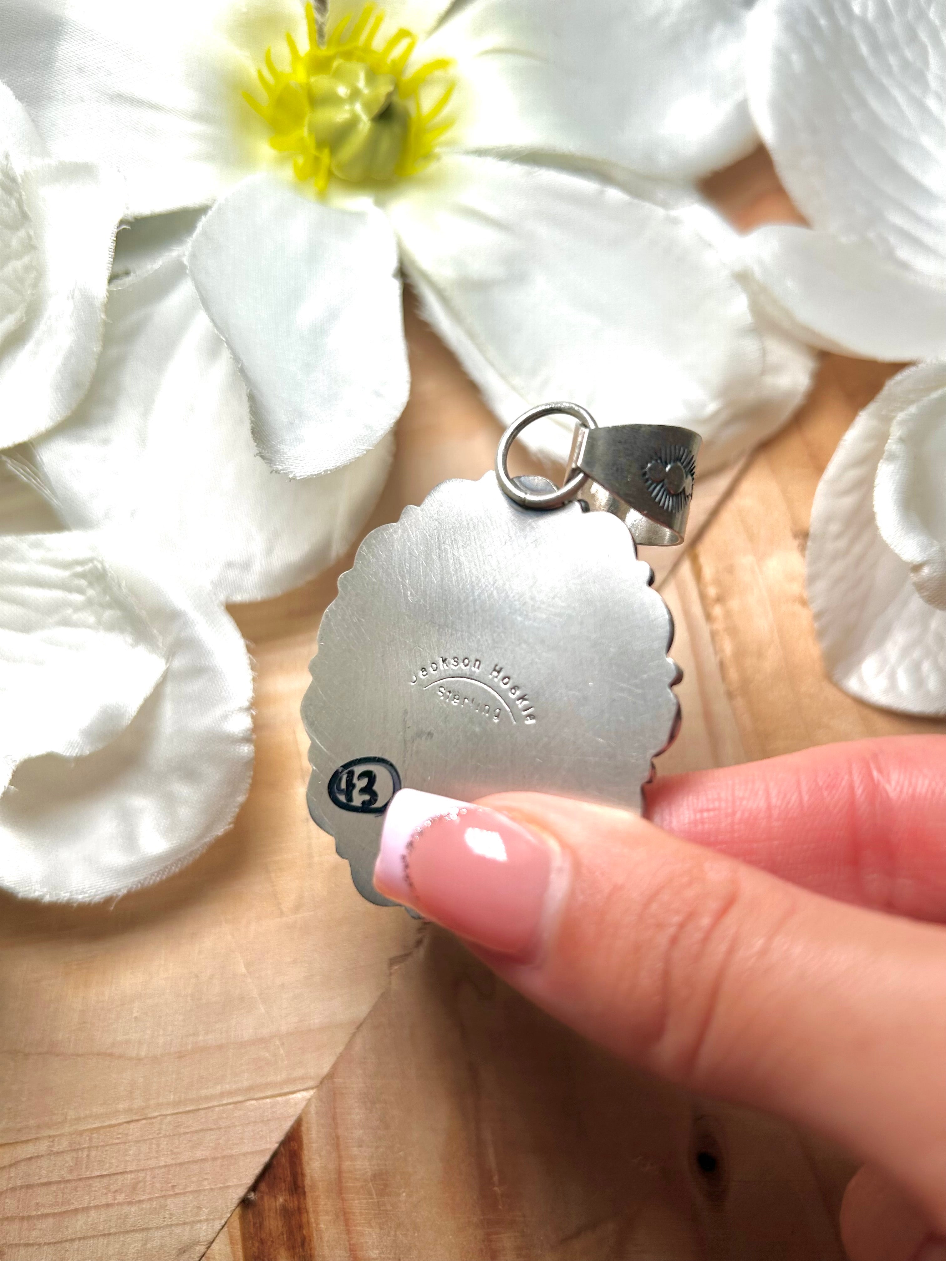 Jackson Hoskie Kingman Turquoise & Sterling Silver Pendant. It measures 2 5/8 inches long and 1 5/8 inches wide. Pendant Only! Signed by the artist and stamped sterling silver.