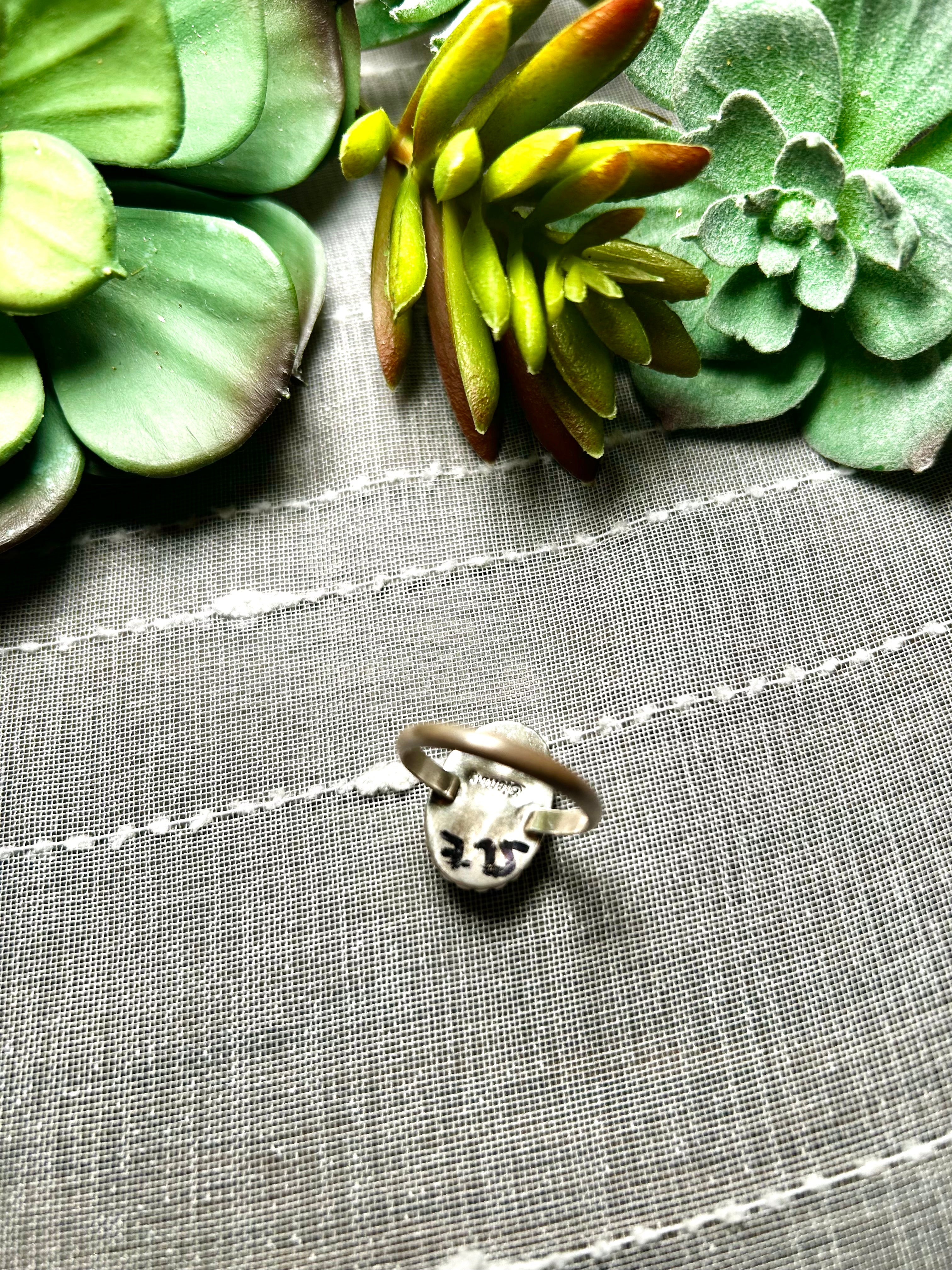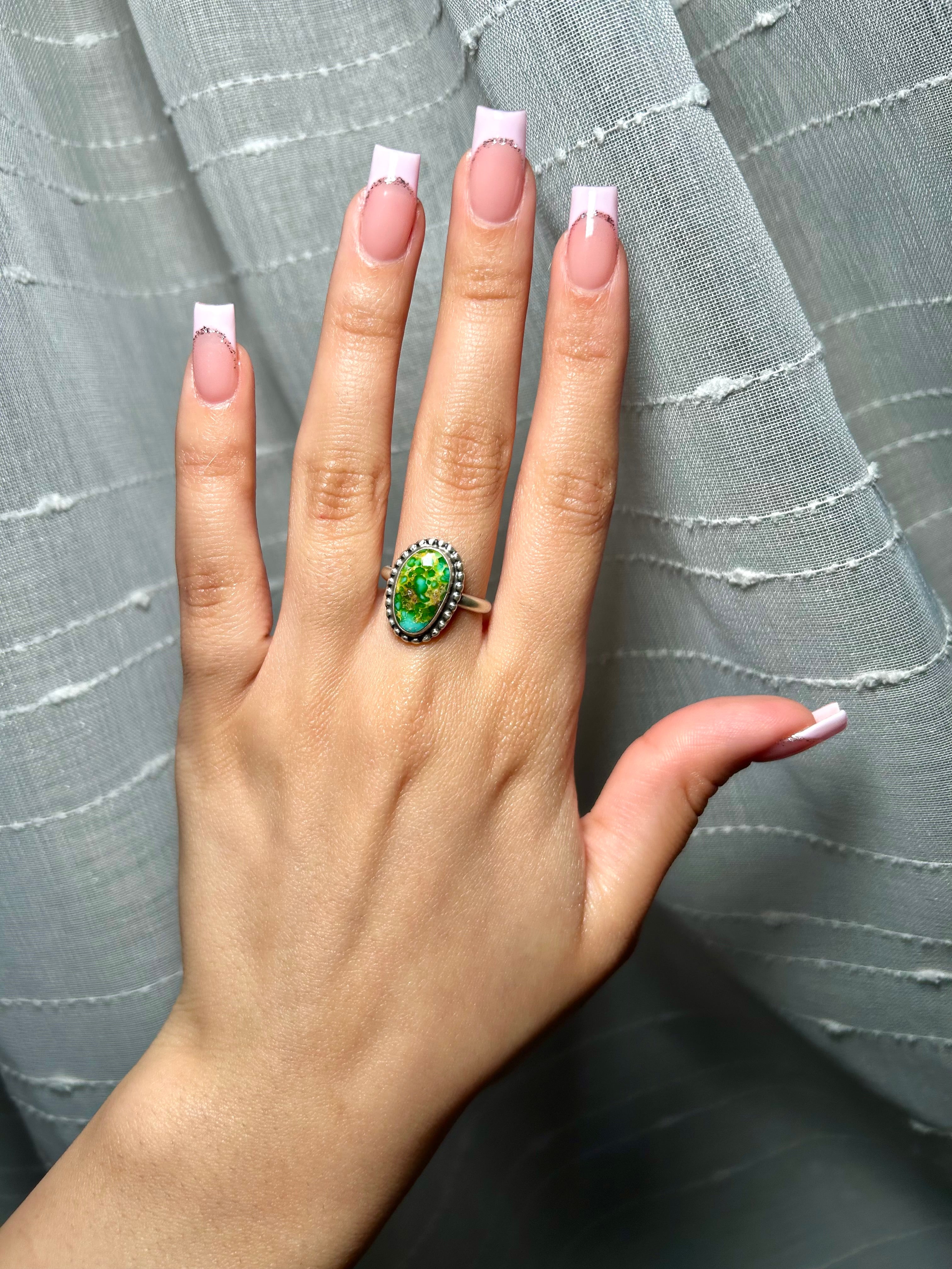 Navajo Made Sonoran Mountain Turquoise & Sterling Silver Ring Size 7.5. It measures 3/4 of an inch long and 1/2 of an inch wide. Signed by the artist and stamped sterling silver.