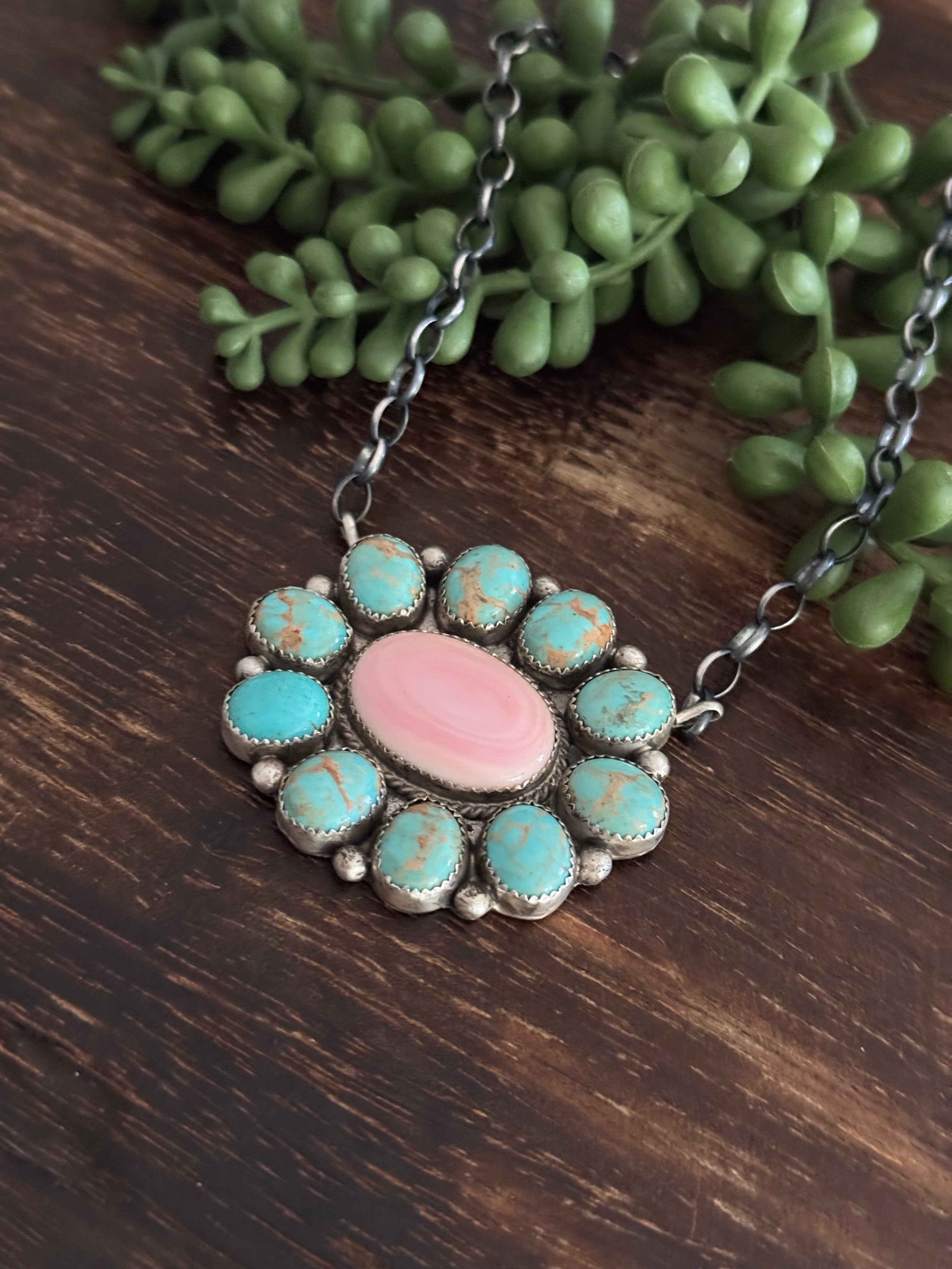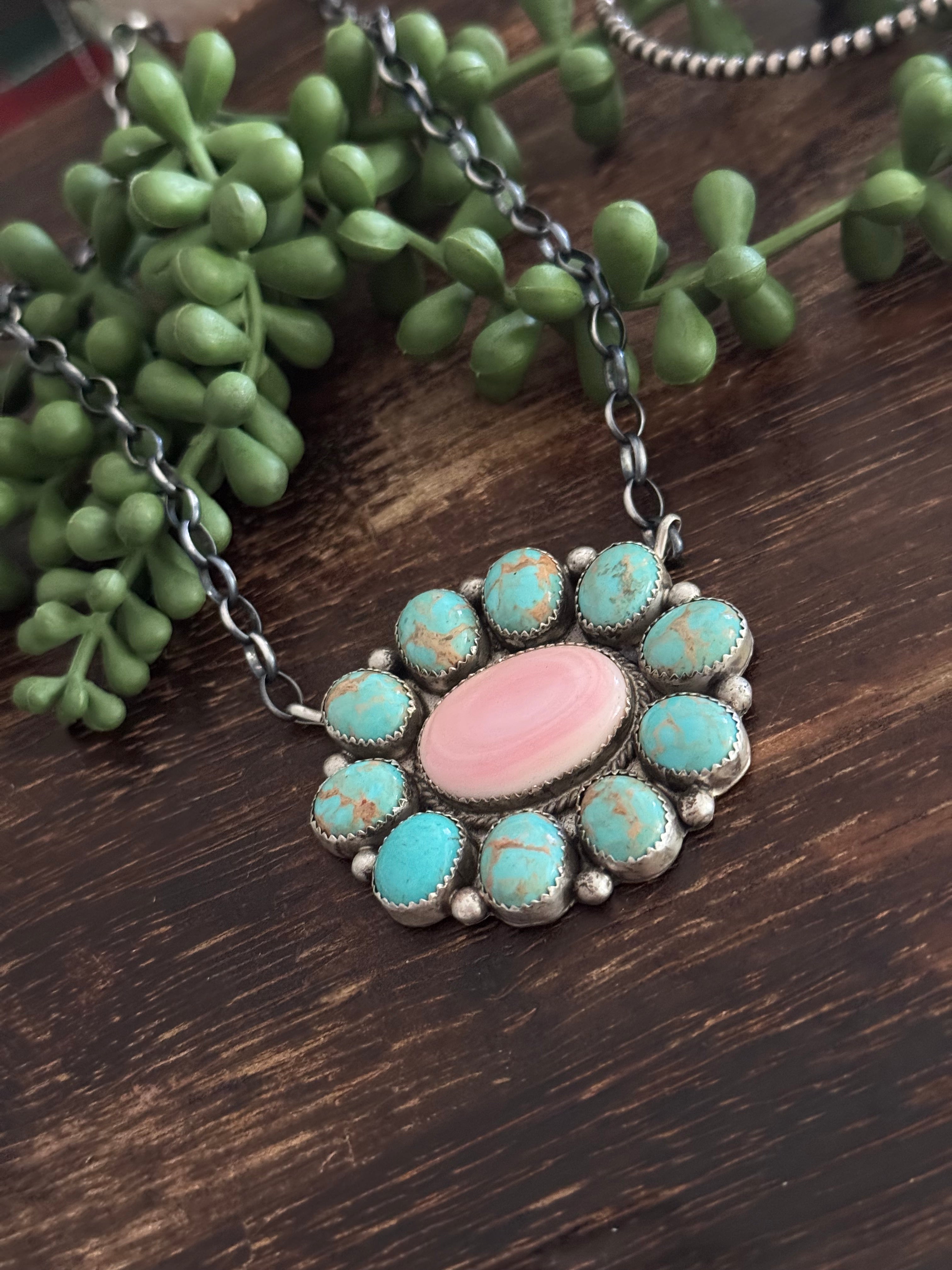 Maxine Ramirez Multi Stone & Sterling Silver Cluster Necklace. It measures 18 1/2 inches long with hang while the chain measures 16 inches long. Stamped sterling silver and signed by artist.