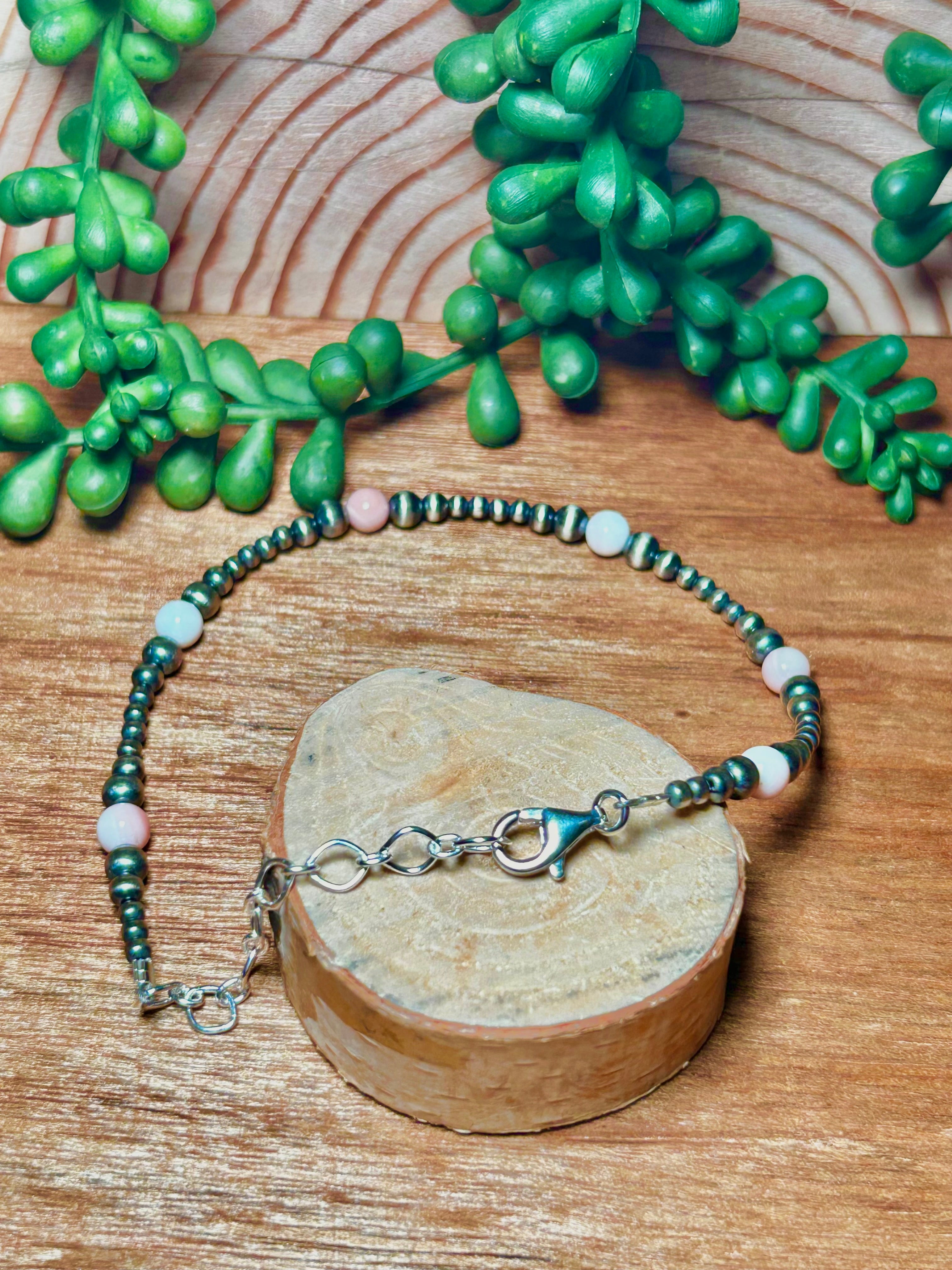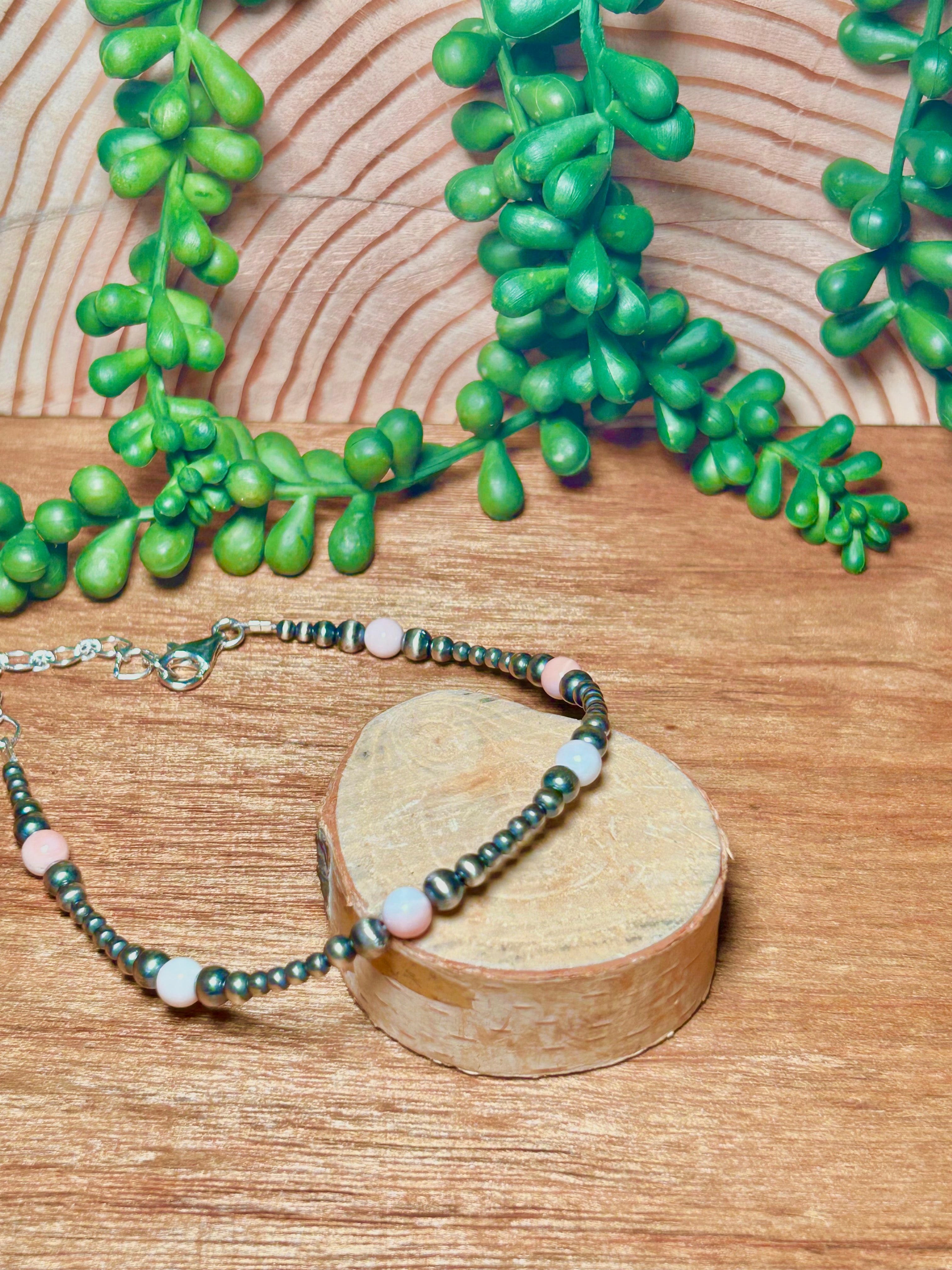 Navajo Made Pink Conch Beaded Sterling Silver Strung Anklet. It measures 11 1/4 inches long and 1/4 of an inch wide.