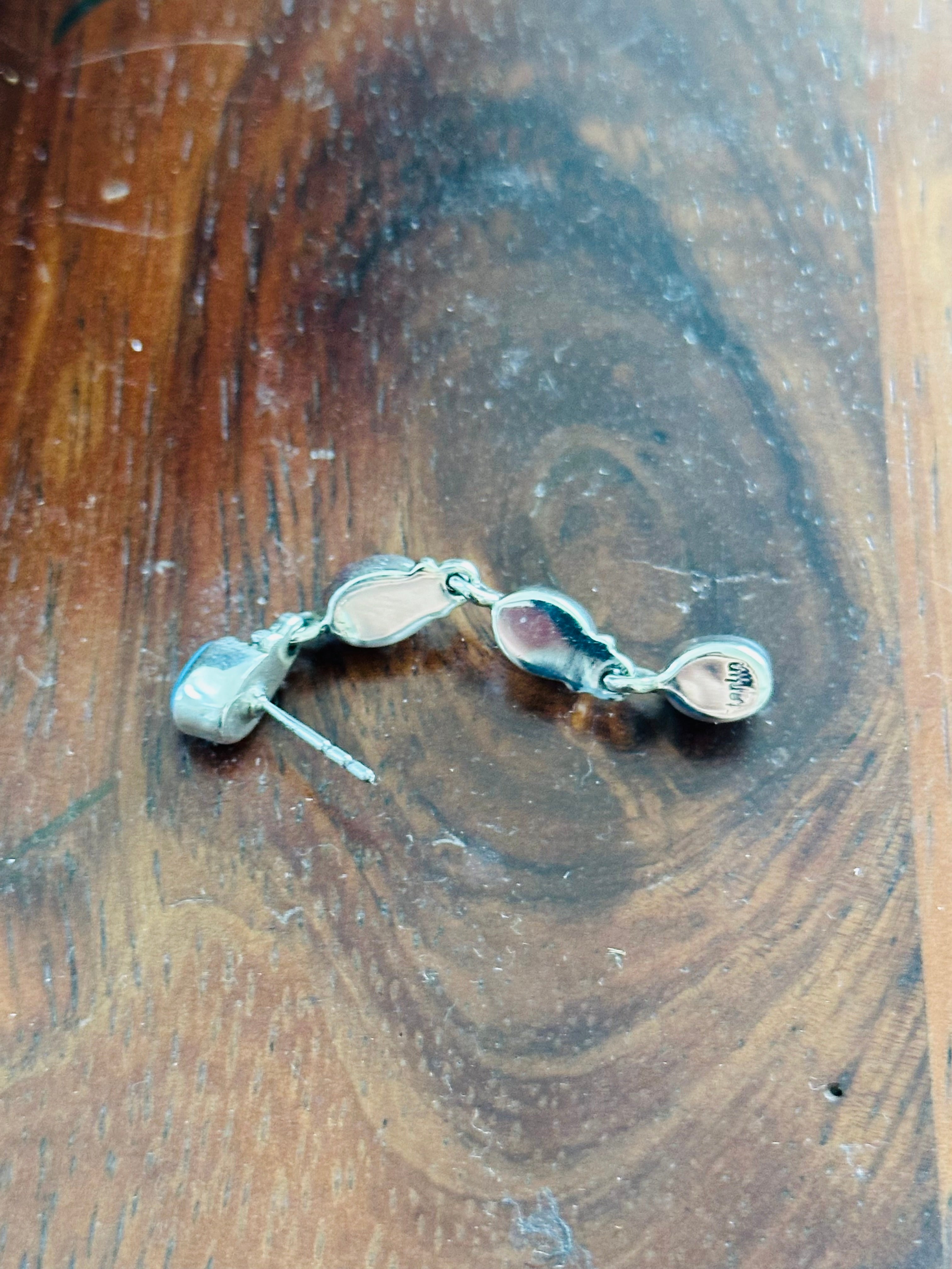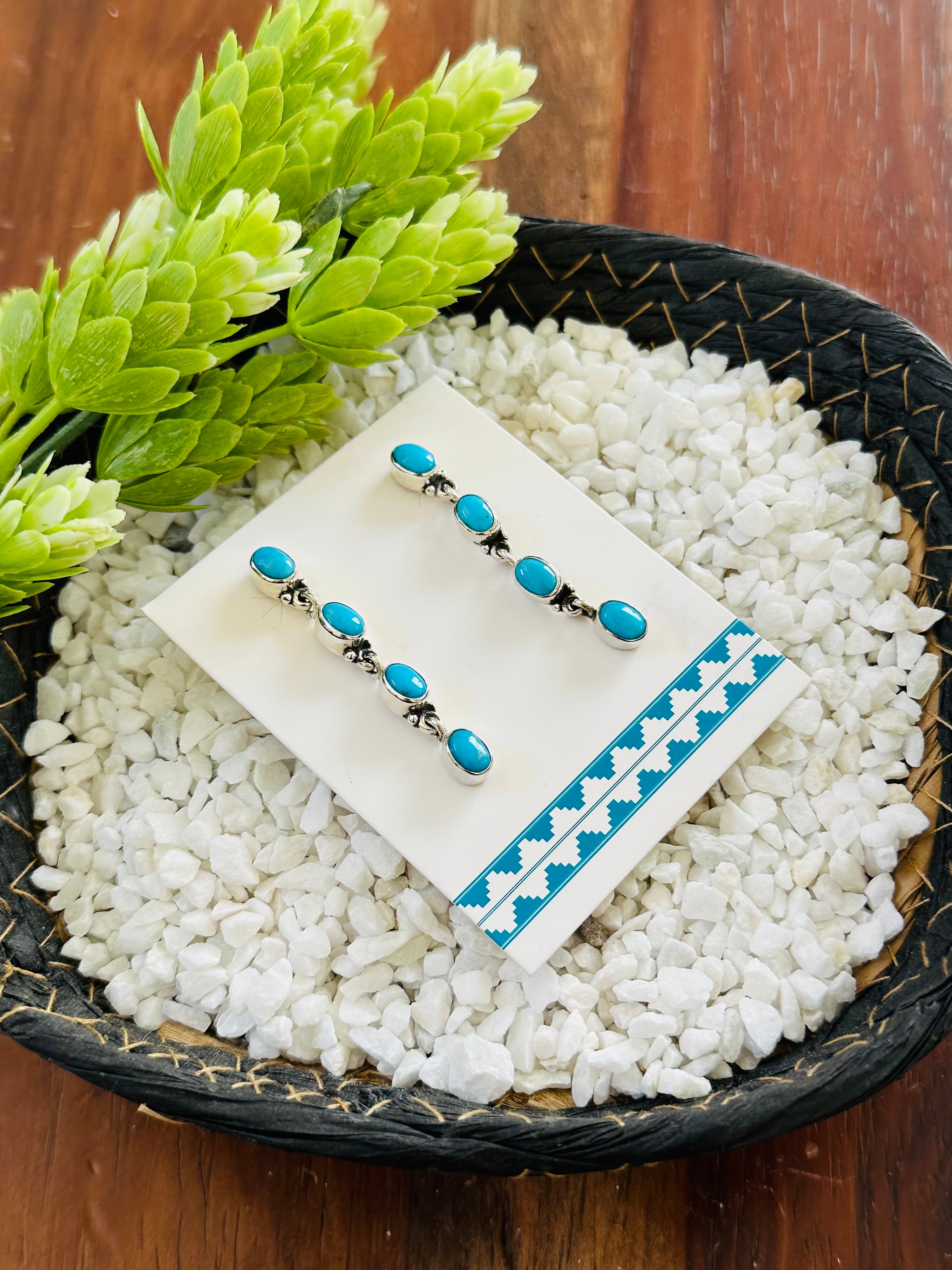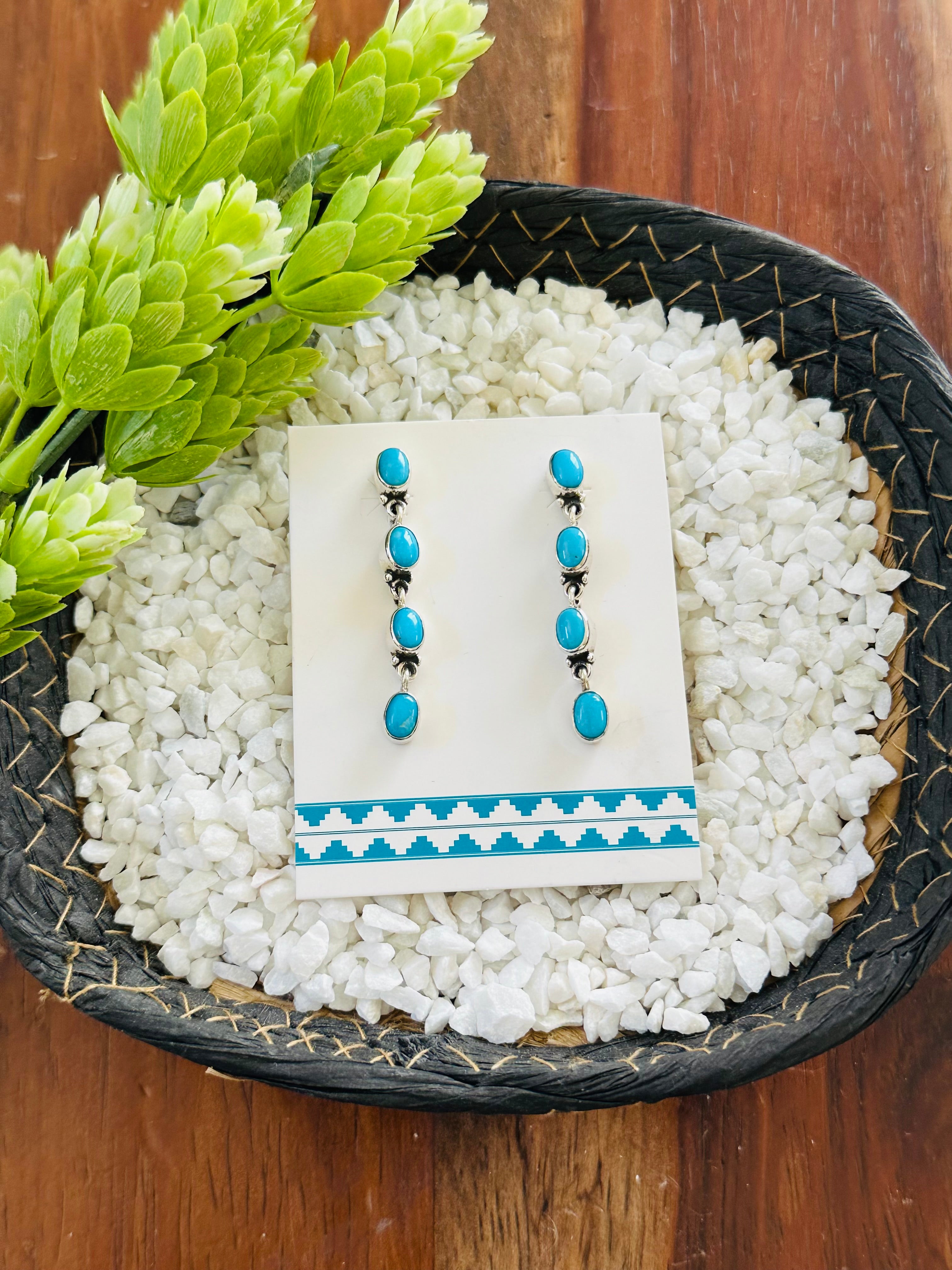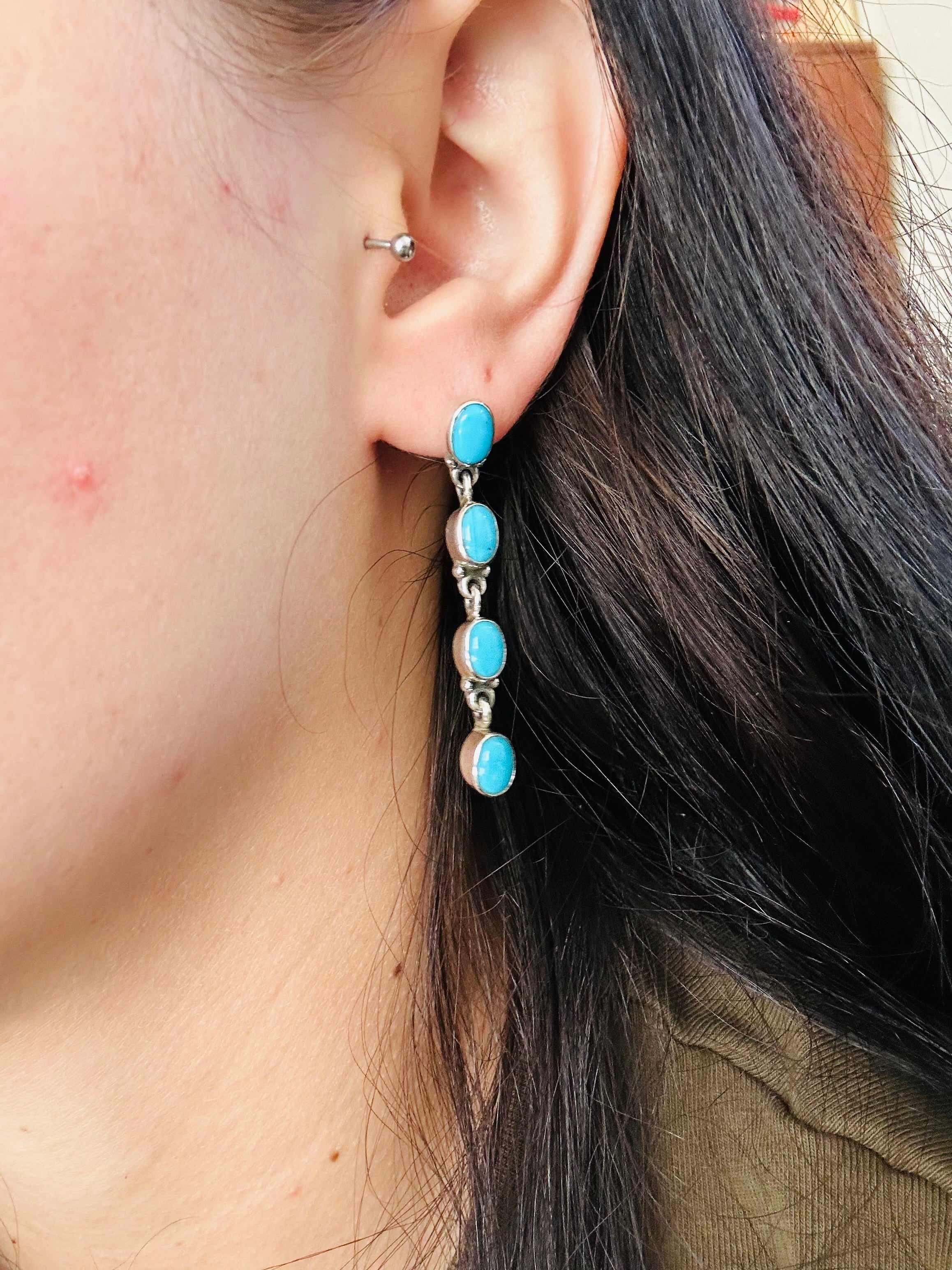 Beautiful post earrings, perfect for your everyday wear. Navajo Handmade Kingman Turquoise & Sterling Silver Post Dangle Earrings. It measures 1 7/8 inches long and 1/4 of an inch wide. Signed by the artist and stamped sterling silver. Stones will differ due to natural stones.