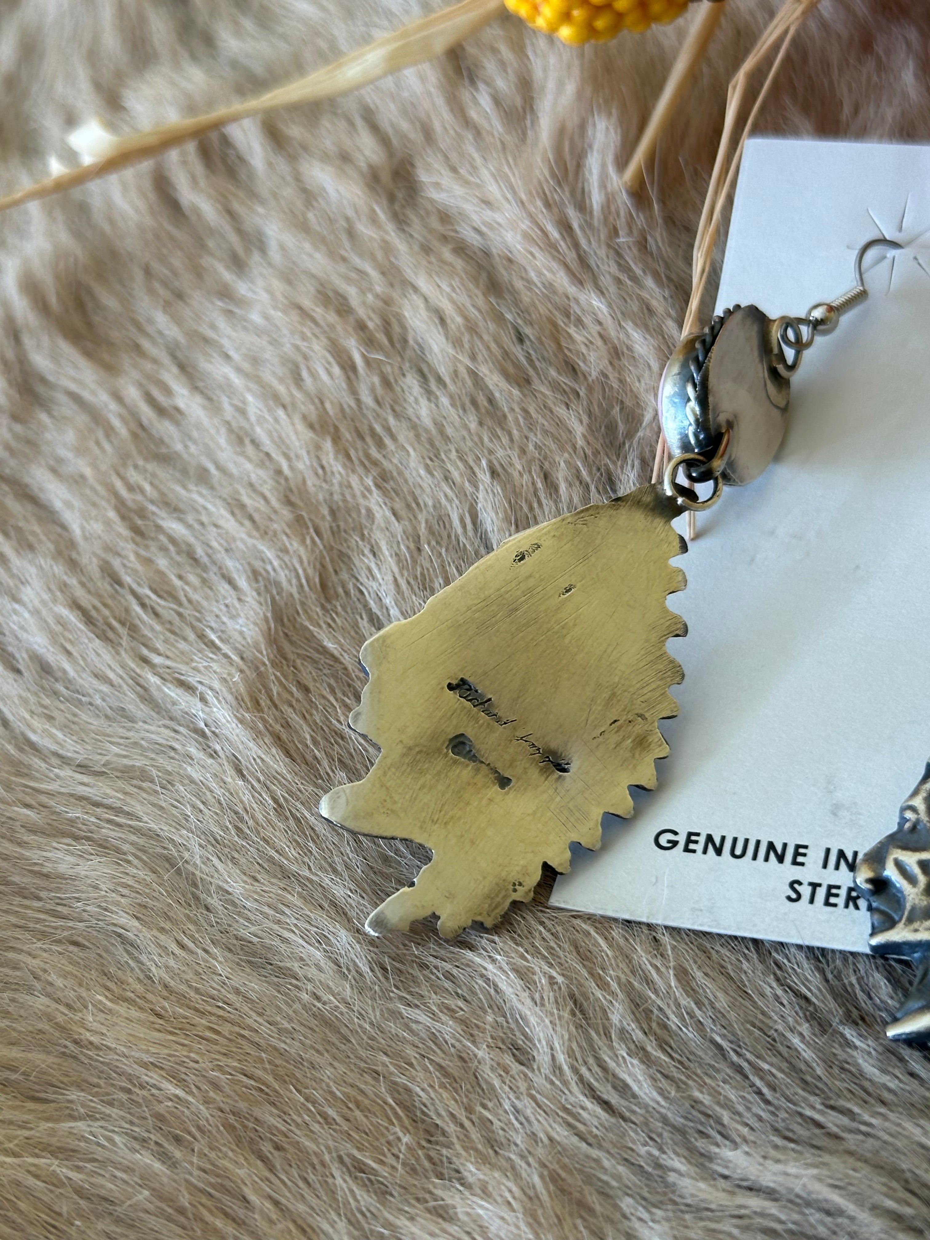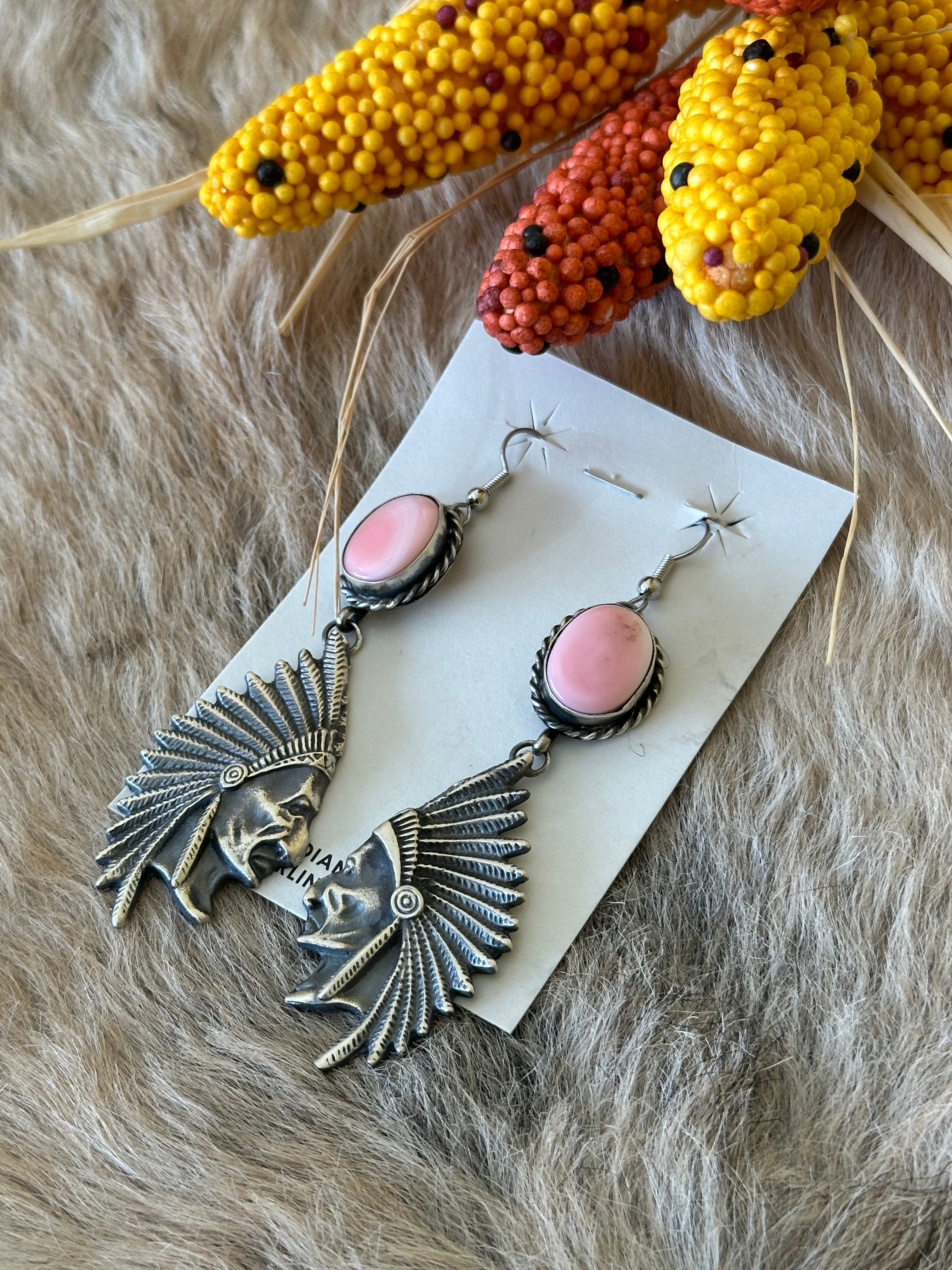 Beautiful earrings, Navajo Handmade Pink Conch & Sterling Silver Dangle Earrings. It measures 3 3/8 inches long and 1 1/8 inches wide. Signed by the artist and stamped sterling silver. Stones will differ due to natural stones.