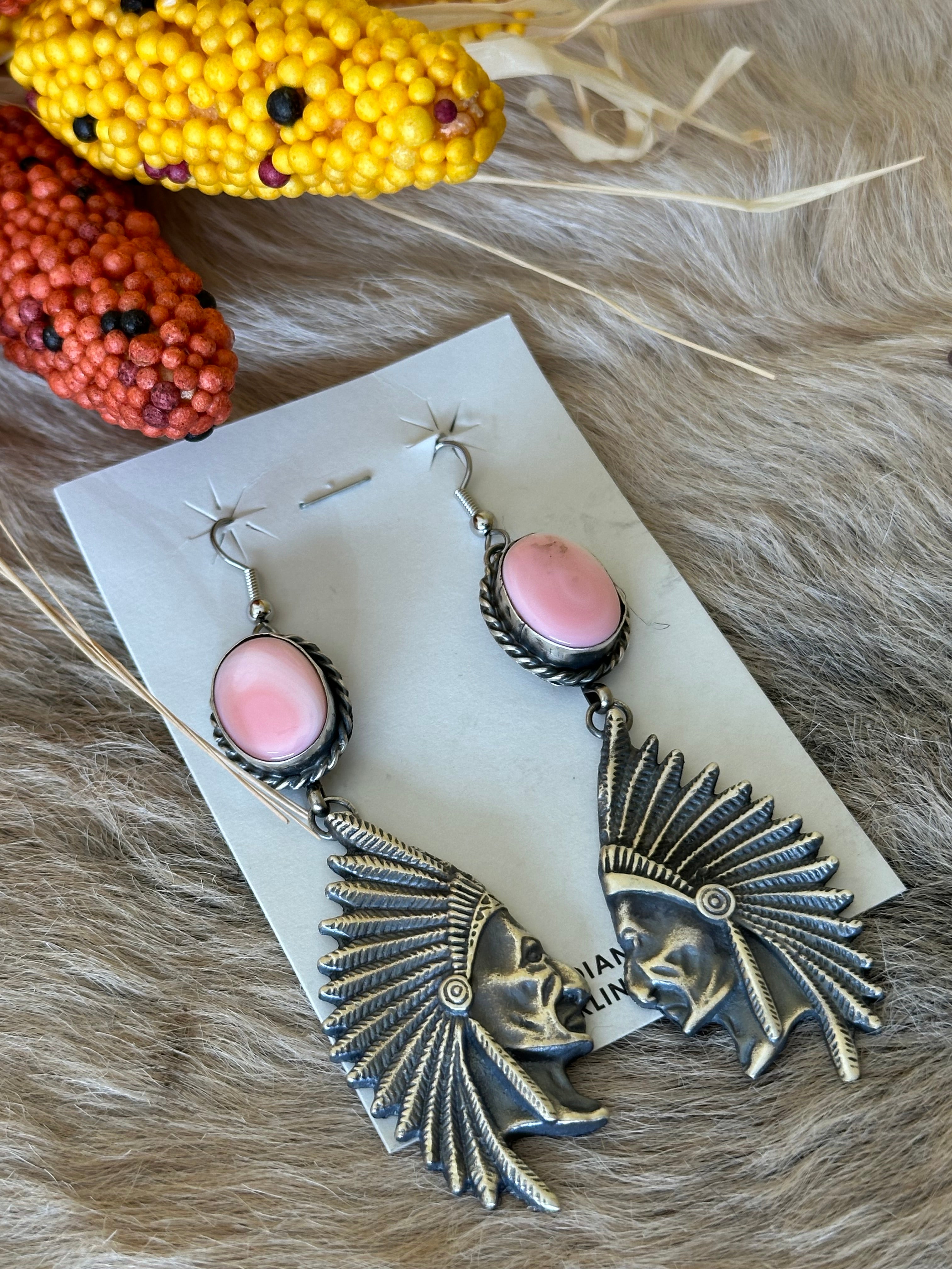 Navajo Handmade Pink Conch & Sterling Silver Dangle Earrings