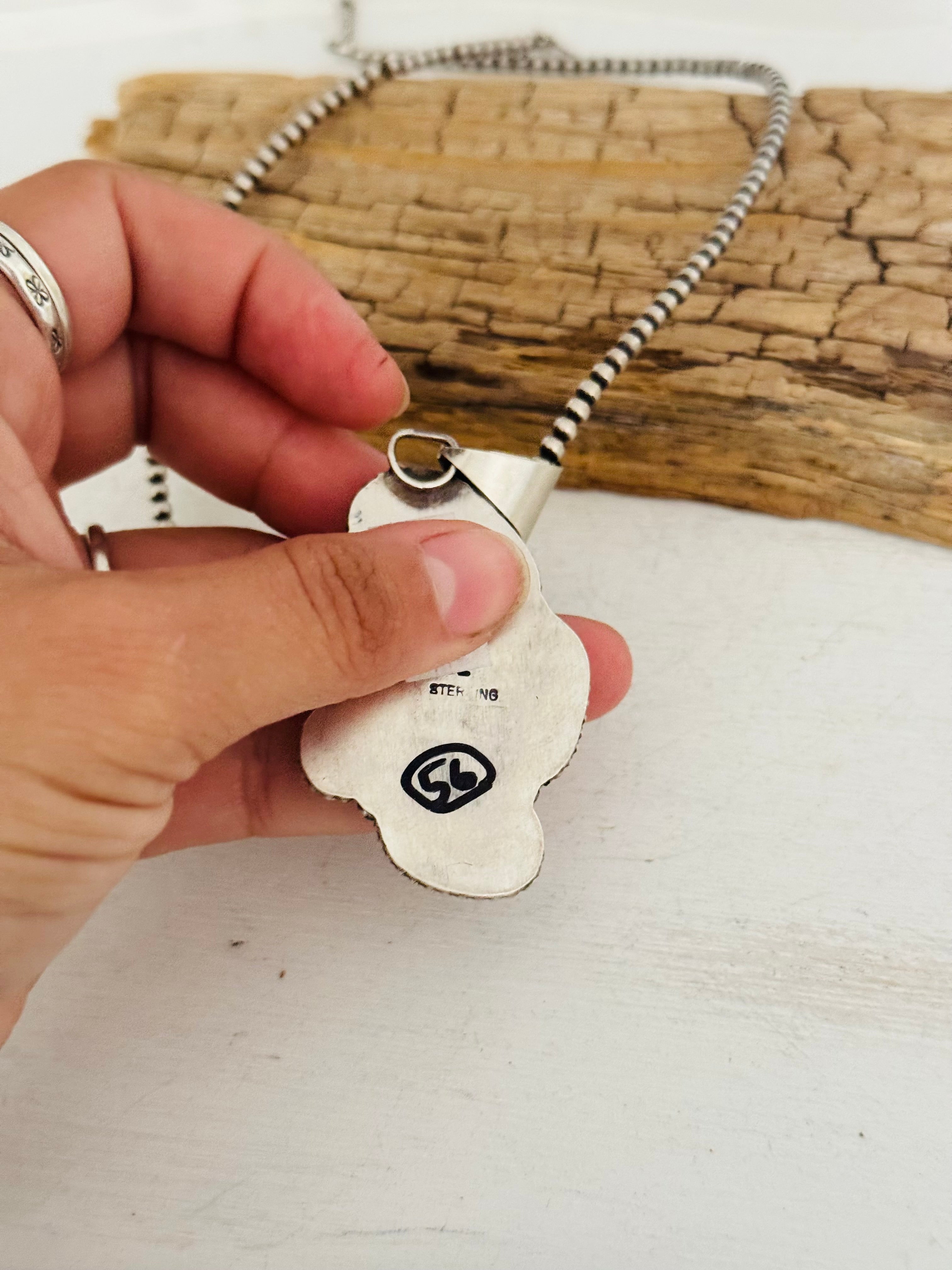 Beautiful pendant. Navajo Handmade Royston Turquoise & Sterling Silver Pendant. It measures 2 3/4 inches long and 1 3/8 inches wide. Pendant Only. Signed by the artist and stamped sterling silver.