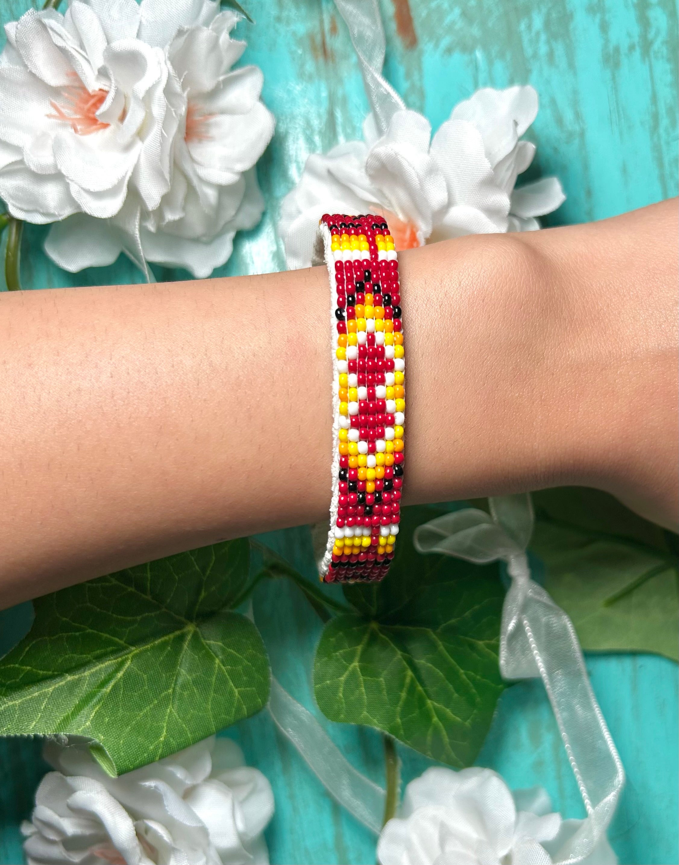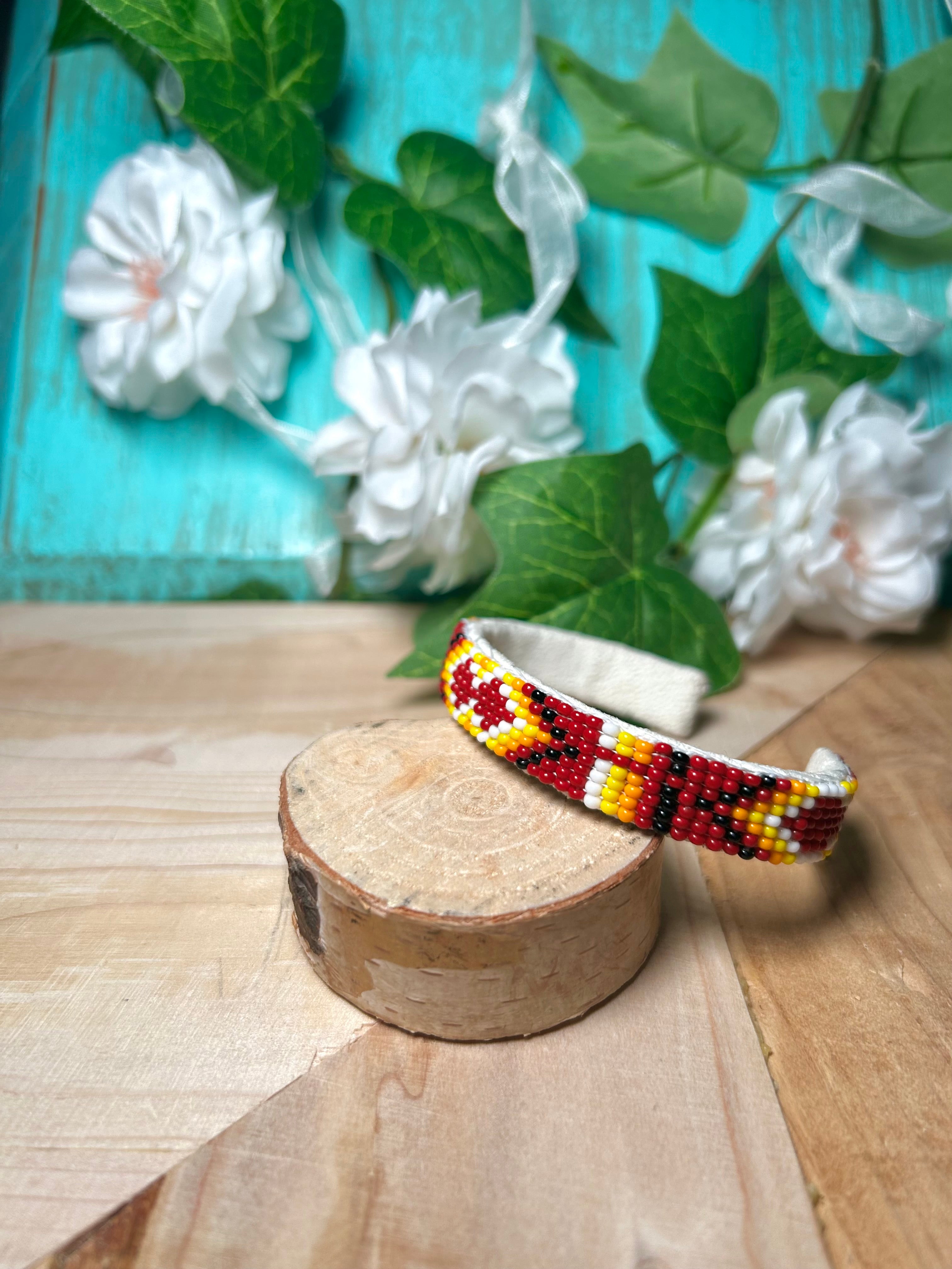 Navajo Made Beaded Cuff Bracelet. It measures 1/2 of an inch wide with an inside circumference of 5 7/8 inches and a gap of 1 1/8 inches. Signed by artist and stamped sterling silver.