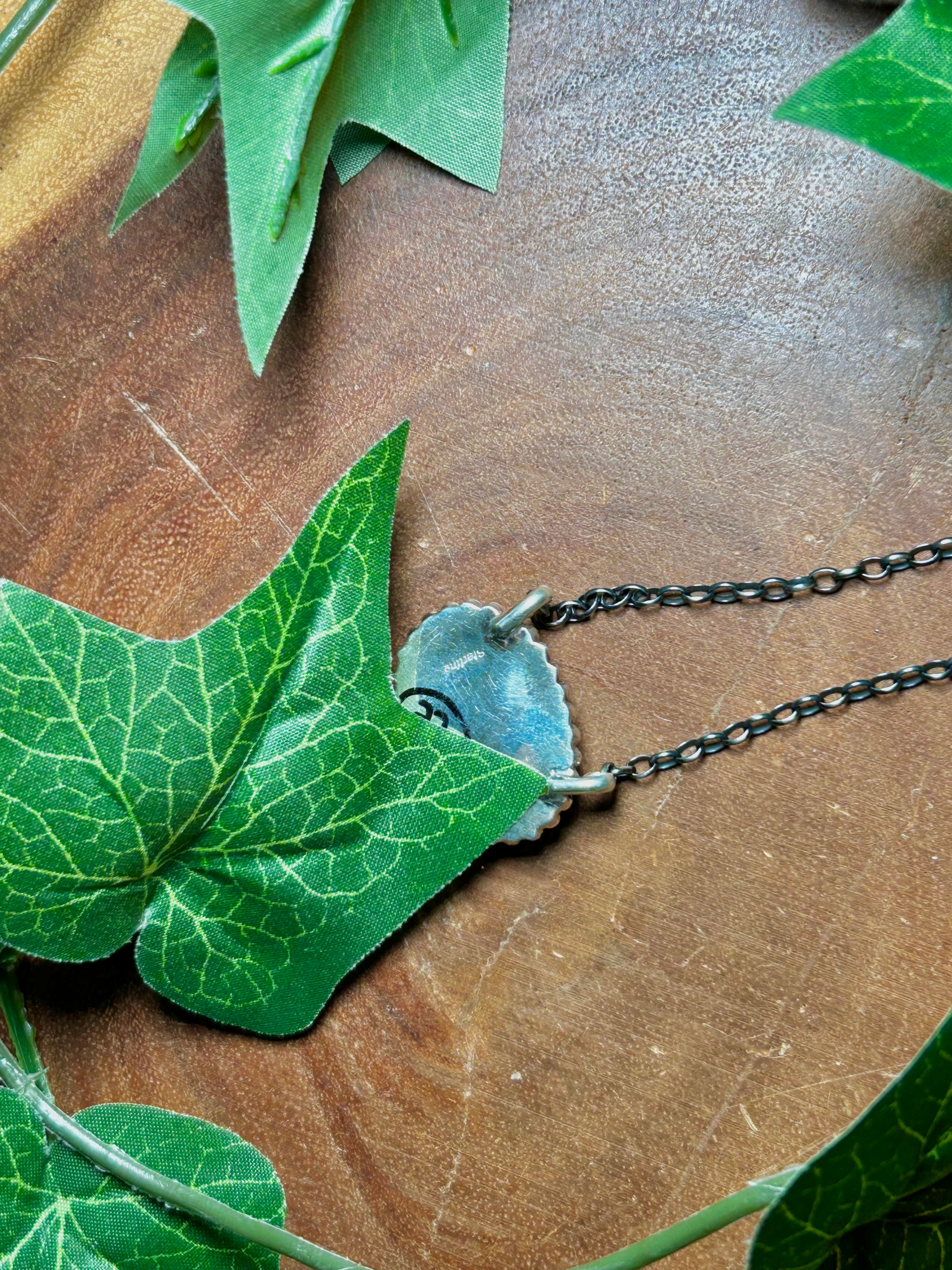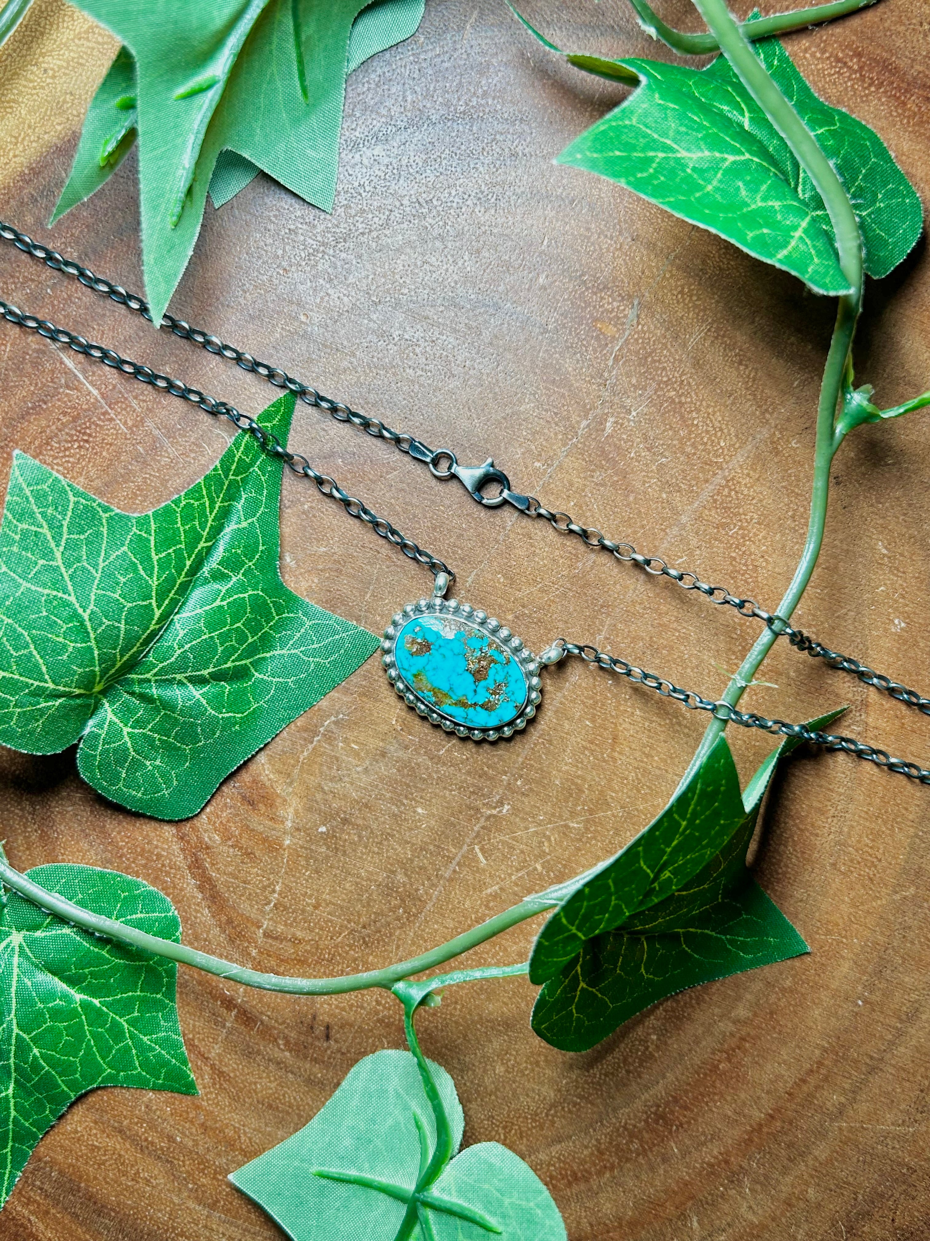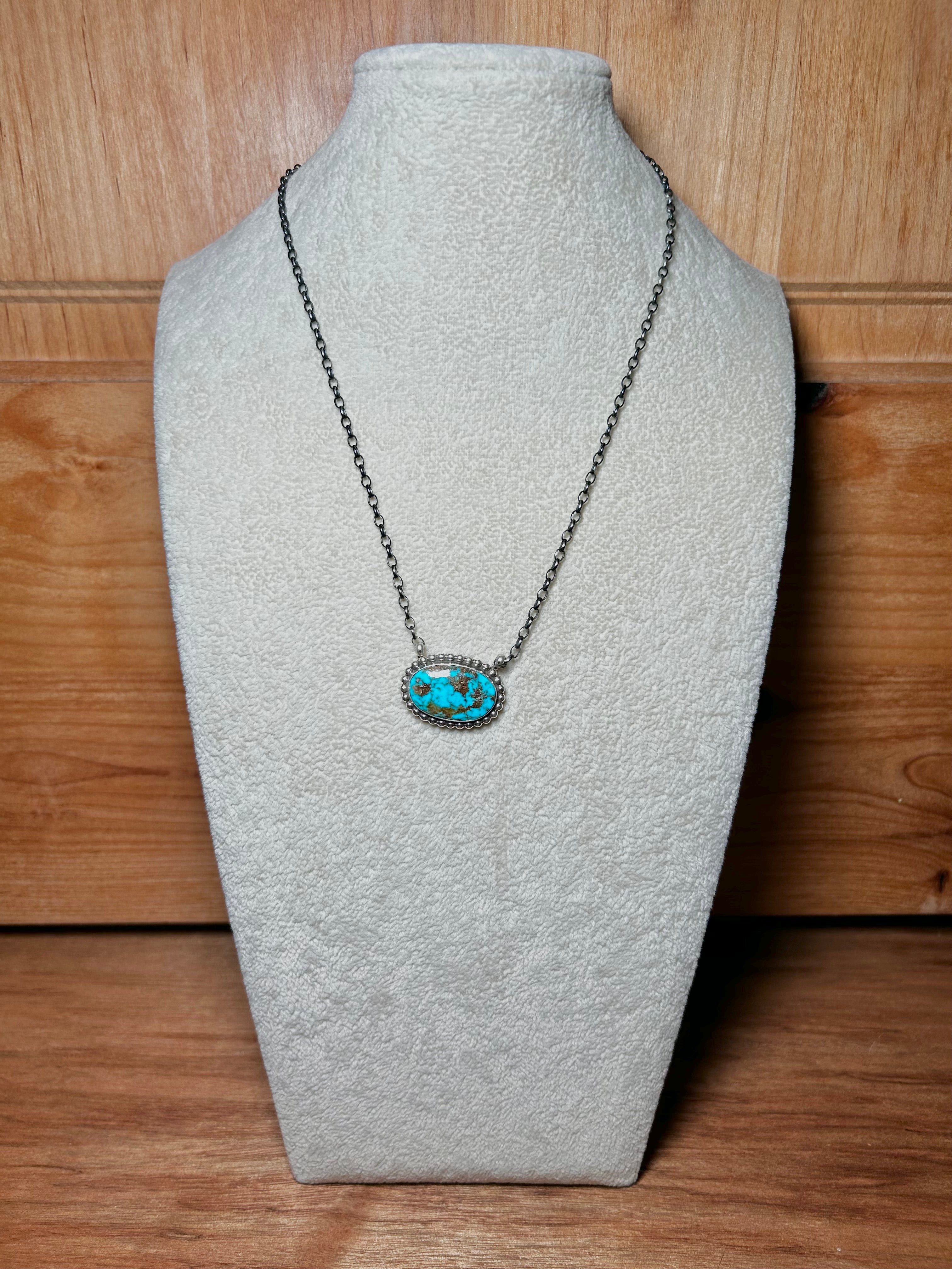 Navajo Made Birds Eye Kingman Turquoise & Sterling Silver Necklace. It measures 19 inches long with hang while the chain by itself measures 17 1/2 inches long. Signed by the artist and stamped sterling silver.