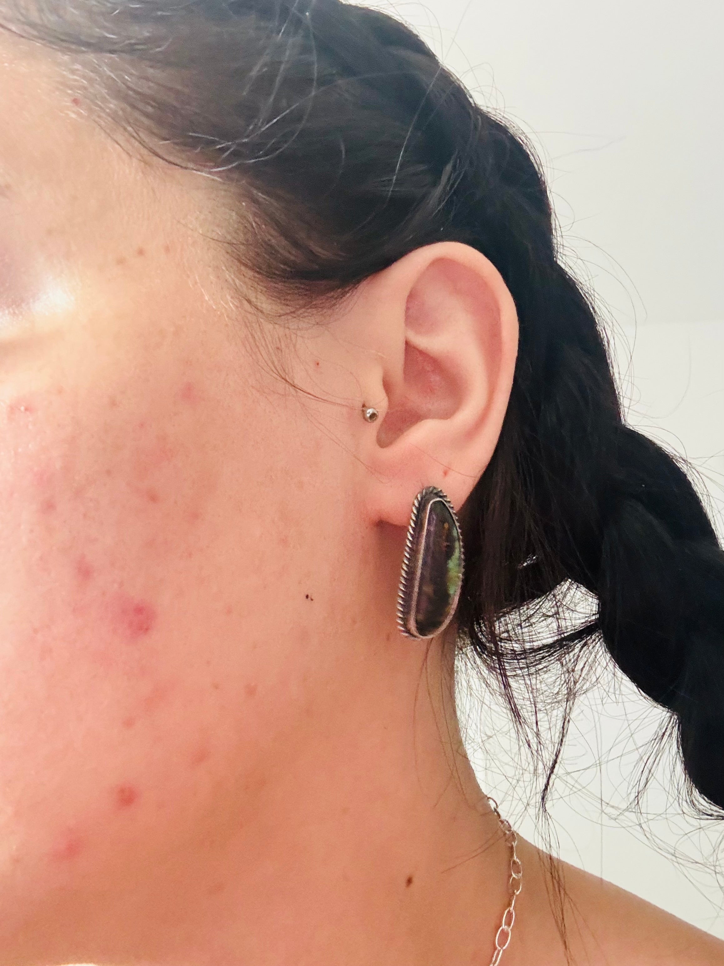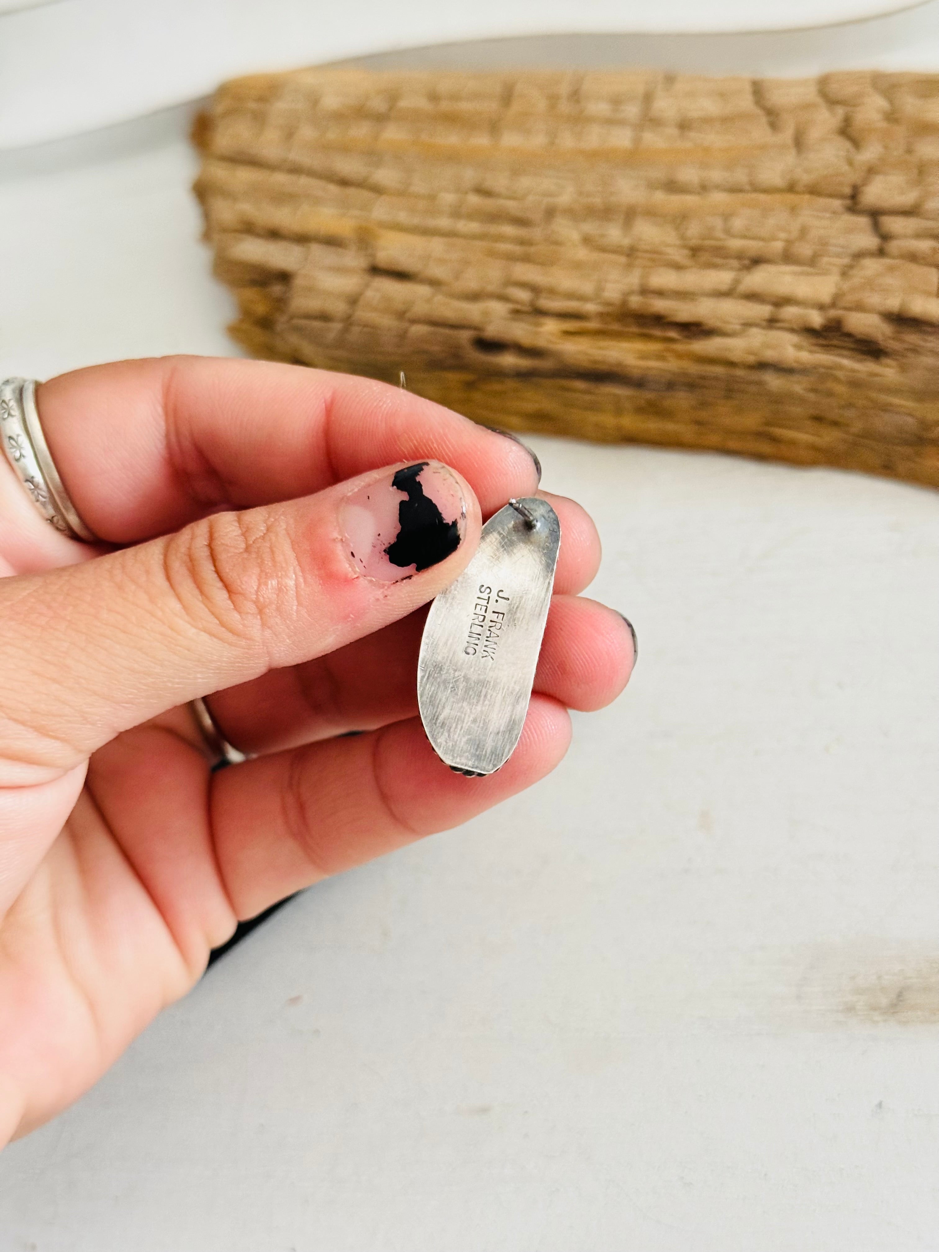 Navajo Made Black Jack Turquoise & Sterling Silver Post Earrings. They measure just over 1 1/8 inches long and 1/2 of an inch wide. Signed by the artist and stamped sterling silver.