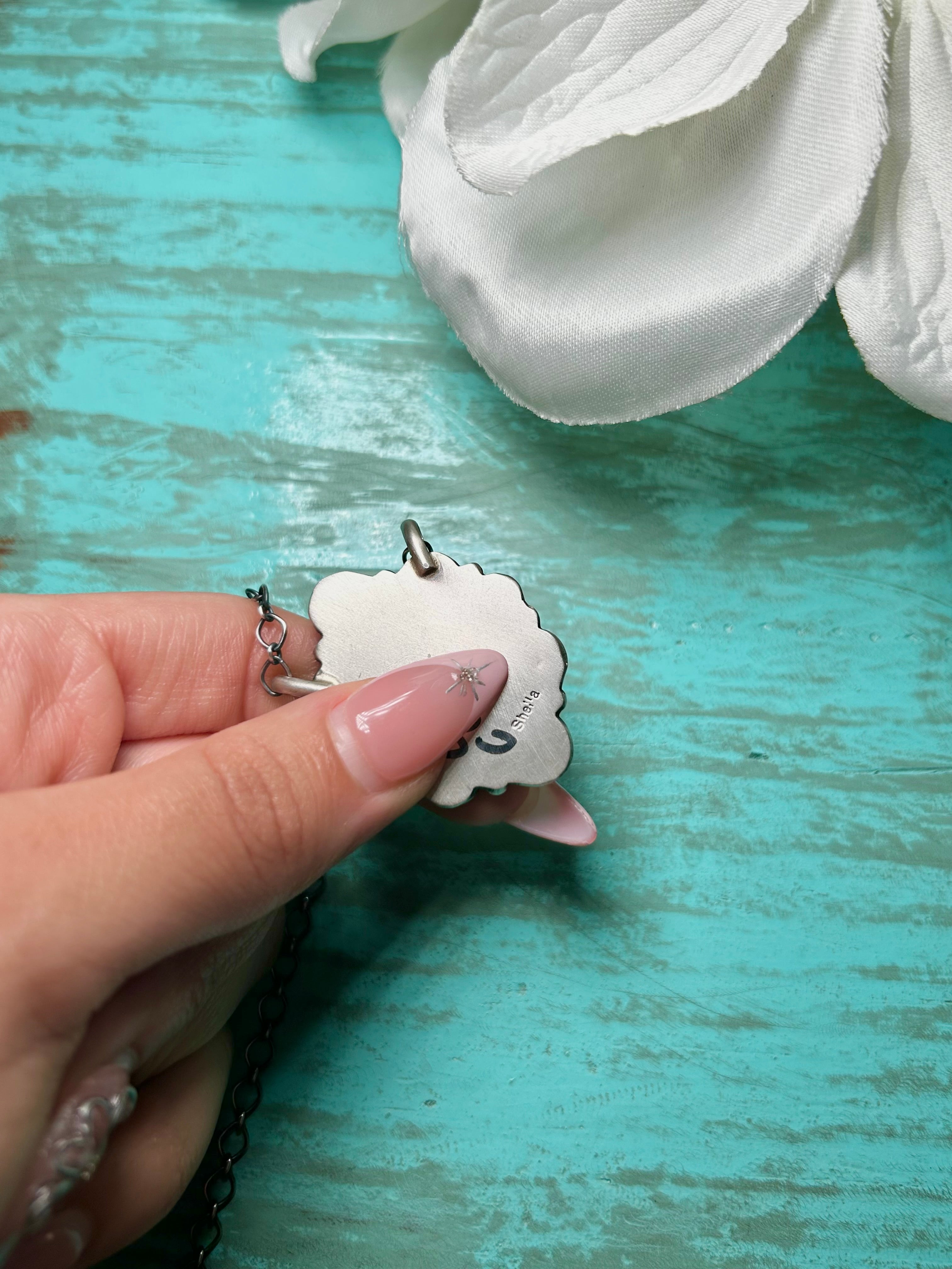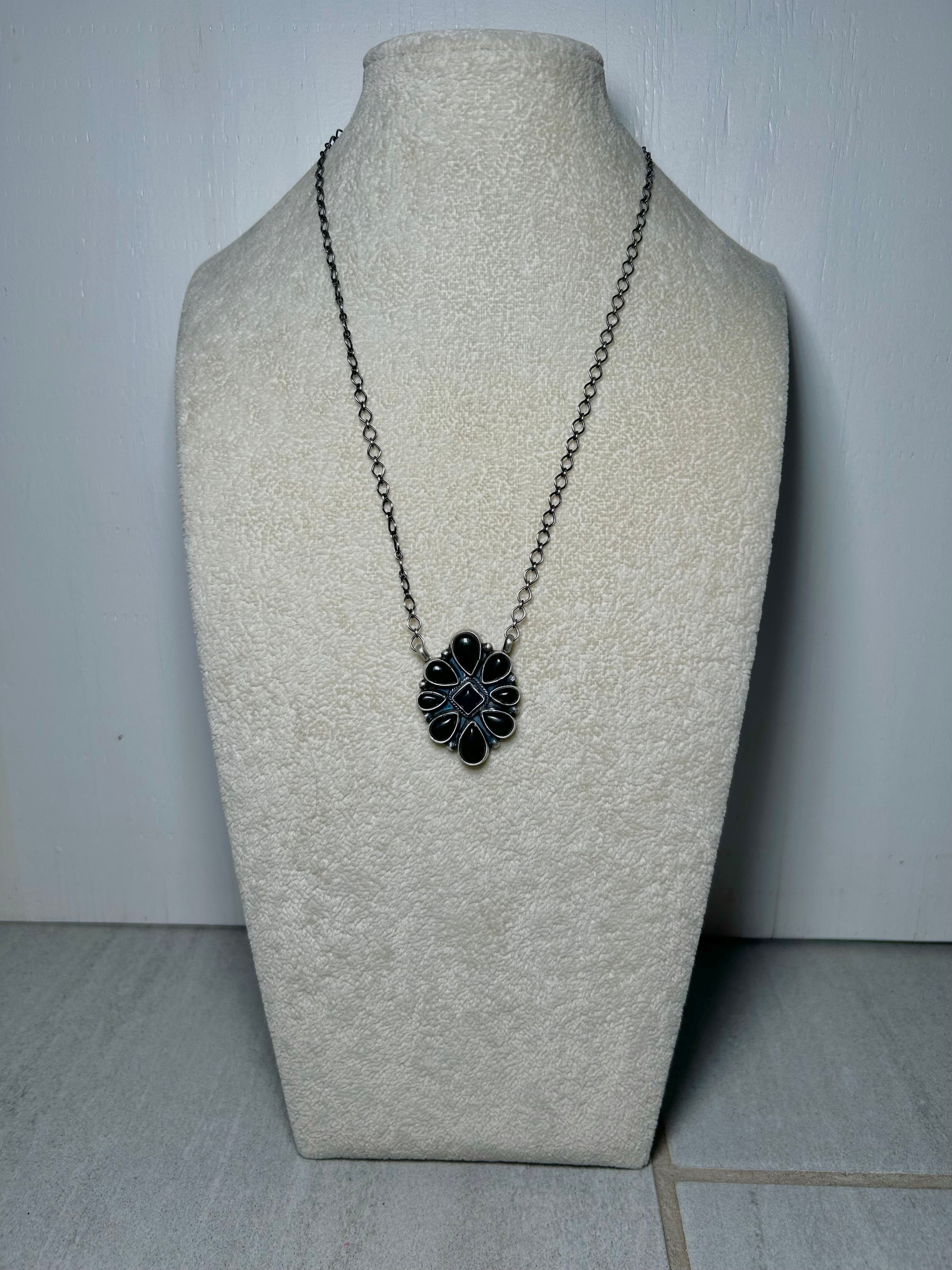 Navajo Made Onyx & Sterling Sliver Necklace. It measures 21 inches long while the chain measure 18 inches long. Signed by the artist and stamped sterling silver.