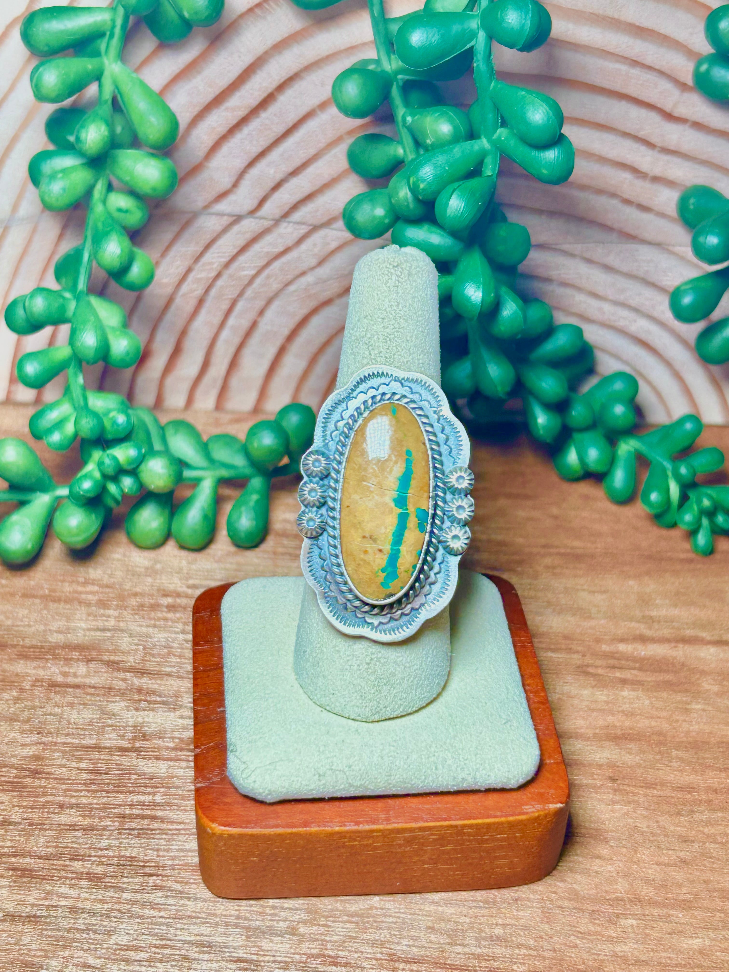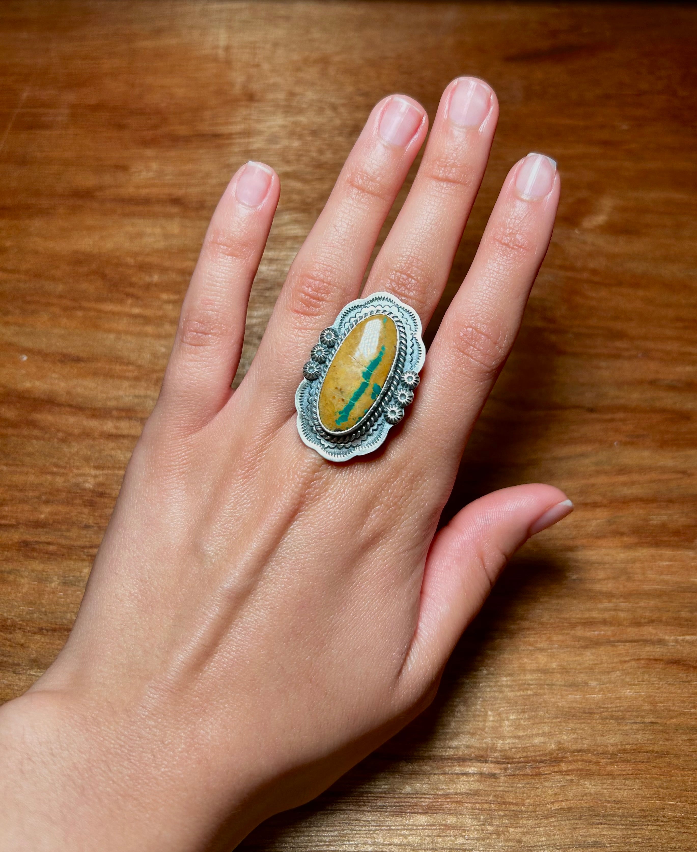 Navajo Made Bonlder Turquoise & Sterling Silver Adjustable Ring. It measures 1 1/2 inches long and just over 7/8 of an inch wide. Signed by the artist and stamped sterling silver.