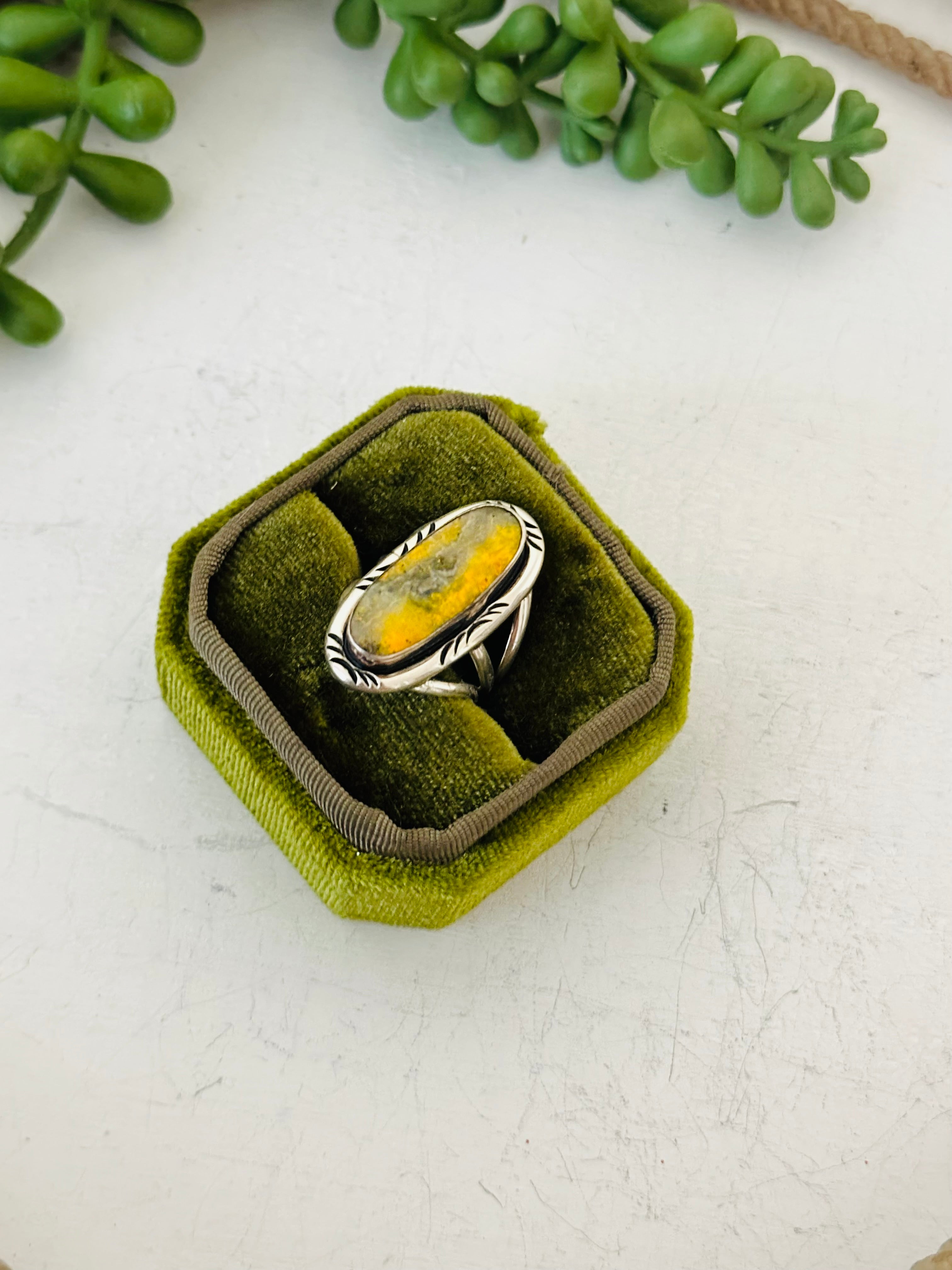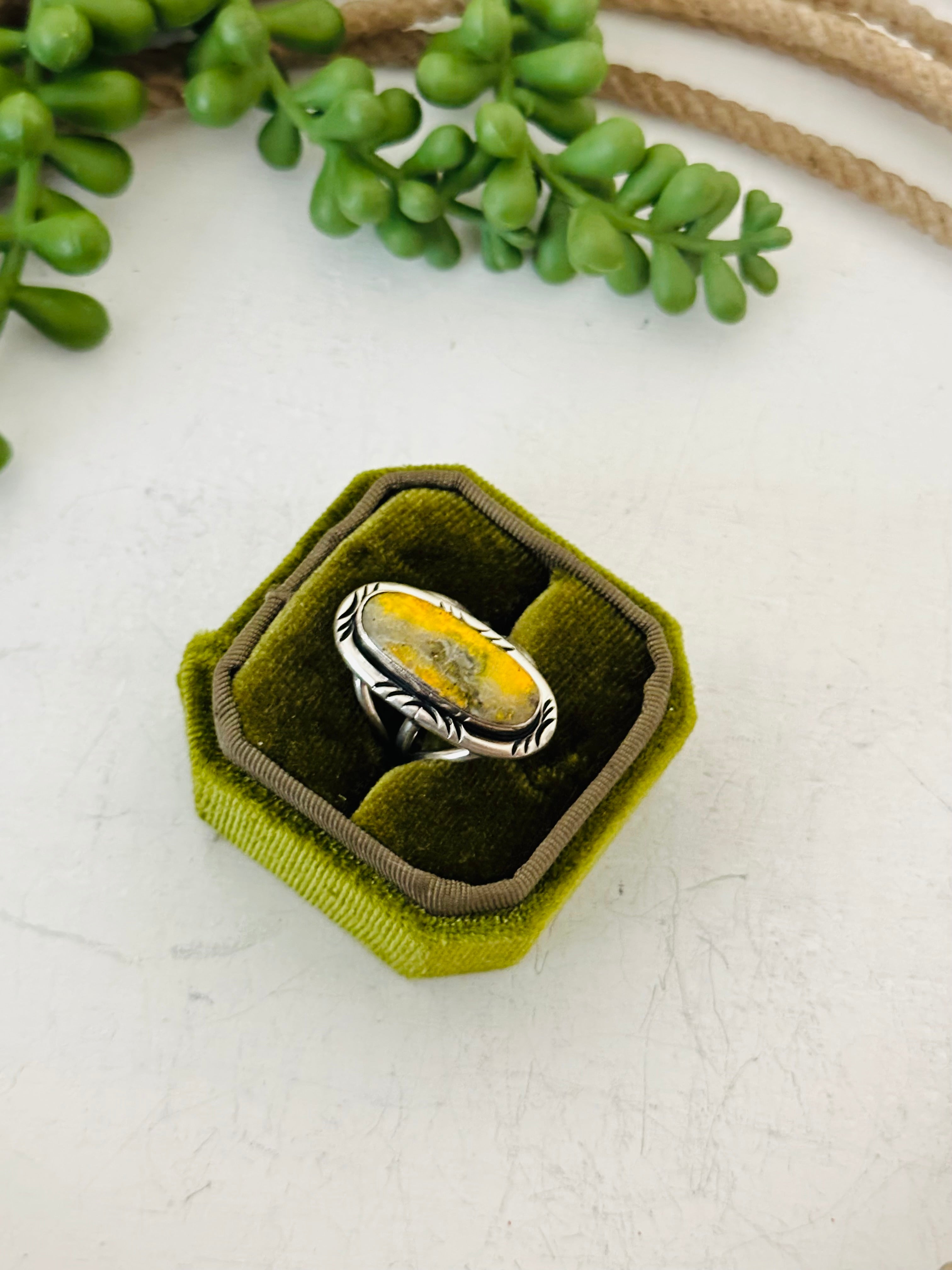 Navajo Made Bb Agate & Sterling Silver Ring Size 5.75. It measures 1 1/8 inches long and 1/2 of an inch wide. Signed by artist and stamped sterling silver.