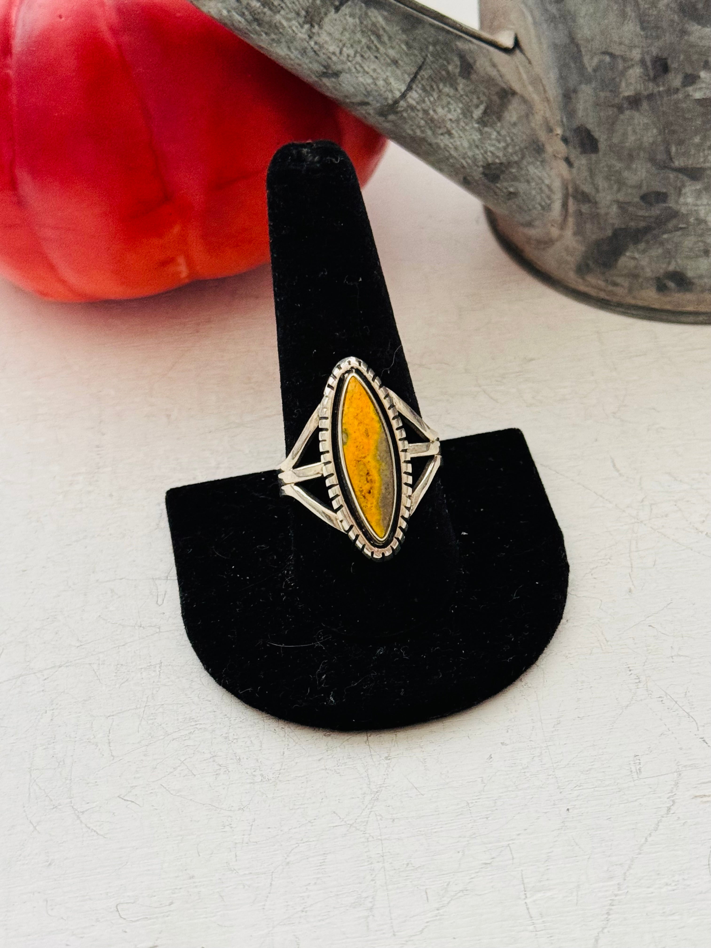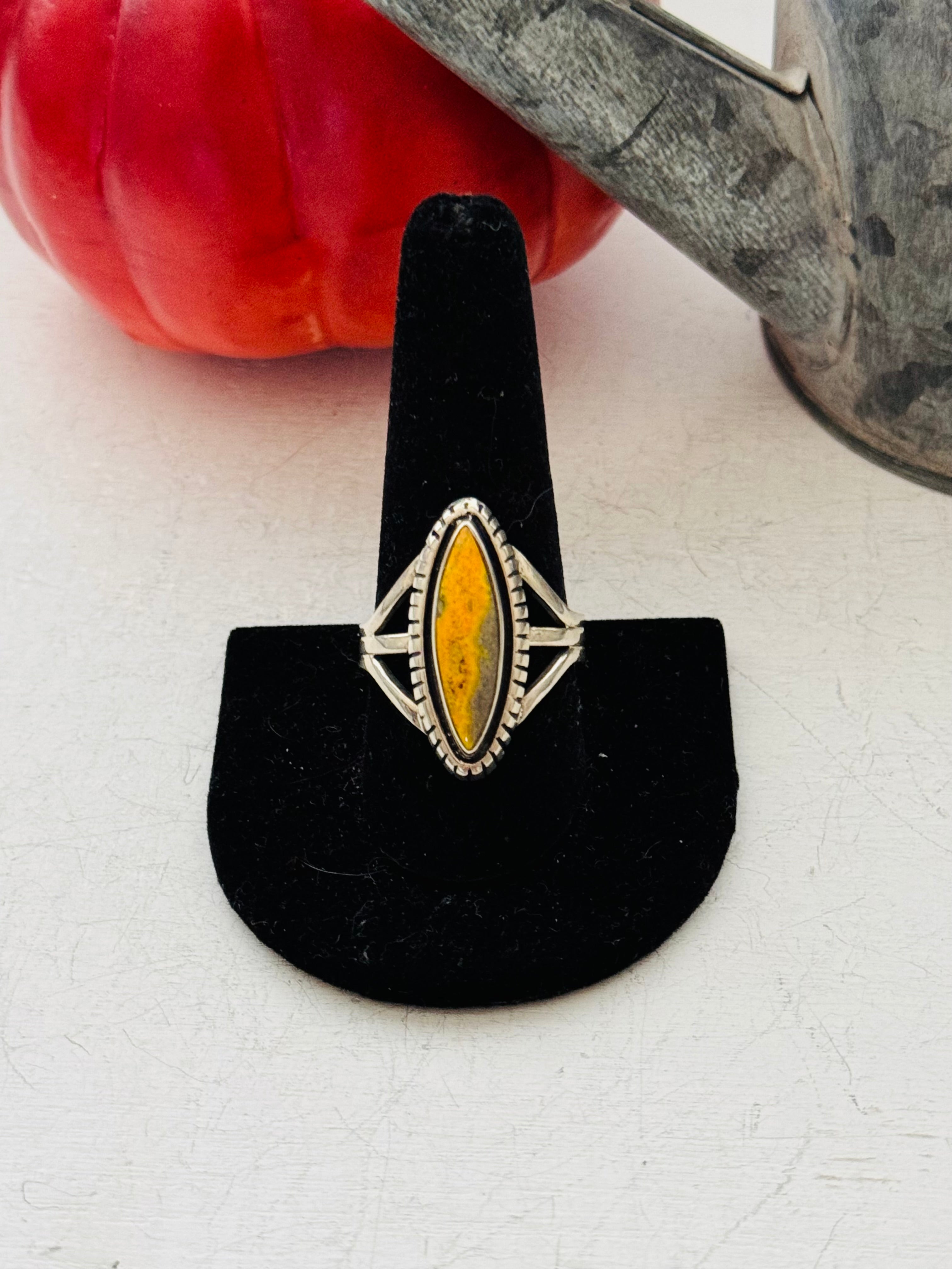 Navajo Made BB Agate & Sterling Silver Ring Size 10.5. It measures 1 1/8 inches long. Signed by artist and stamped sterling silver.