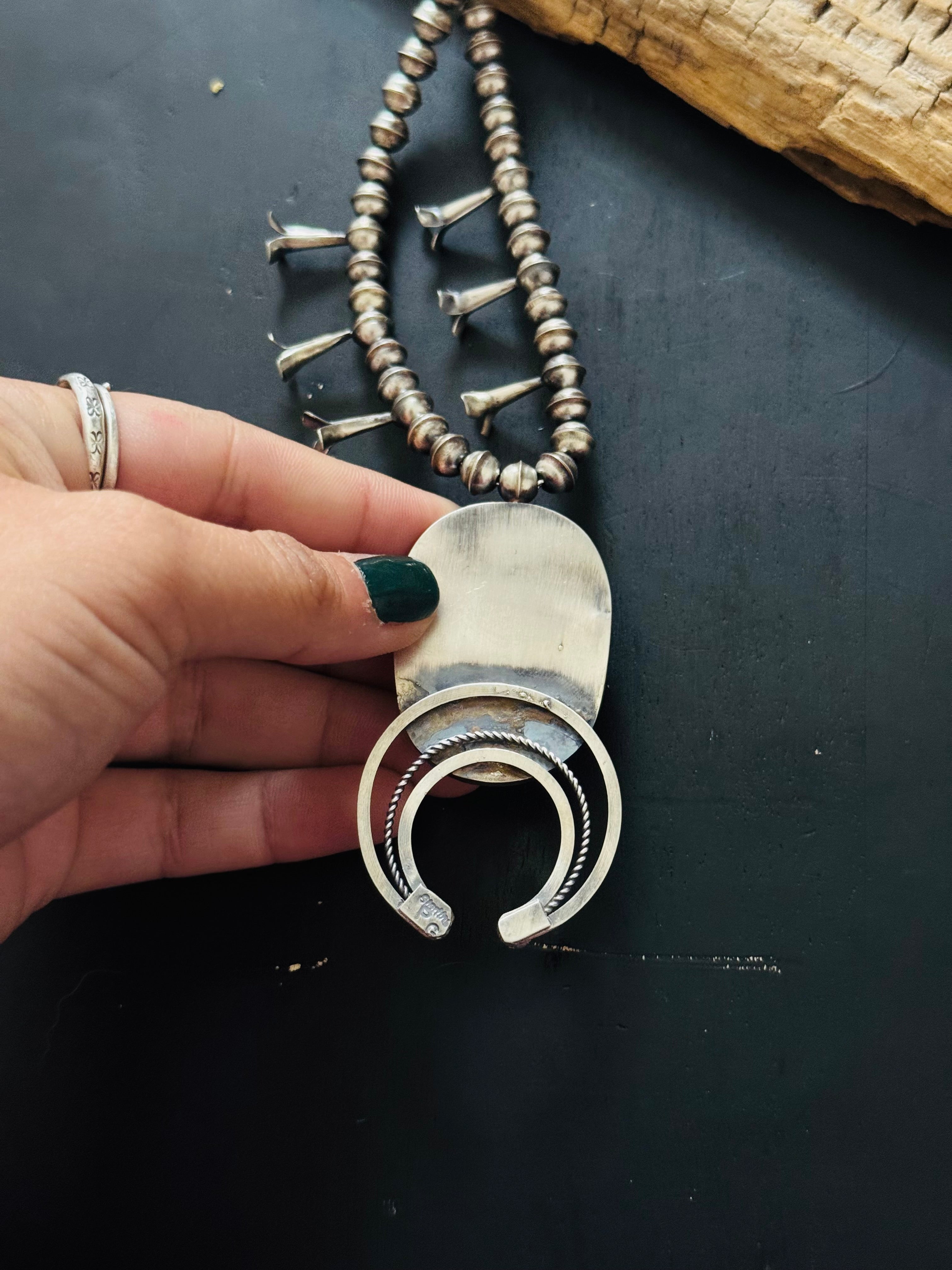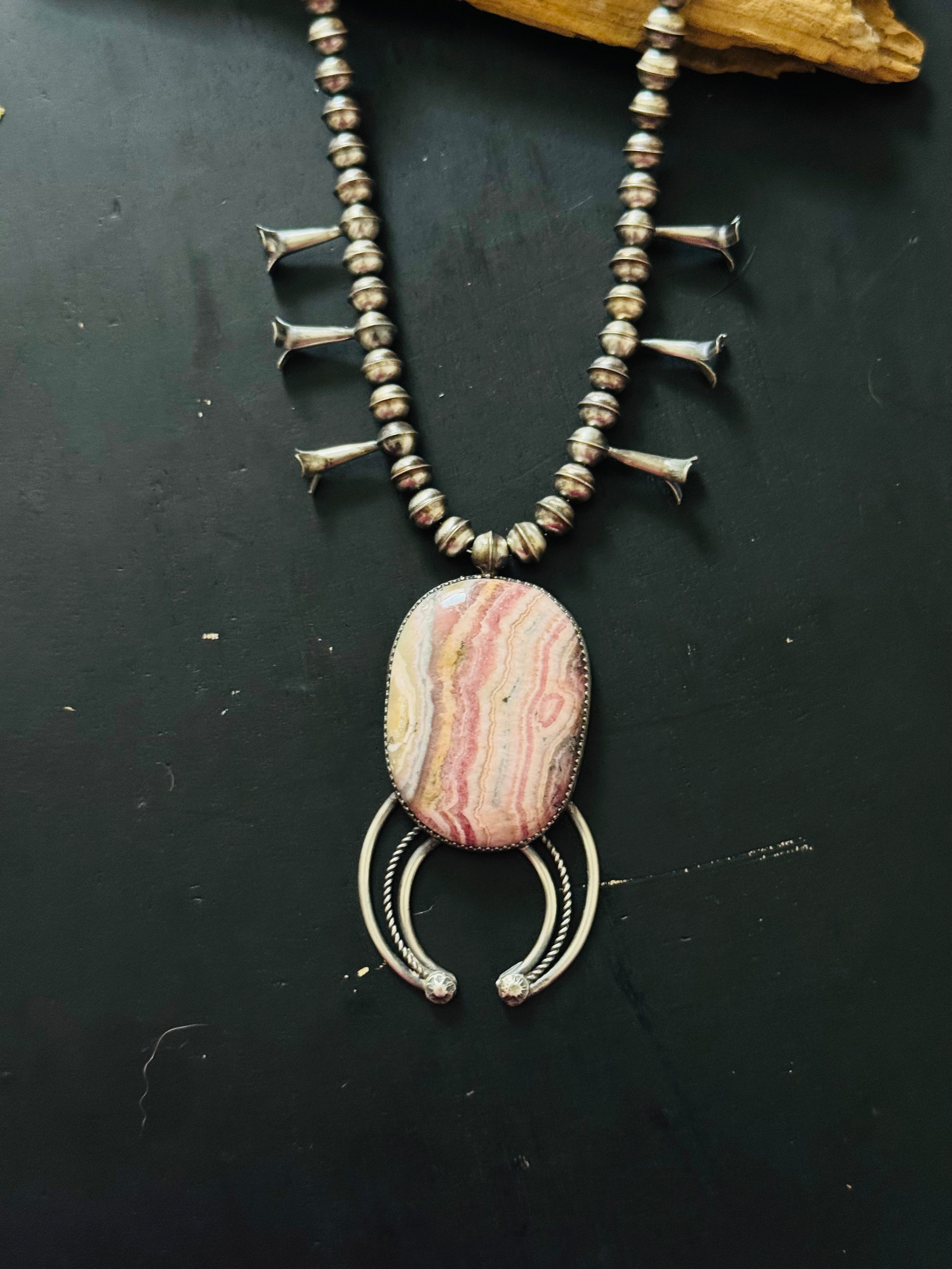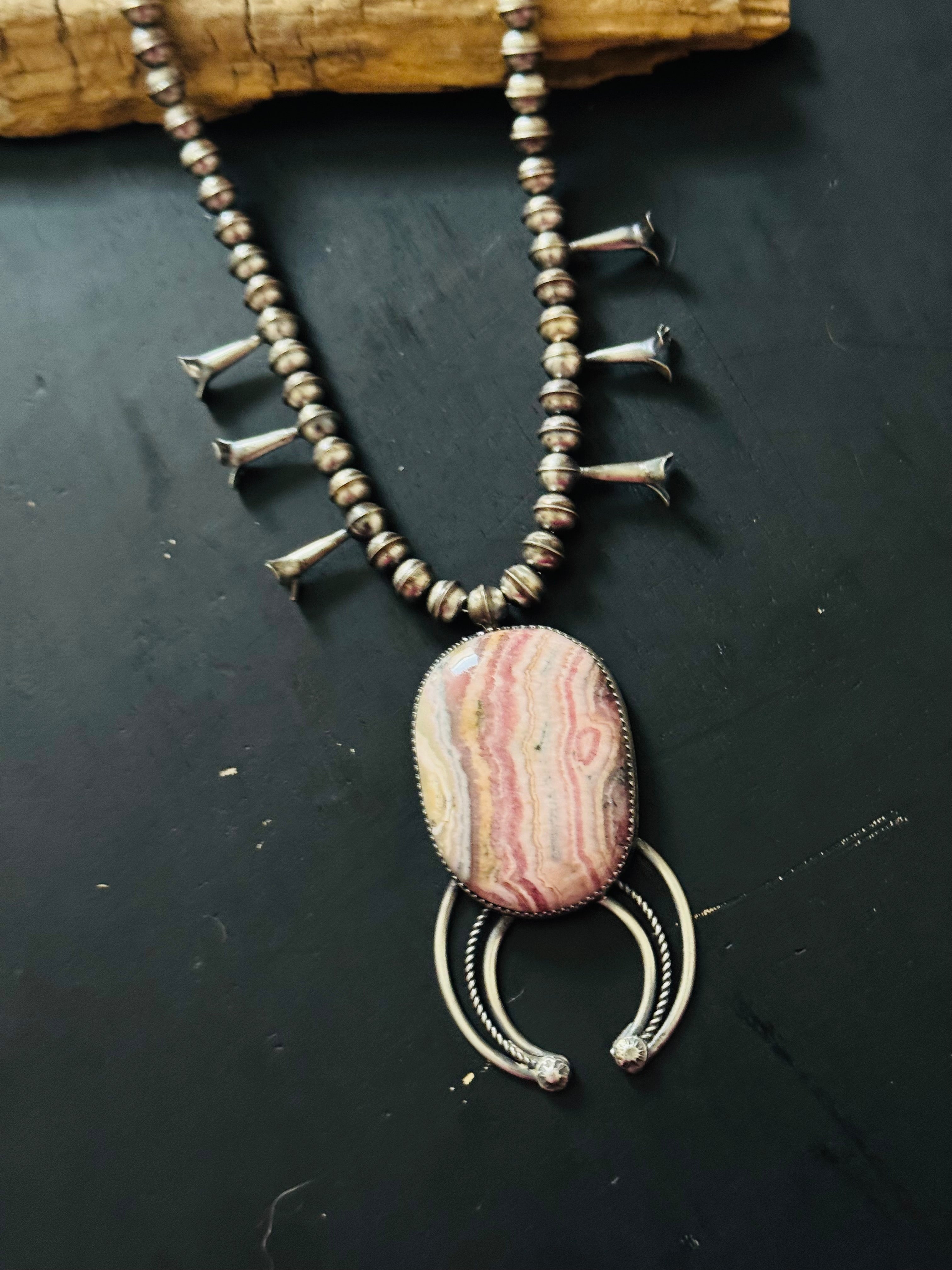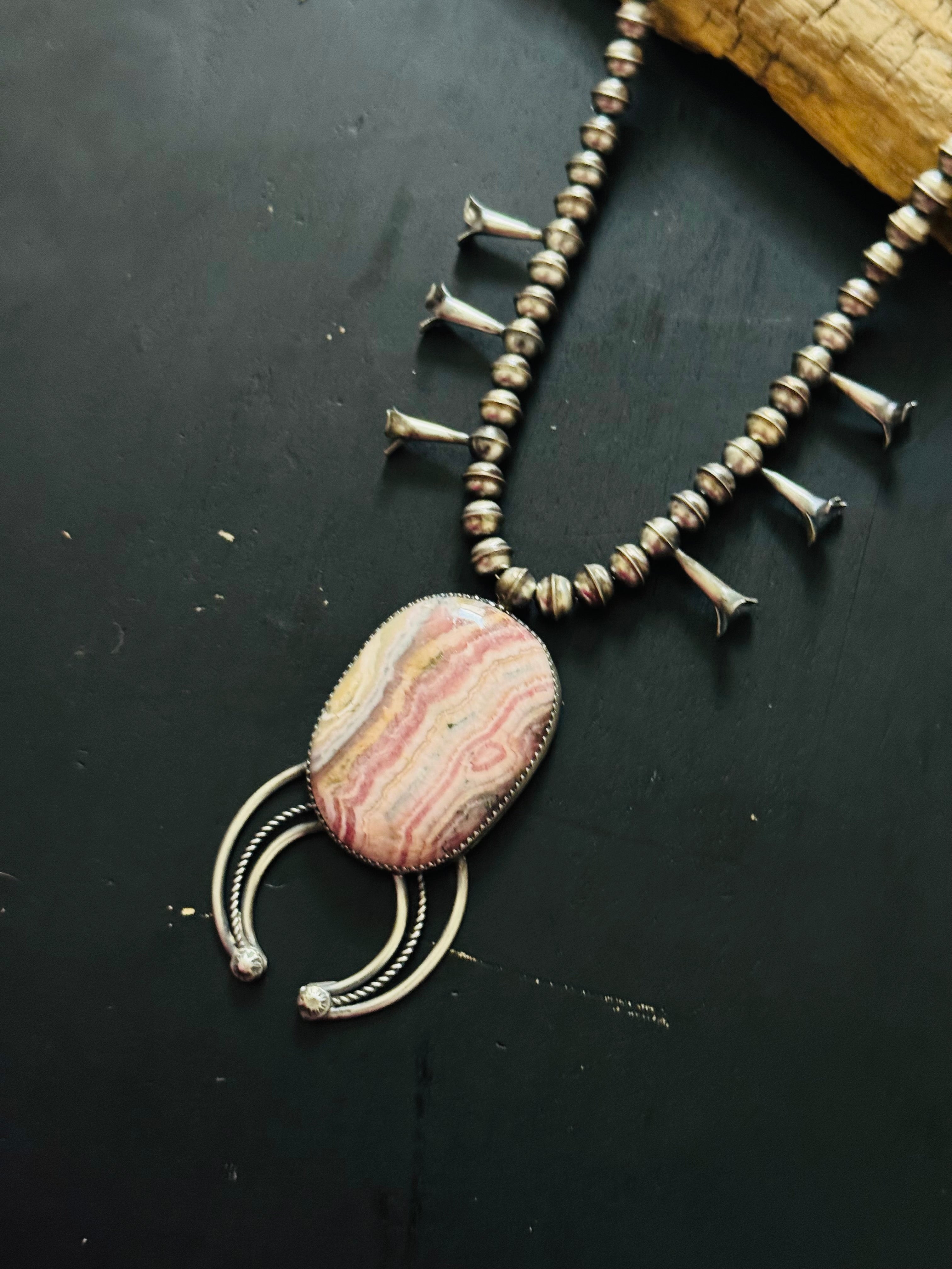 Navajo Made Rhodochrosite & Sterling Silver Squash Blossom Necklace