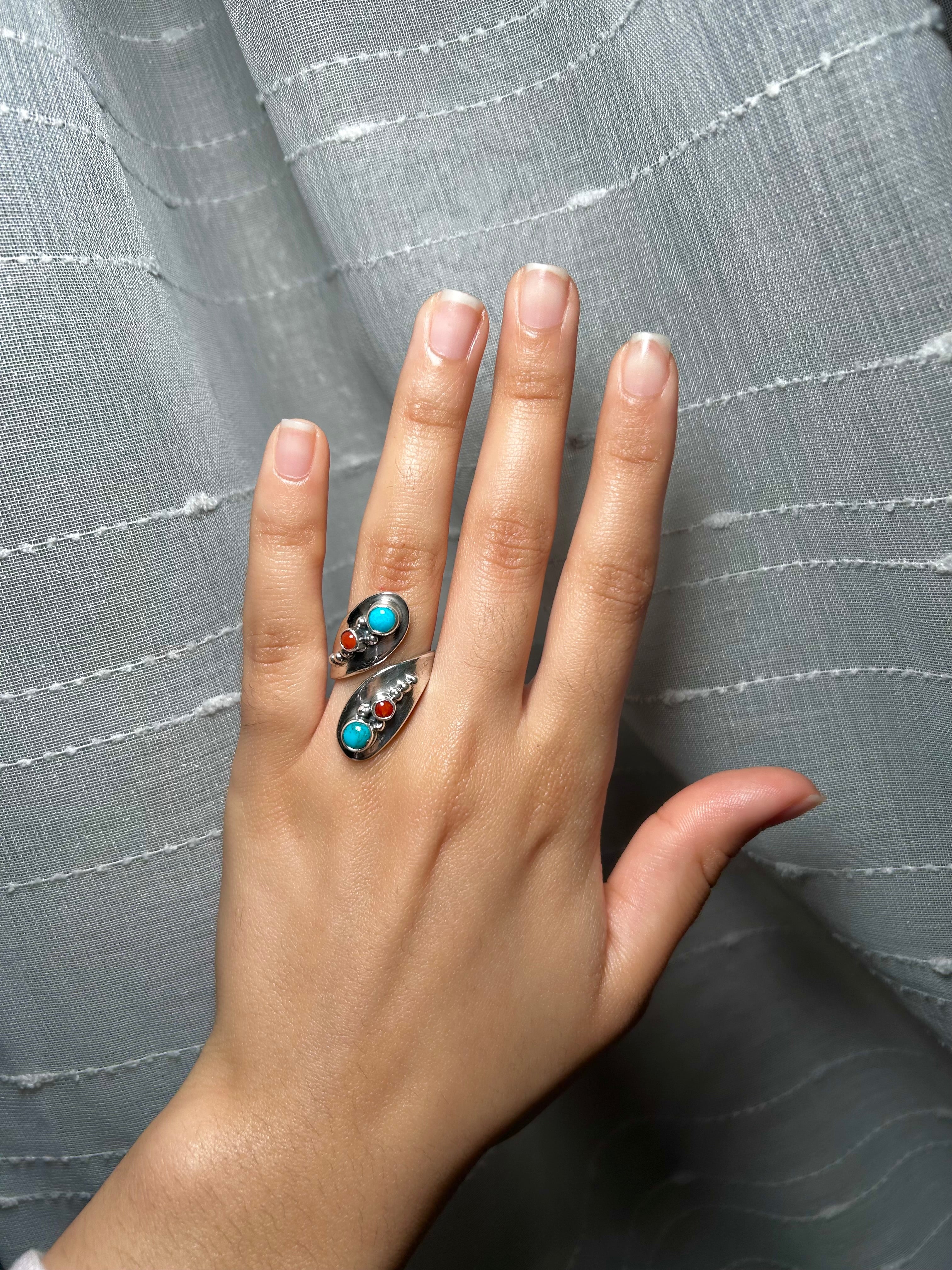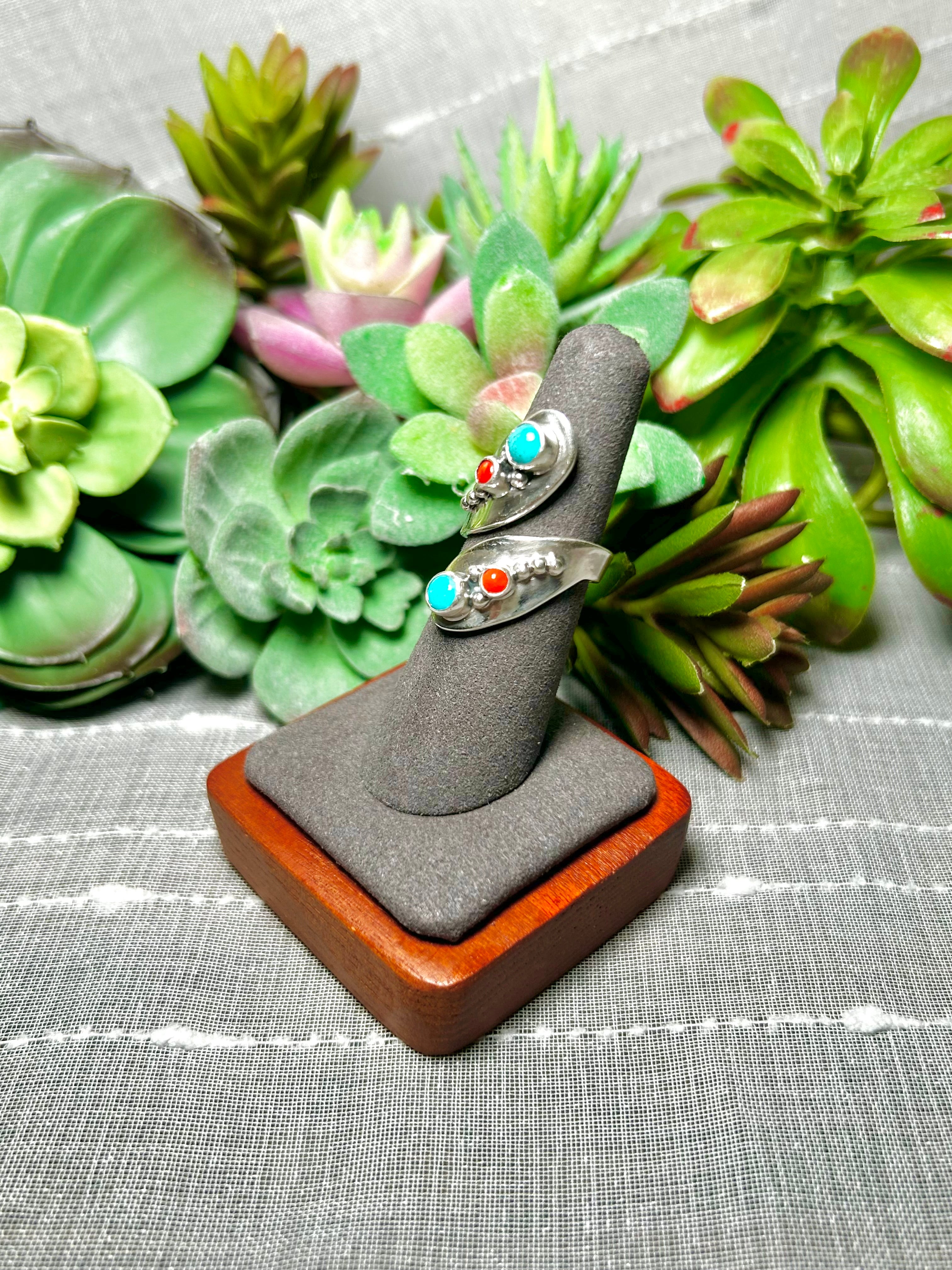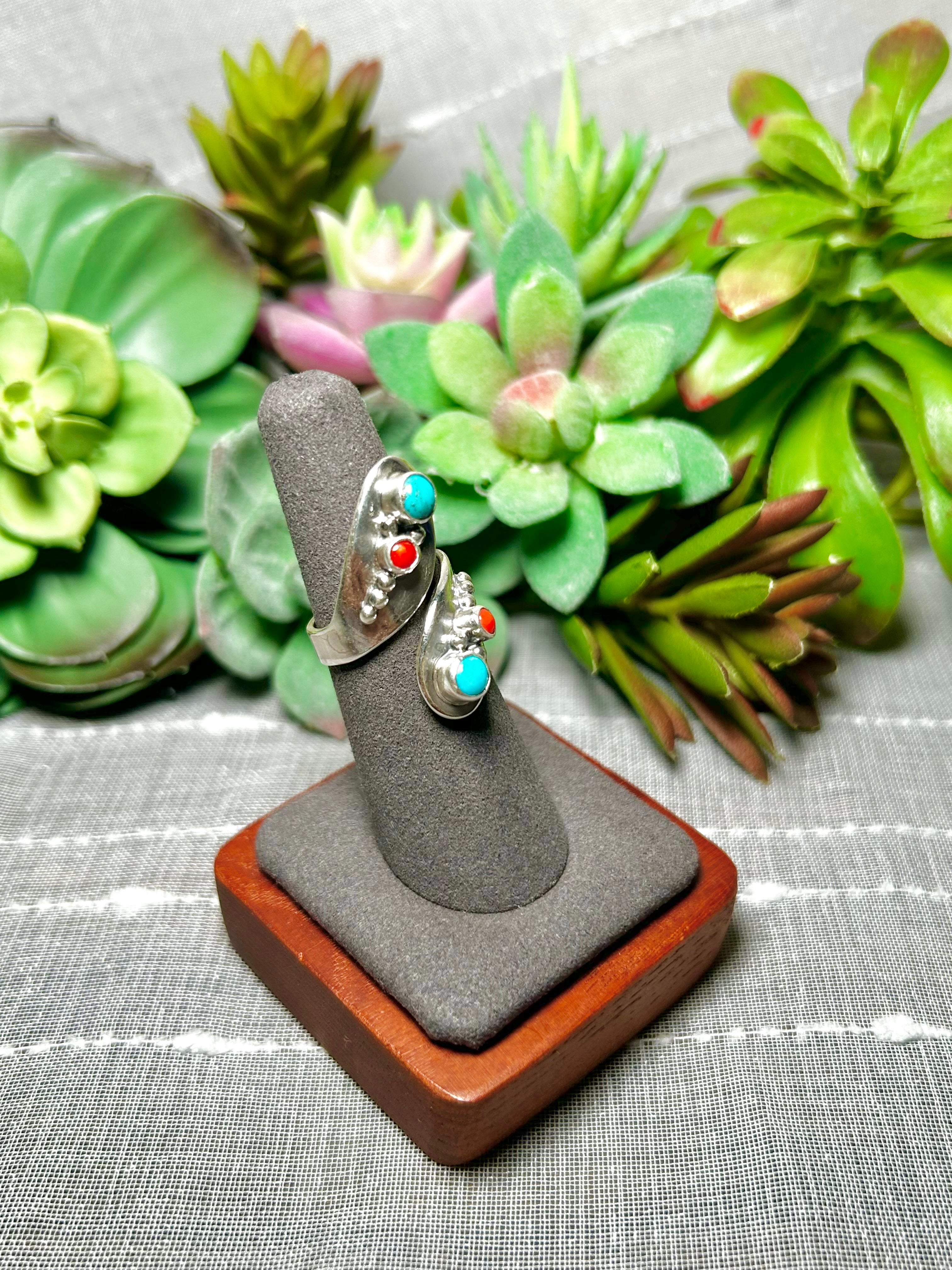Navajo Made Multi Stone & Sterling Silver Adjustable Ring. It measures 1 1/2 inches long and 3/4 of an inch wide. Signed by the artist and stamped sterling silver.