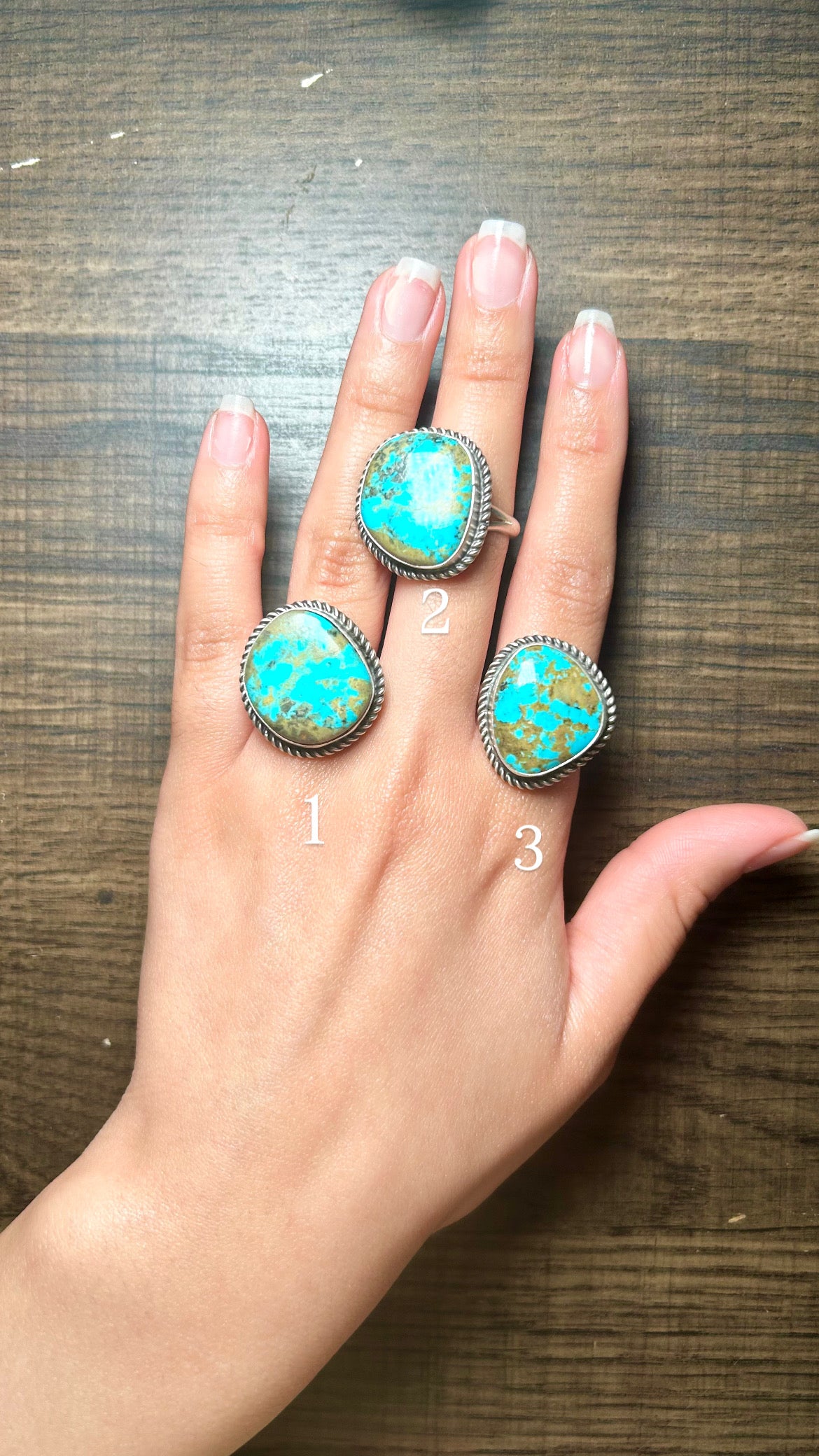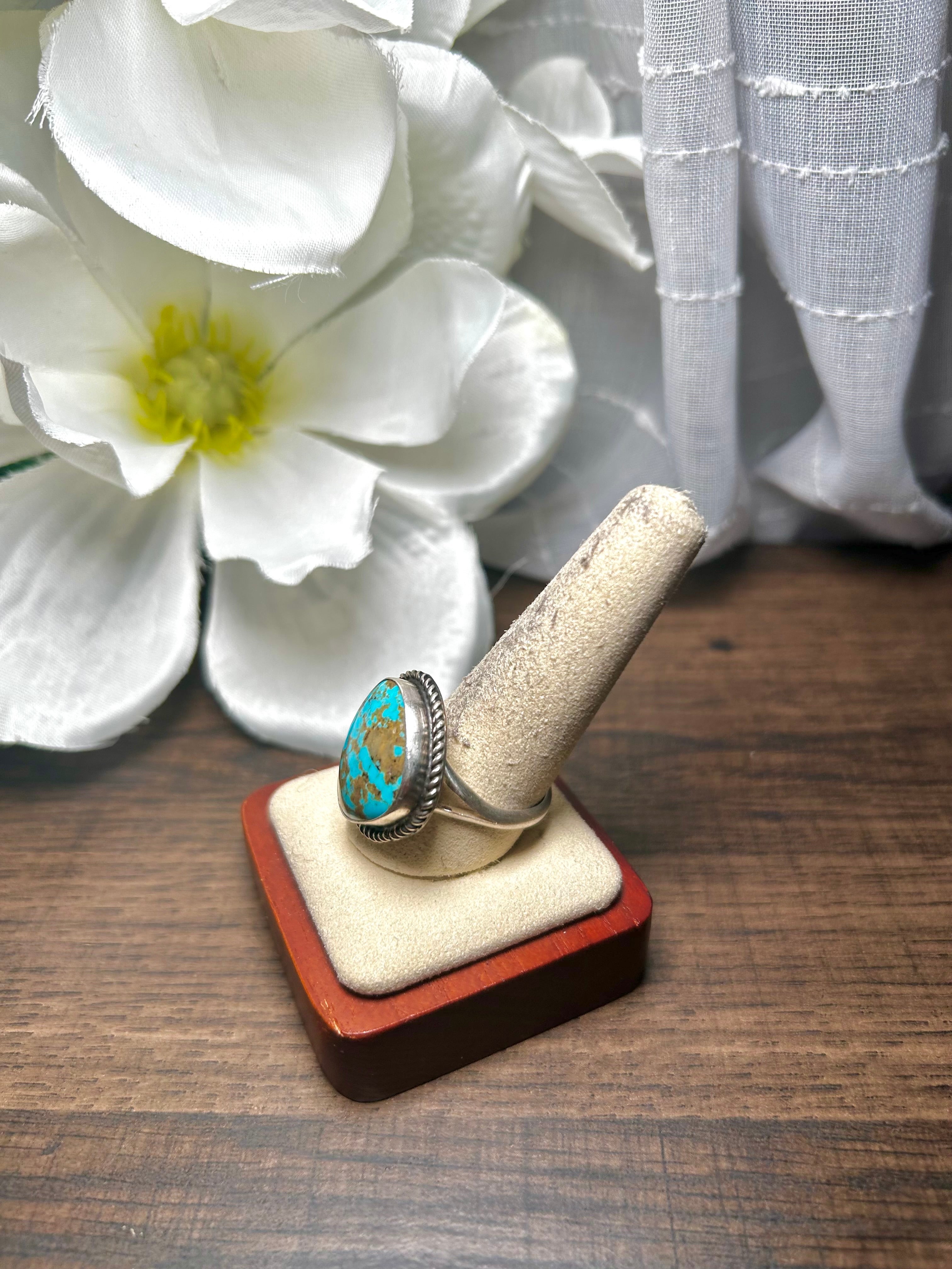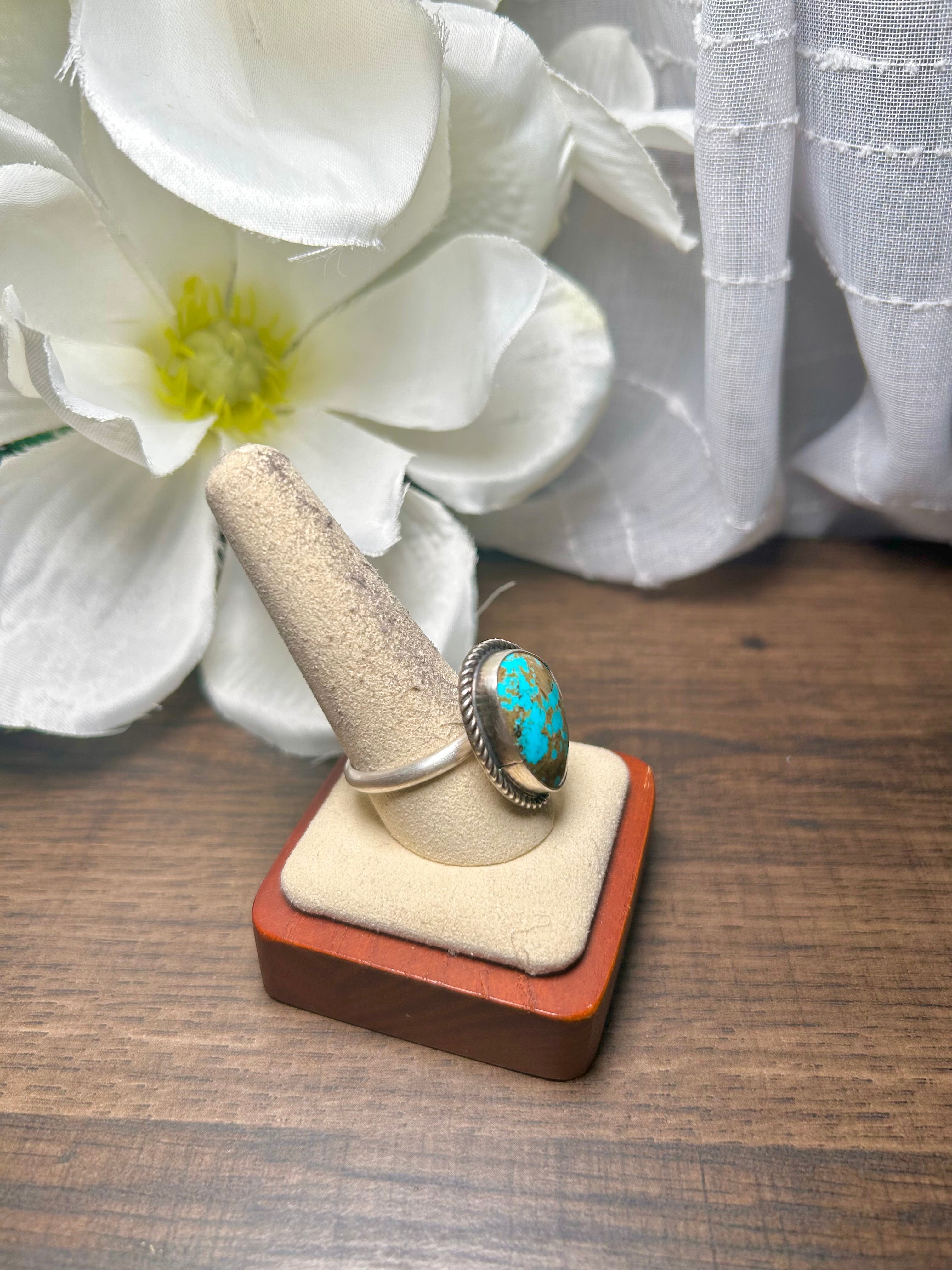 Donovan Nez Kingman Turquoise & Sterling Silver Adjustable Ring. It measures 1 inch long and 7/8 of an inch wide. Signed by artist and stamped sterling silver.