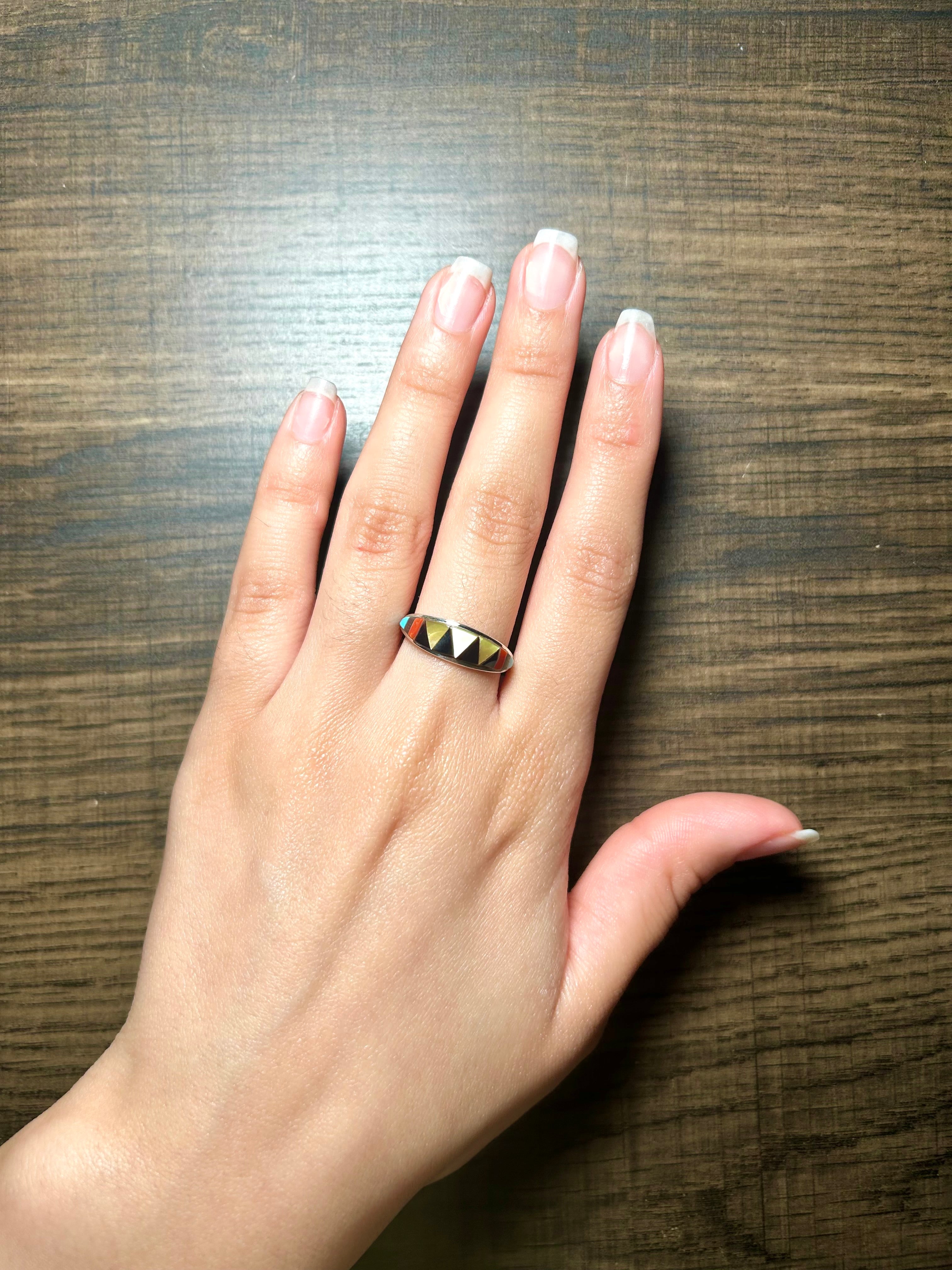 Zuni Made Multi Stone & Sterling Silver Ring Size 7.75.It measures 1/4 of an inch long. Signed by artist and stamped sterling silver.