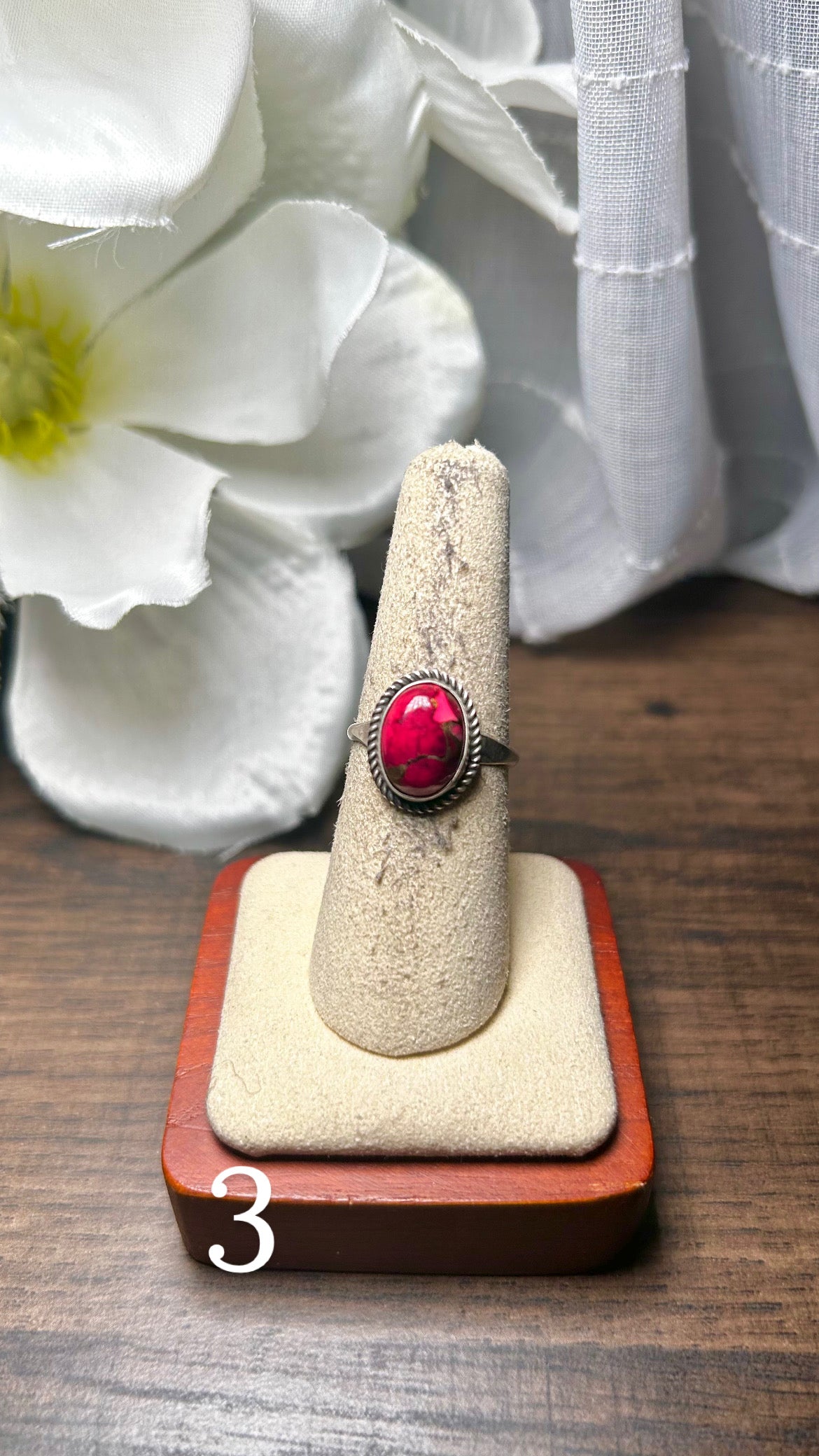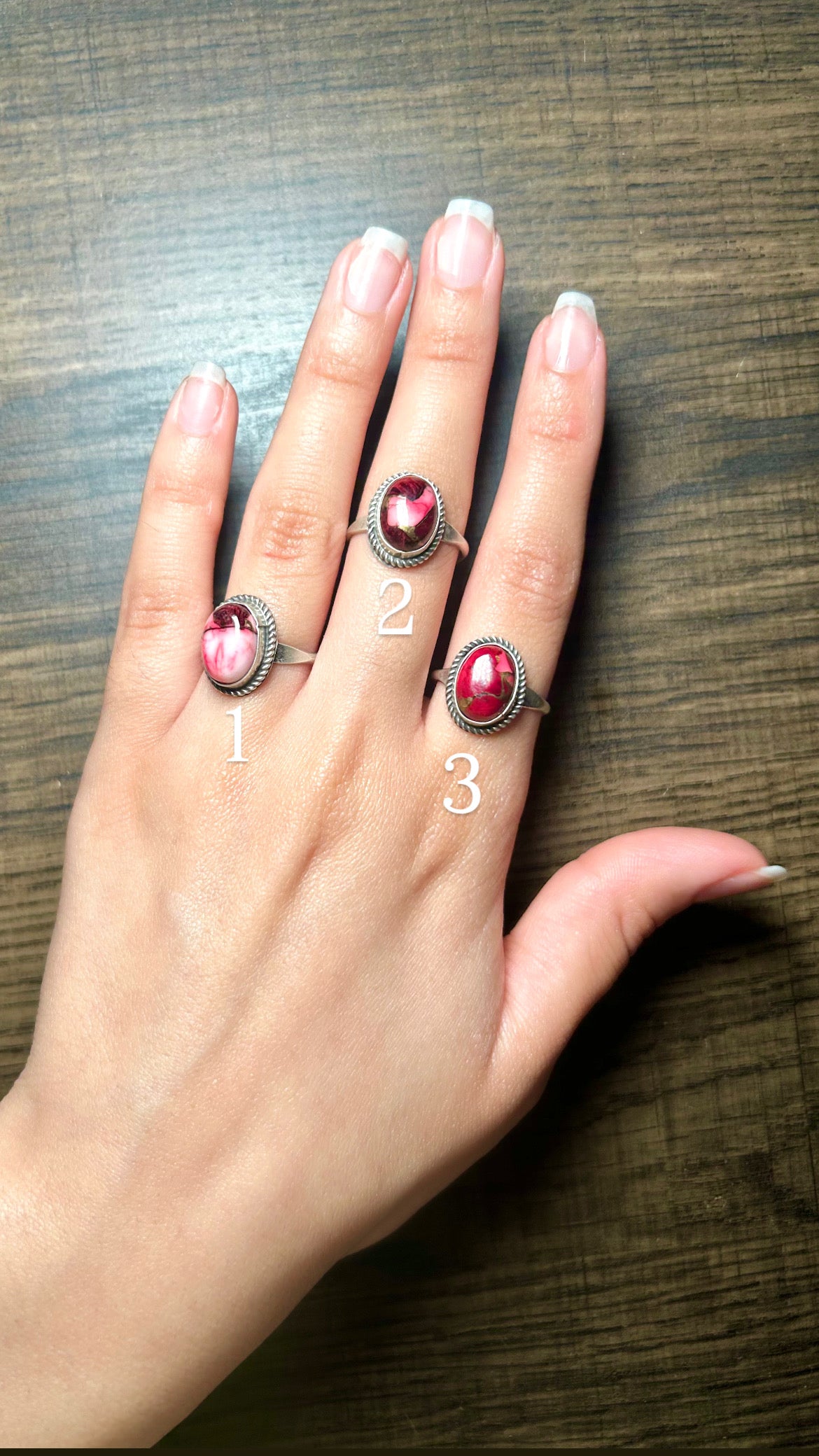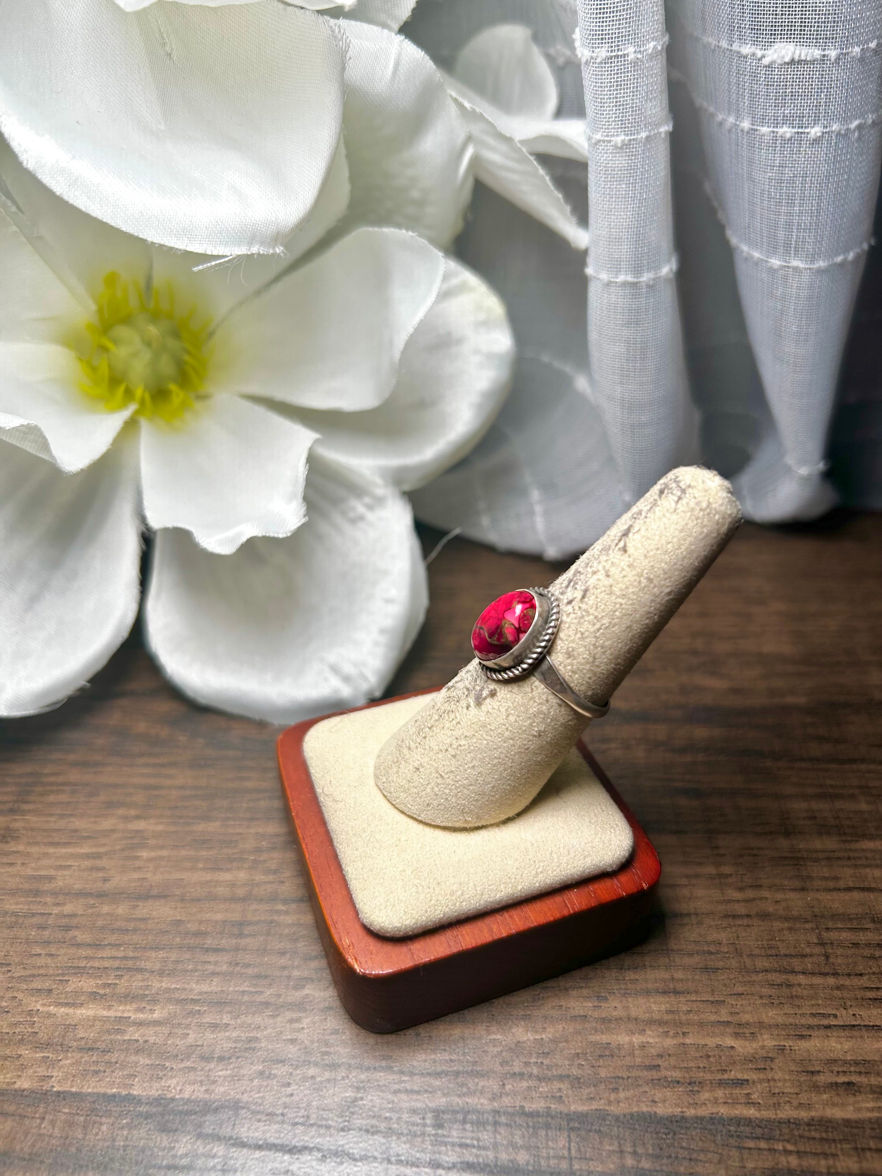 Navajo Made Cotton Candy Dahlia & Sterling Silver Ring. It measures 5/8 of an inch long and 1/2 of an inch wide. Signed by artist and stamped sterling silver.