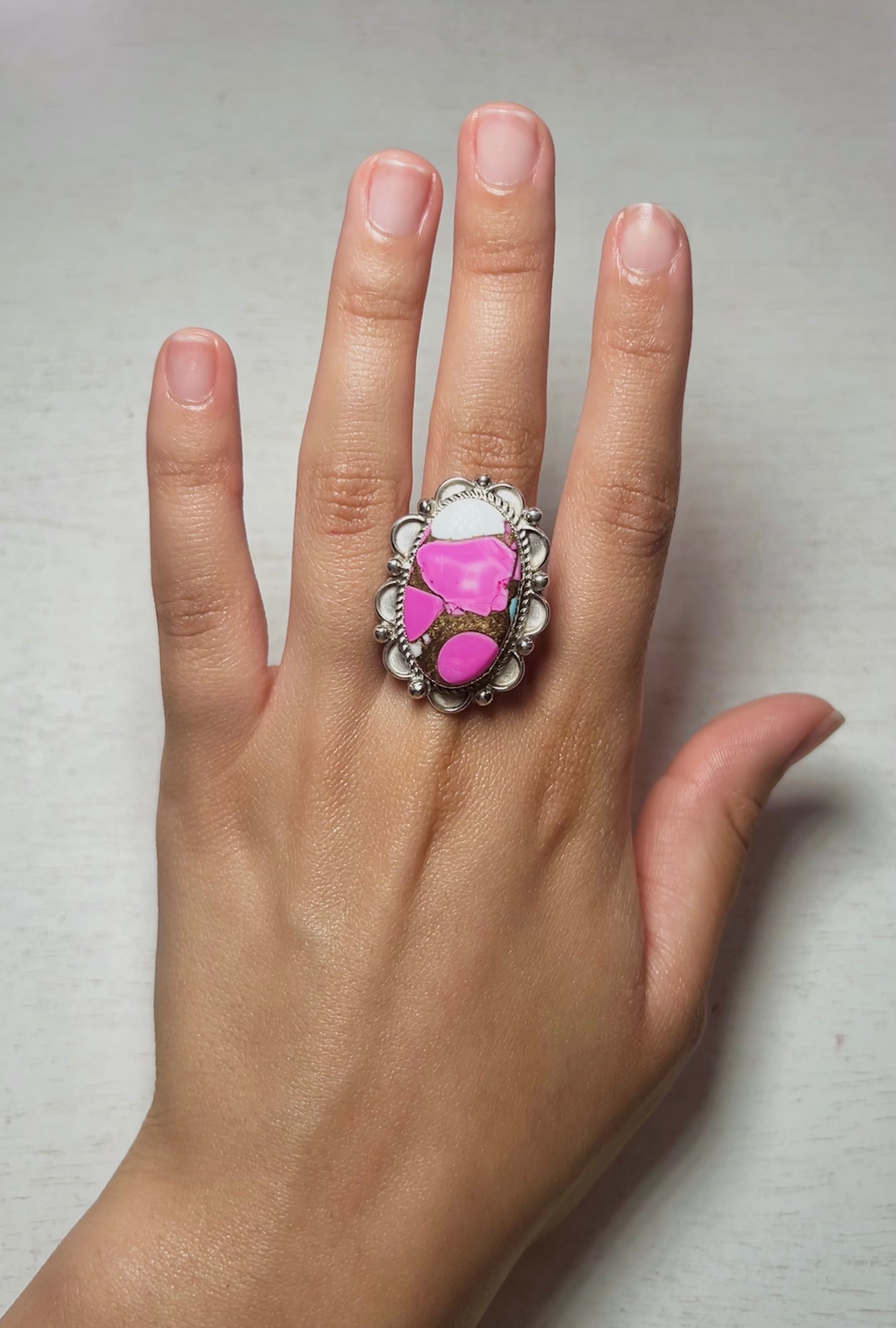 Navajo Made Cotton Candy Dahlia & Sterling Sliver Ring Size 7. It measures 1 3/8 inches long and 1 inch wide and Signed by the artist and stamped sterling silver.