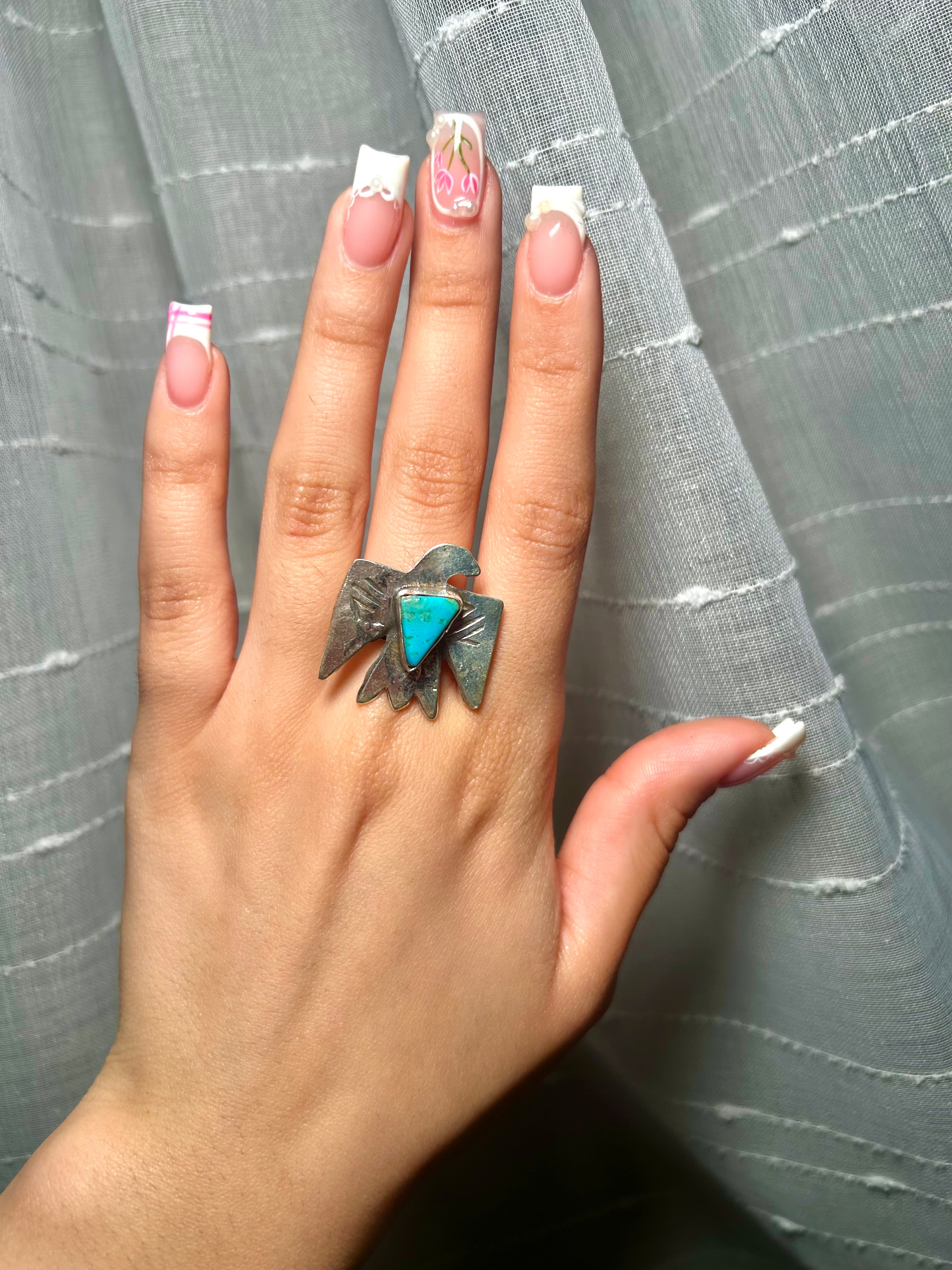 Jude Candelaria Kingman Turquoise & Sterling Silver Adjustable Ring. It measures 1 1/8 inches long and 1 inch wide. Signed by the artist and stamped sterling silver.