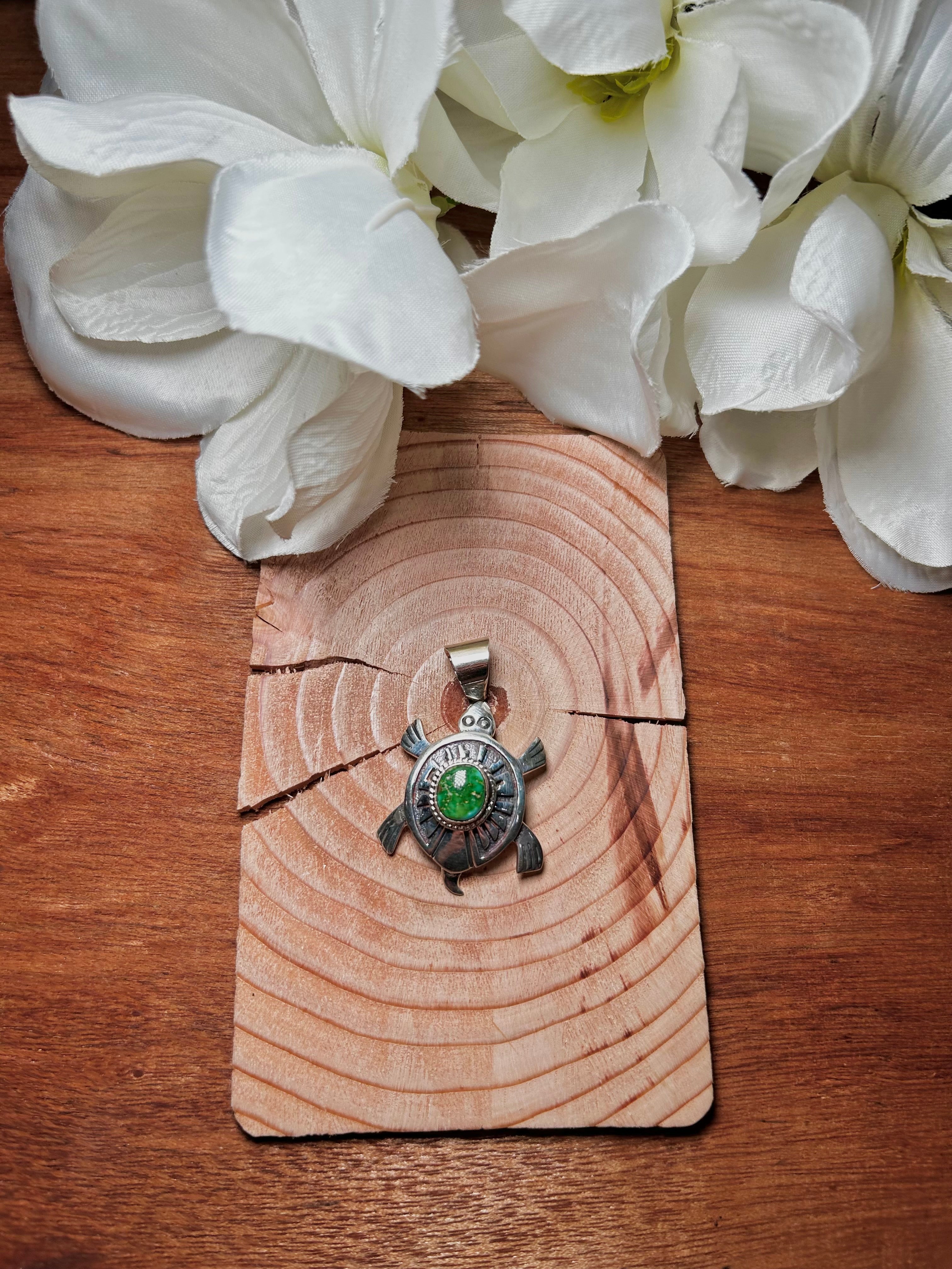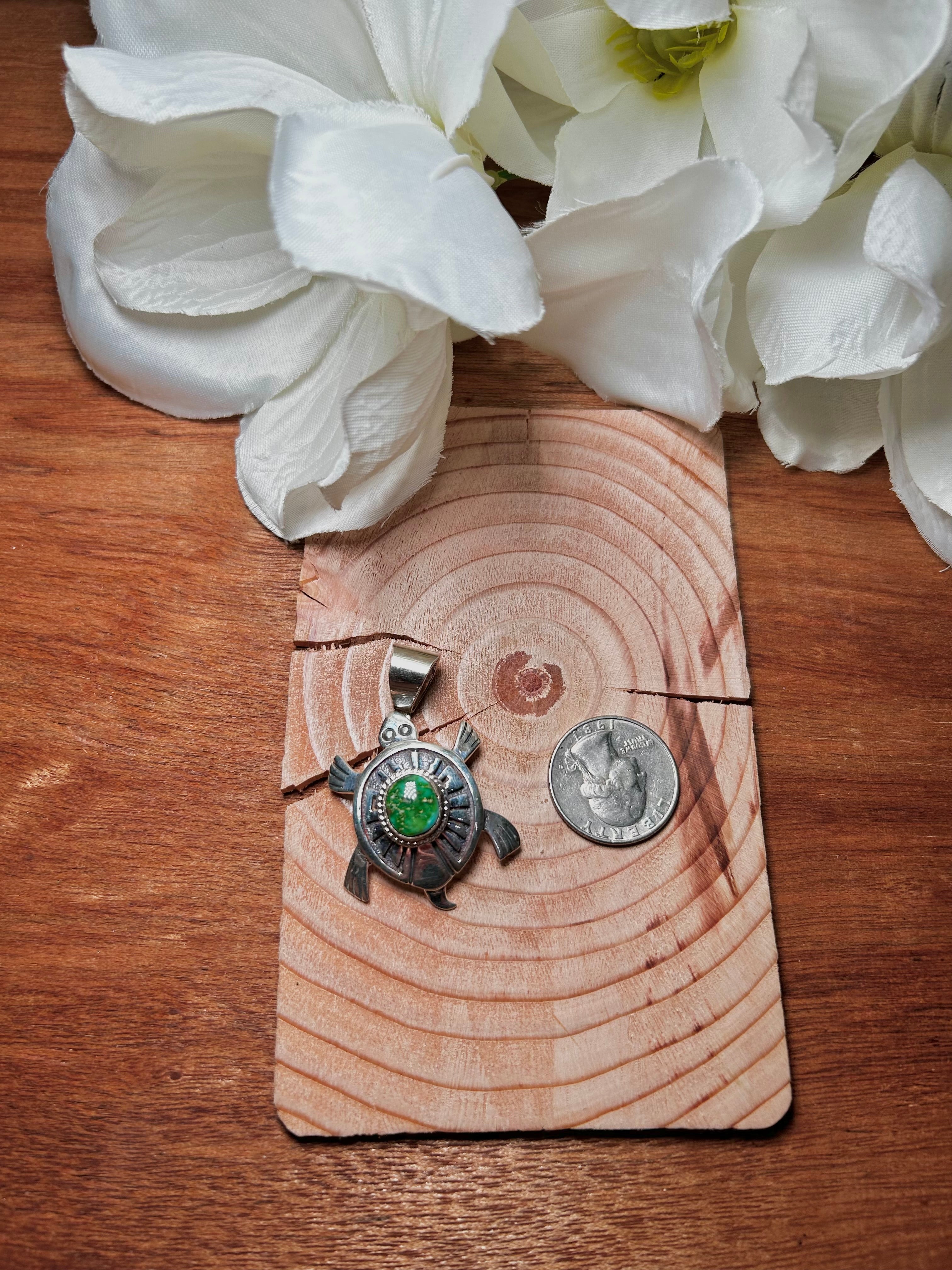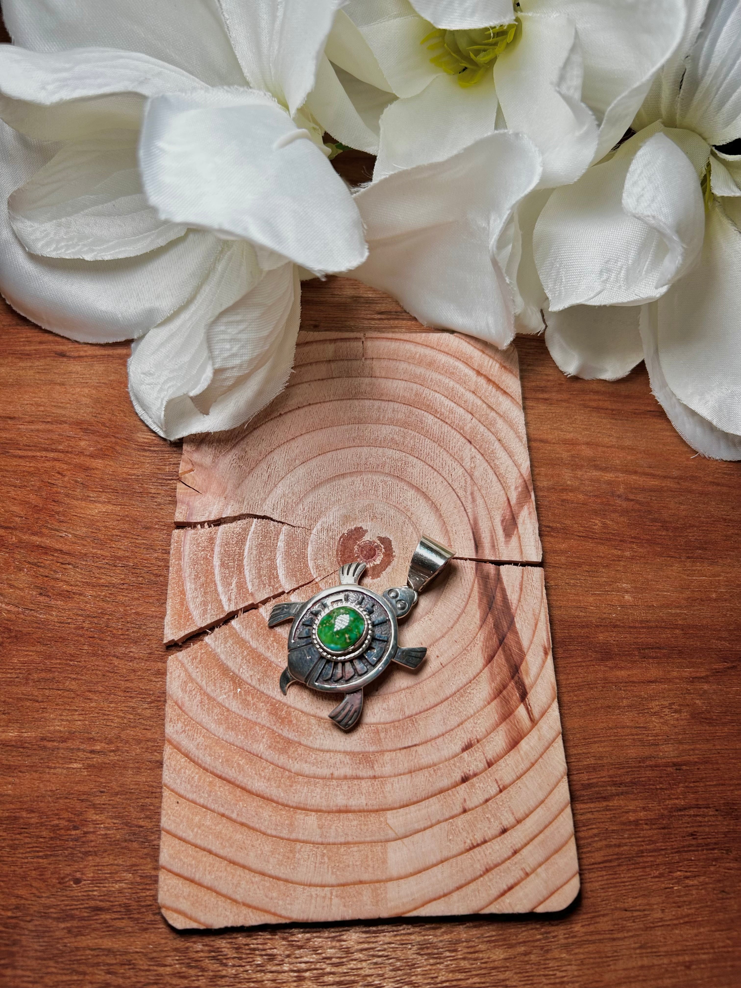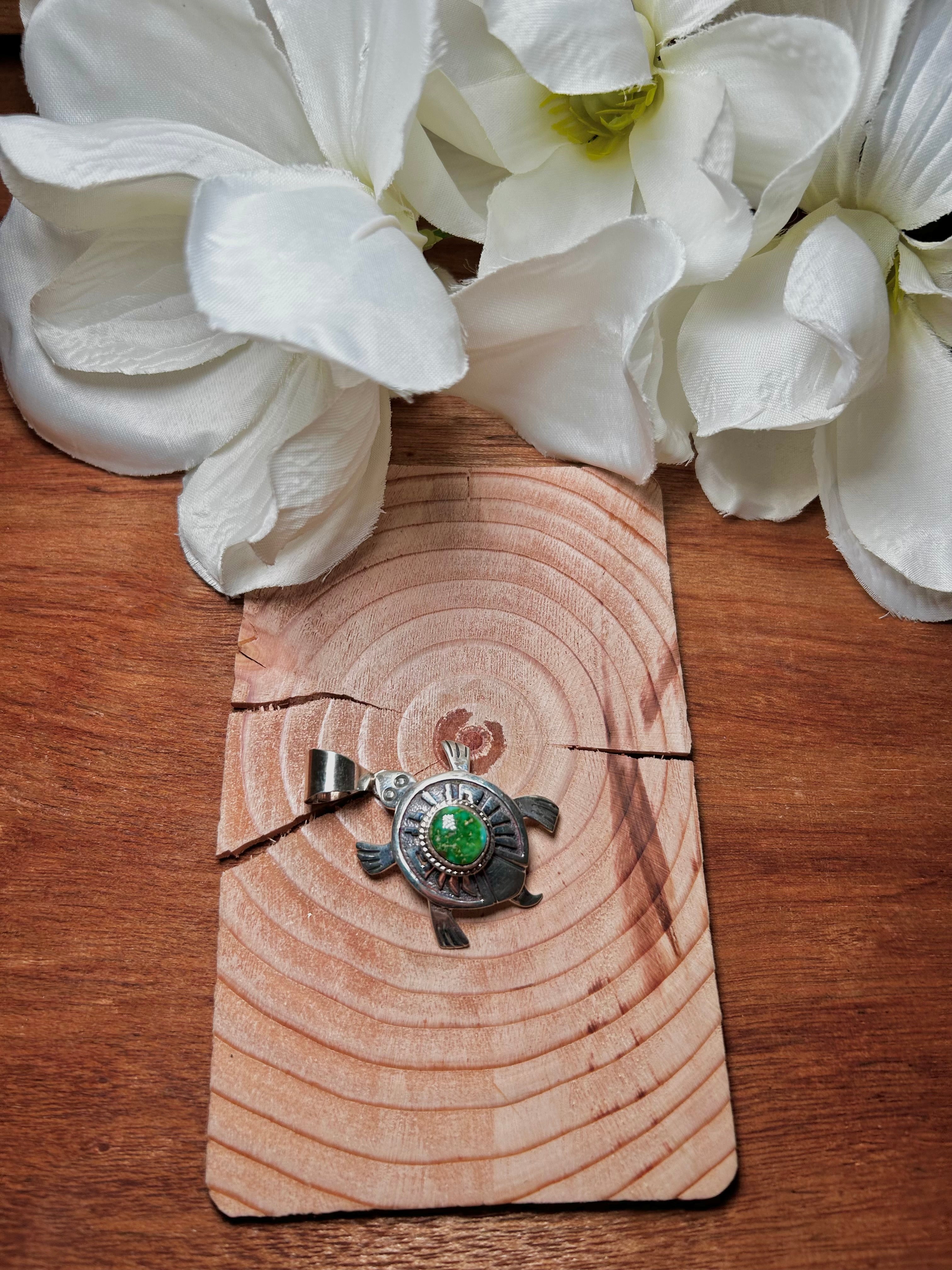 Navajo Made Sonoran Gold Turquoise & Sterling Silver Pendant. It measures 2 inches long and 1 1/4 inches wide. Pendant Only. Signed by the artist and stamped sterling silver.