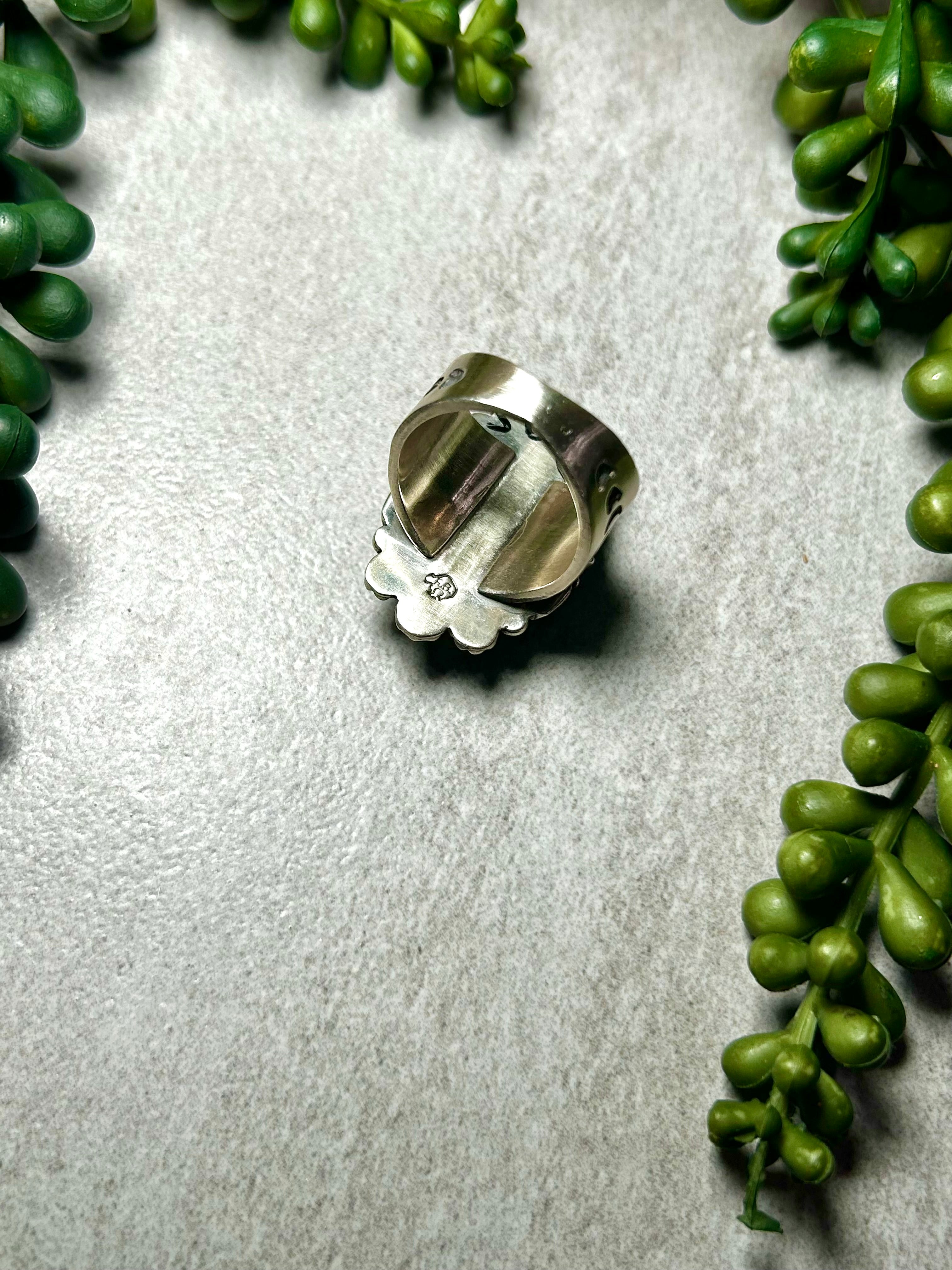 Daniel Benally Sonoran Mountain Turquoise & Sterling Silver Ring Size 9.5. It measures 1 1/4 inches long and 3/4 of an inch wide. Signed by the artist and stamped sterling silver.