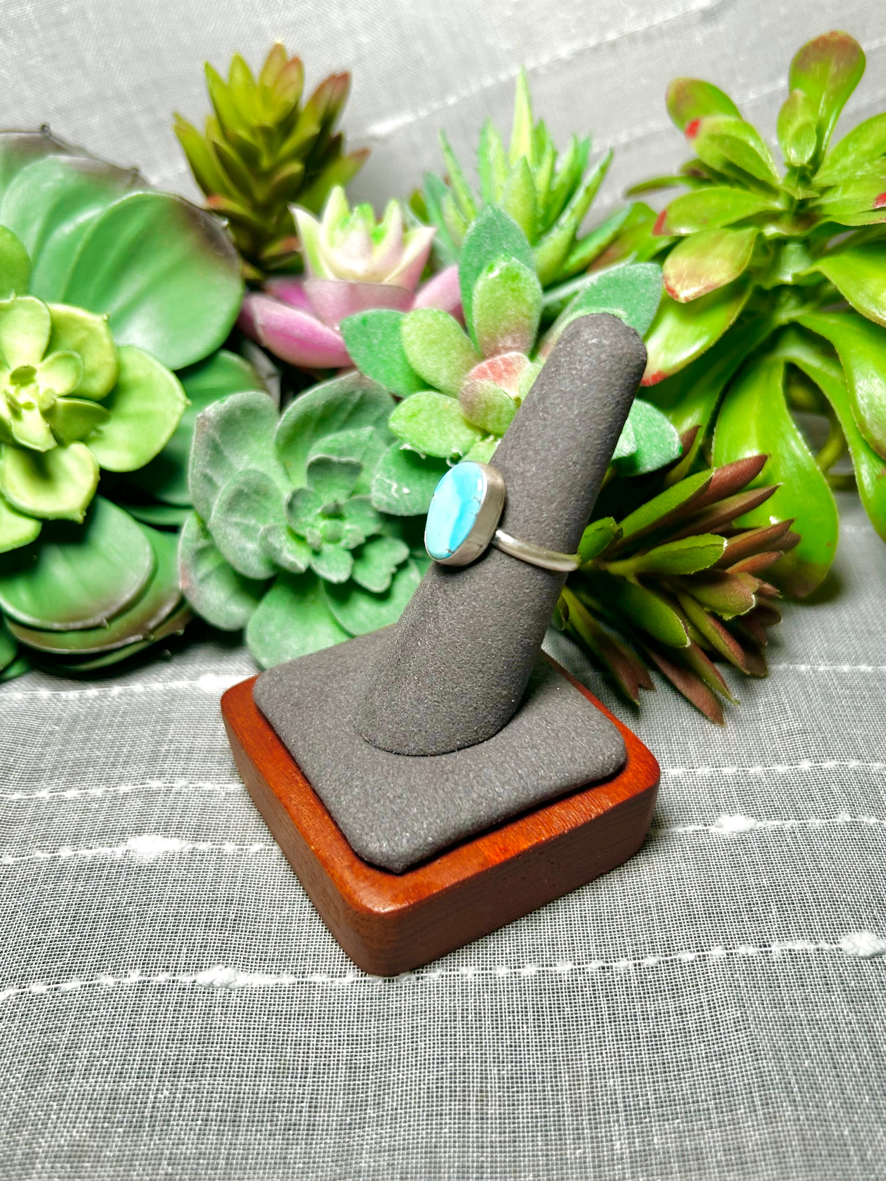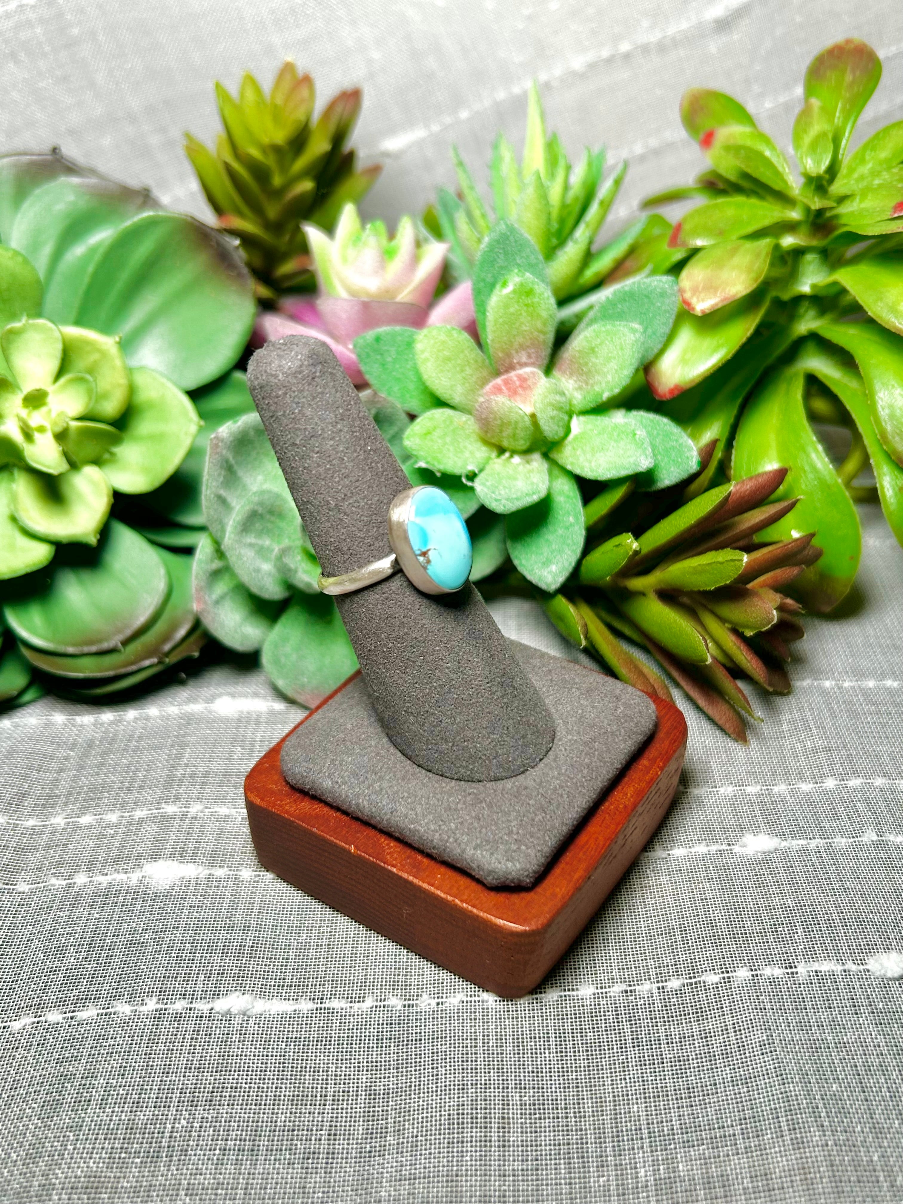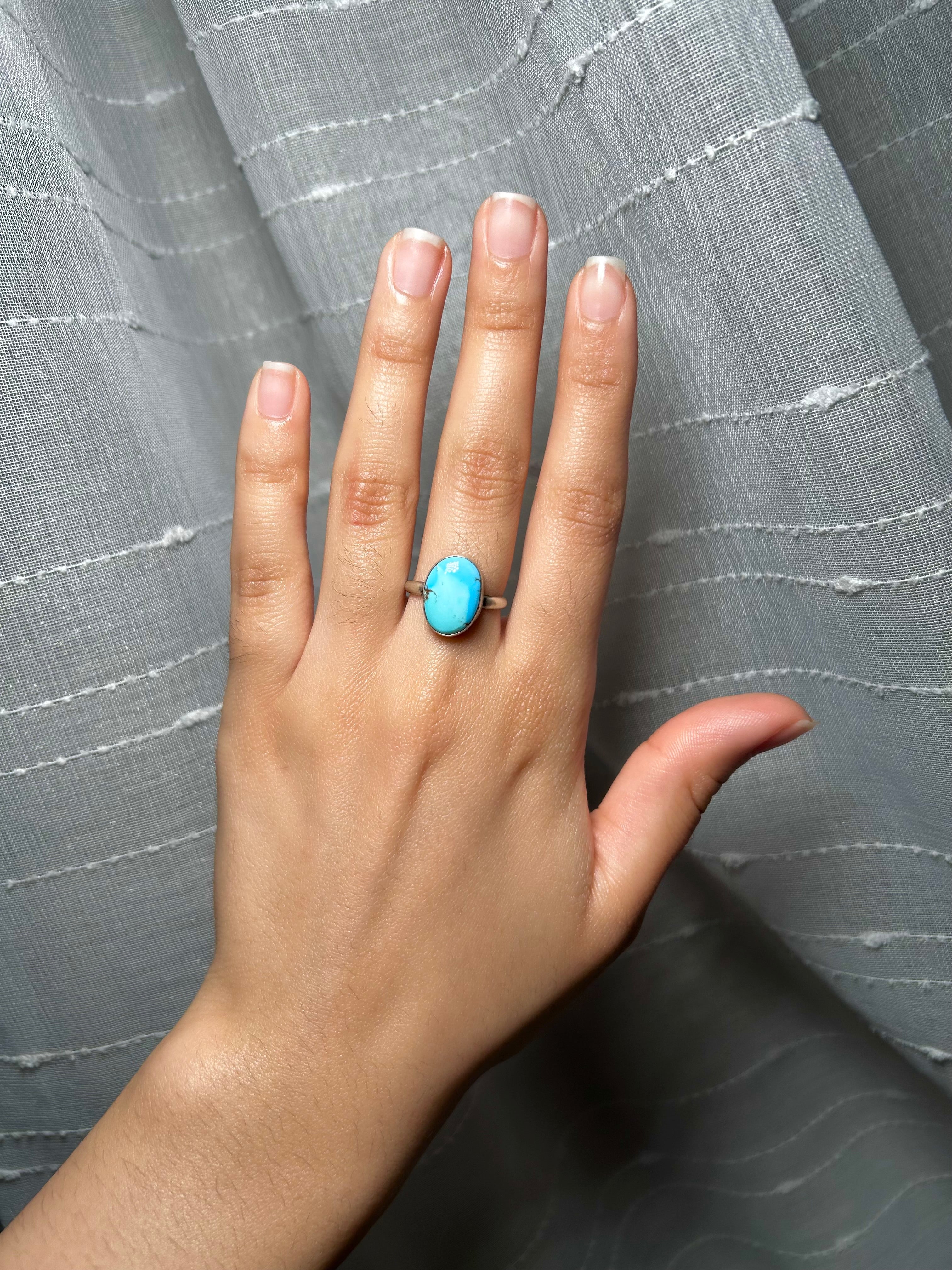 Navajo Made Kingman Turquoise & Sterling Silver Ring Size 6.75. It measures 5/8 of an inch long and 3/8 of an inch wide. Signed by the artist and stamped sterling silver.