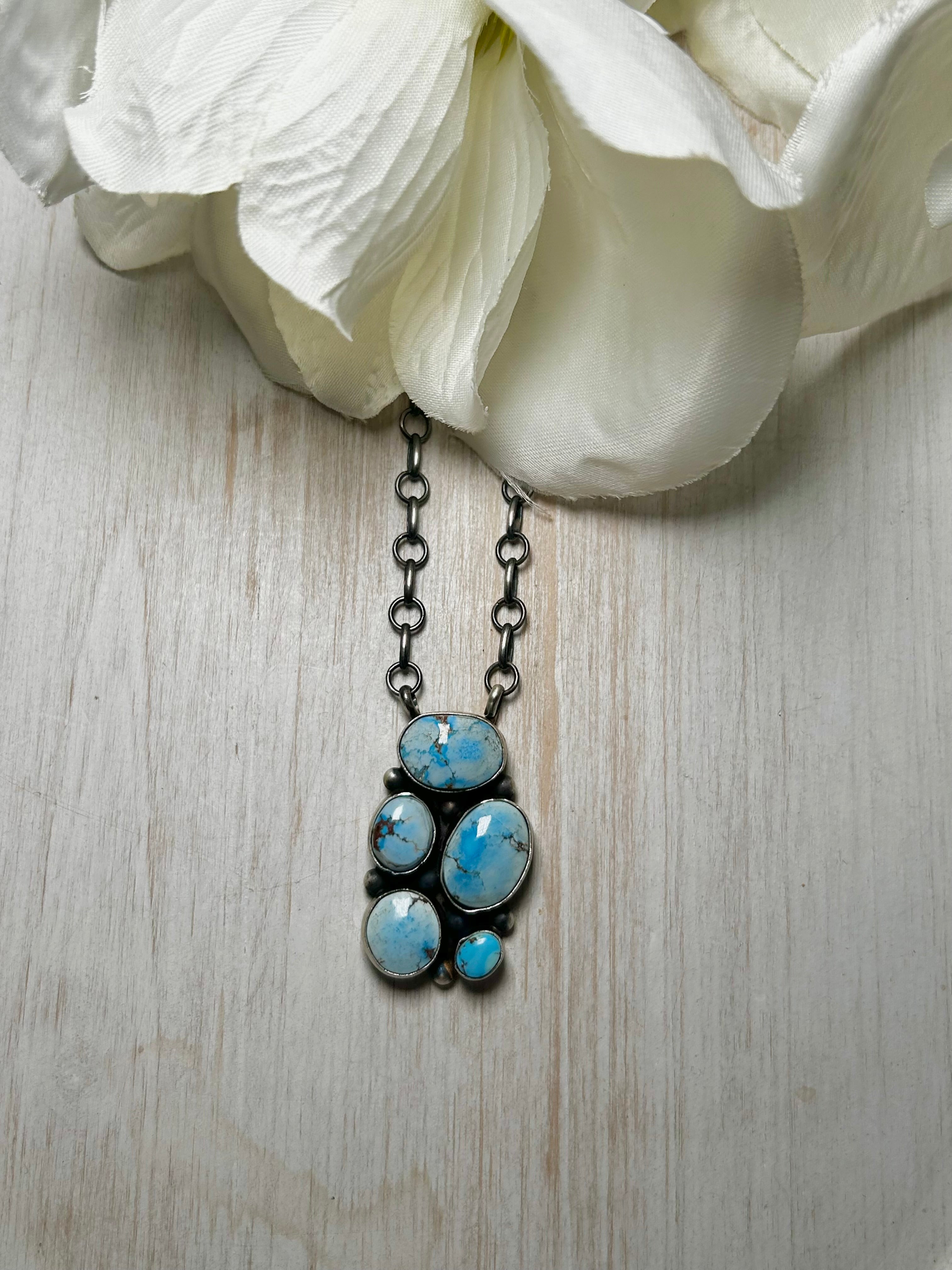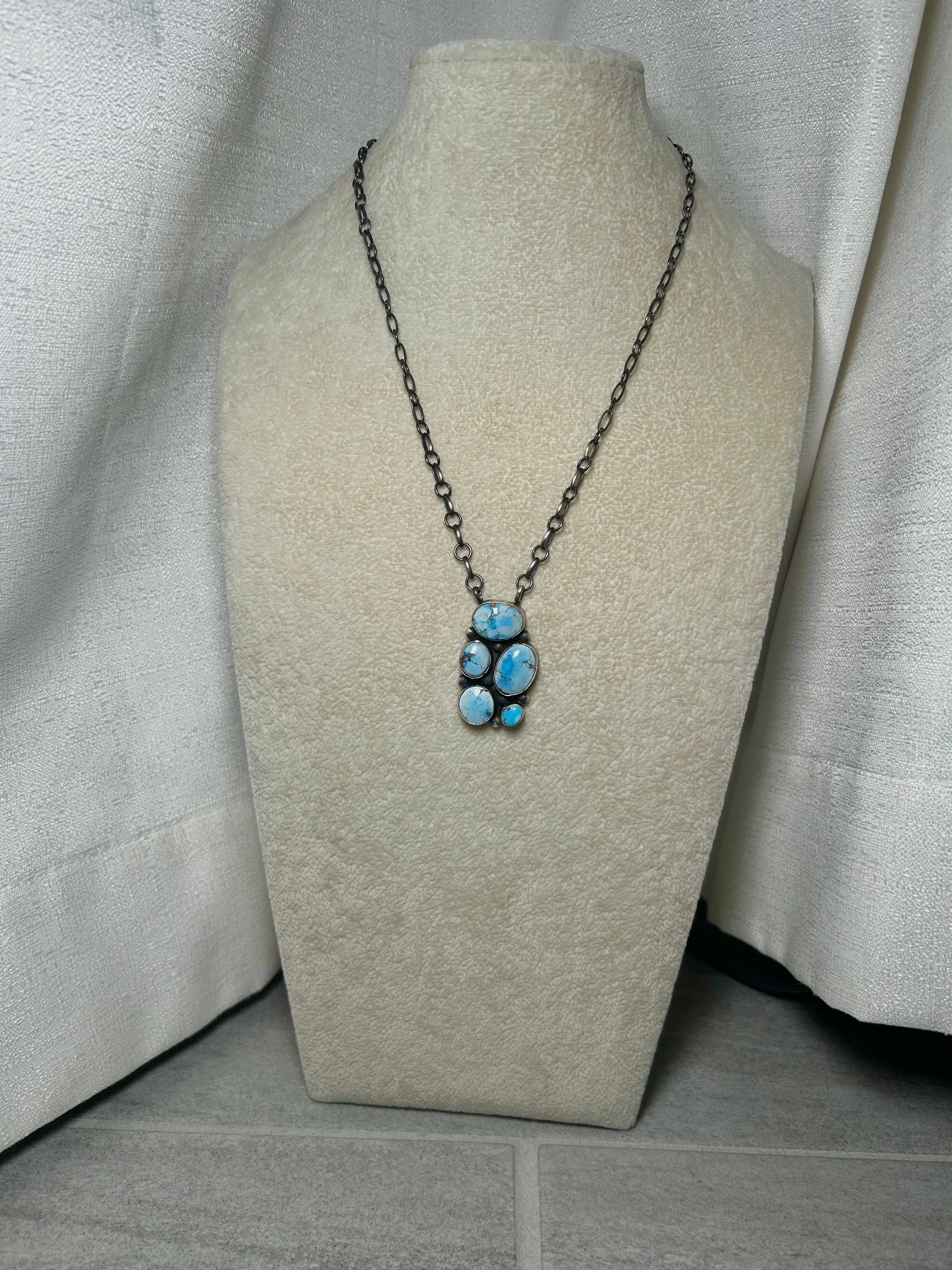 Navajo Made Golden Hills Turquoise & Sterling Silver Necklace. It measures 20 1/2 inches long with hang while the chain measures 19 1/2 inches long. Signed by the artist and stamped sterling silver.