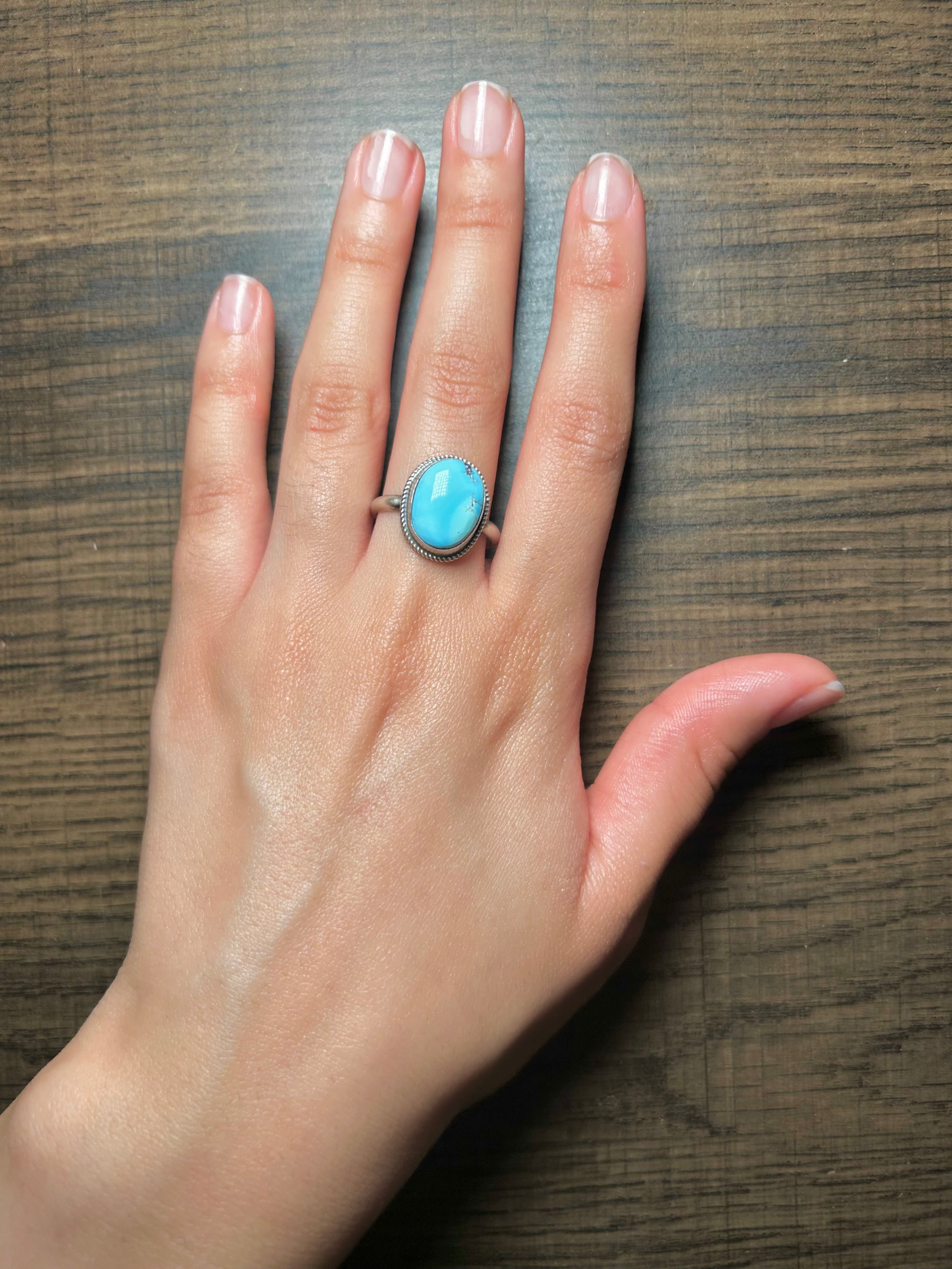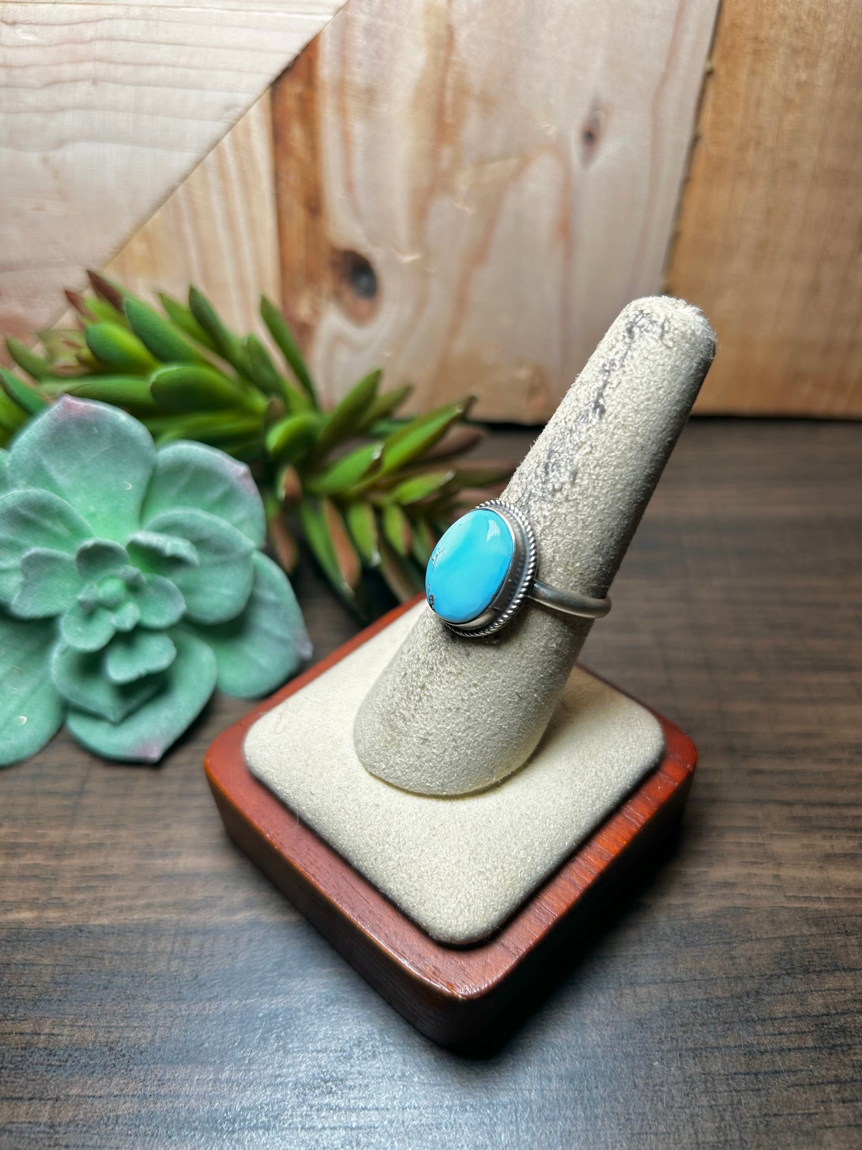 Navajo Made Golden Turquoise & Sterling Silver Ring Size 8.25. It measures 5/8 of an inch long and 1/2 of an inch wide.