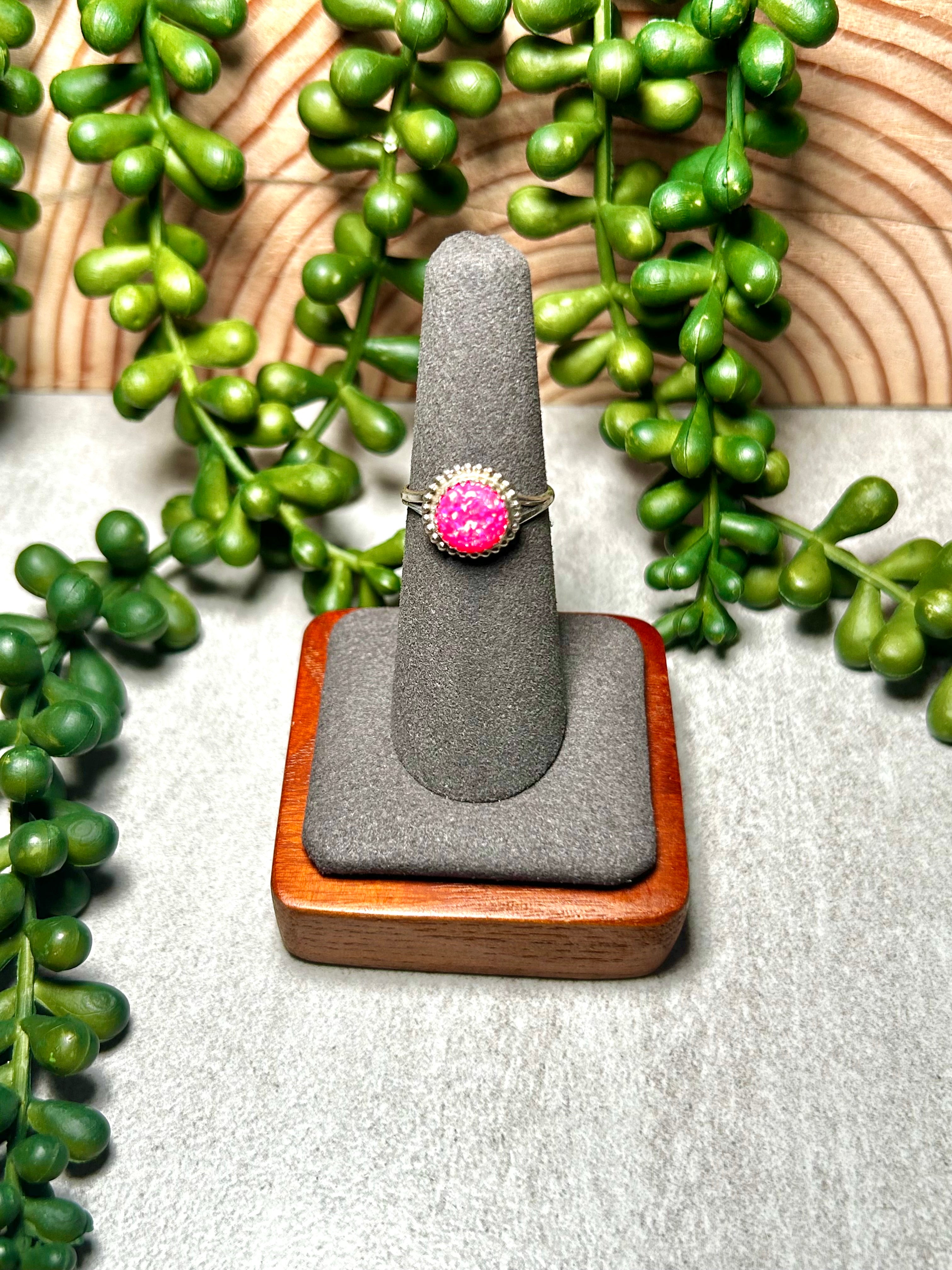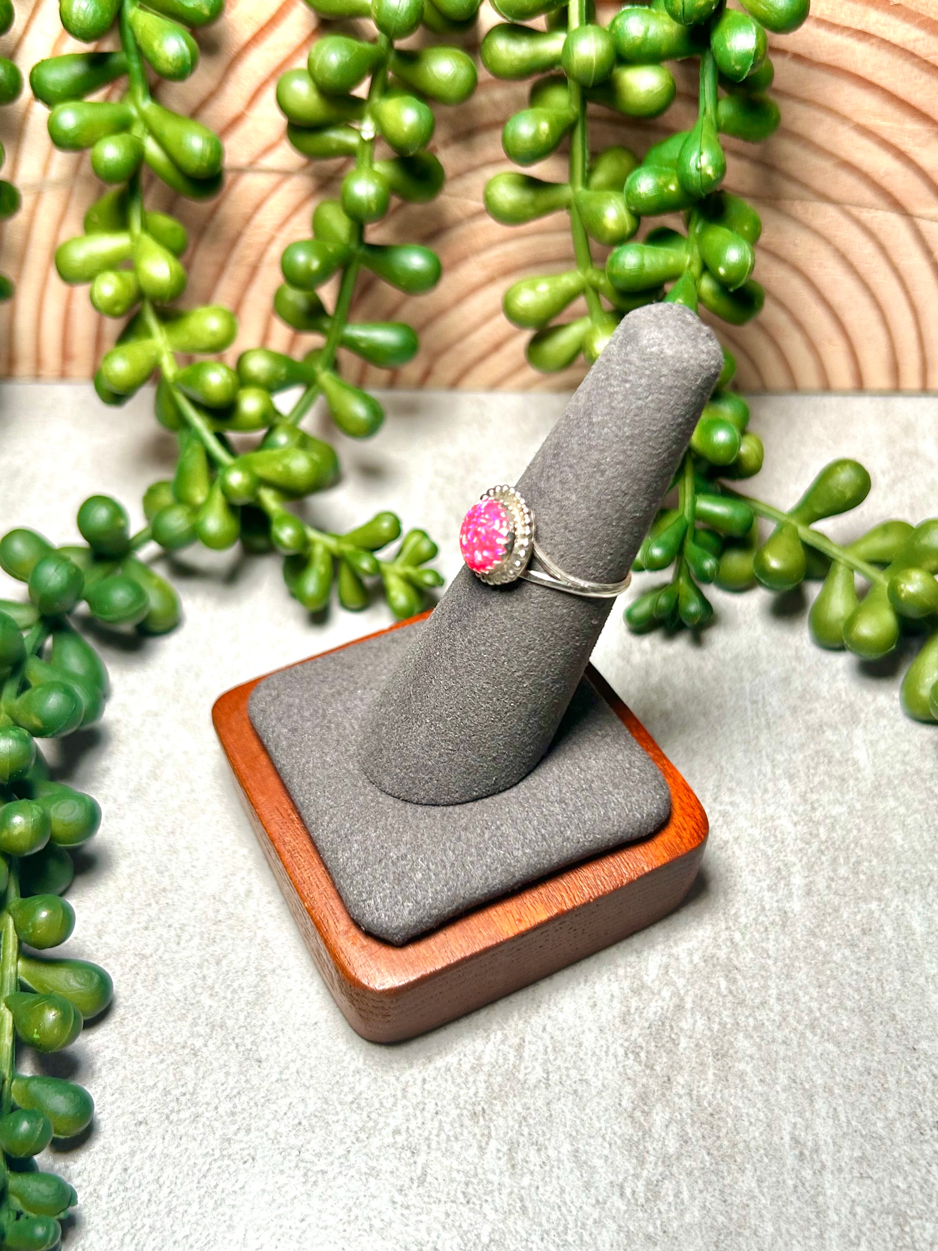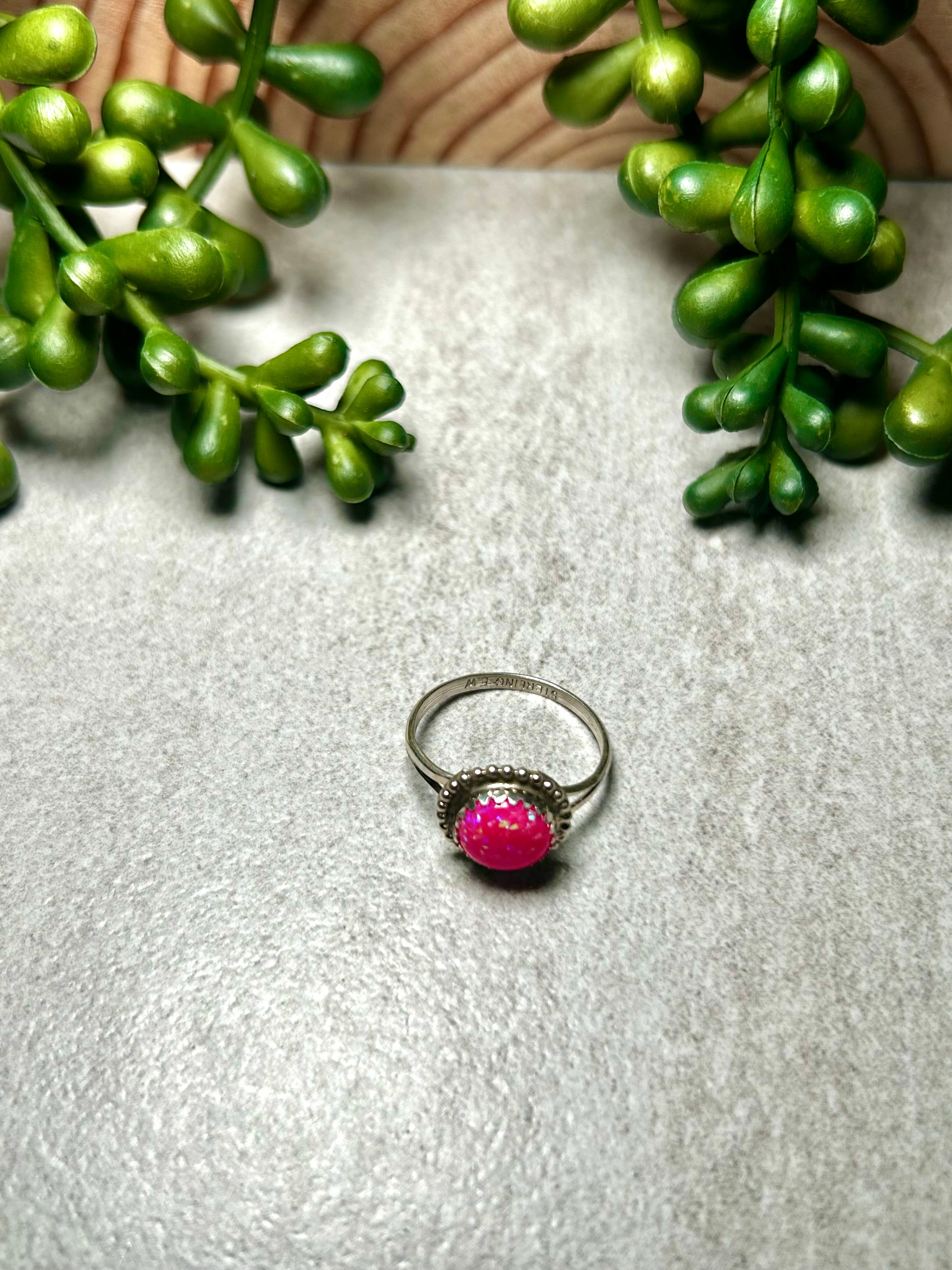 Navajo Man-Made Pink Opal & Sterling Silver Ring. It measures 3/8 of an inch long and 3/8 of an inch wide. Signed by the artist and stamped sterling silver.