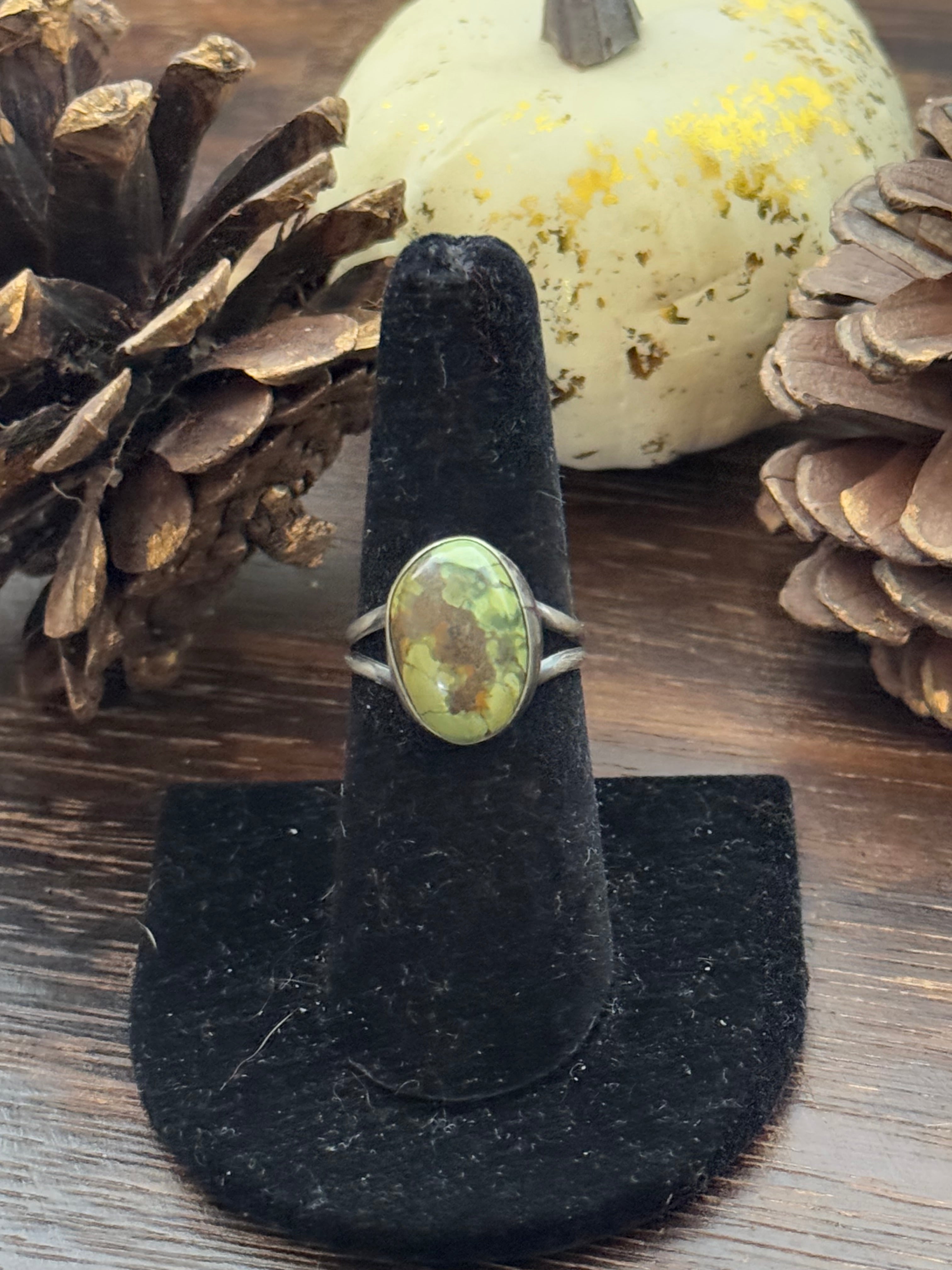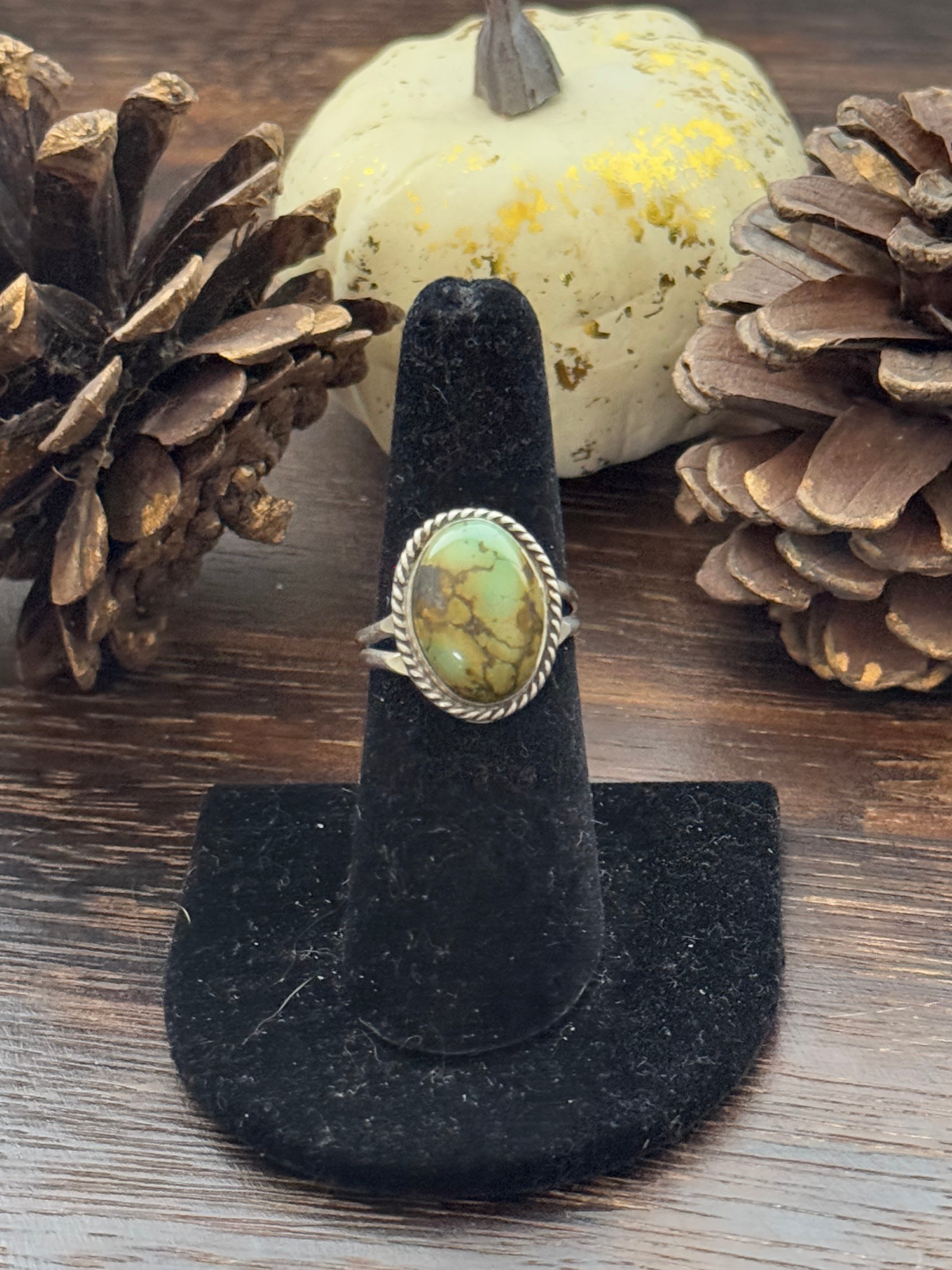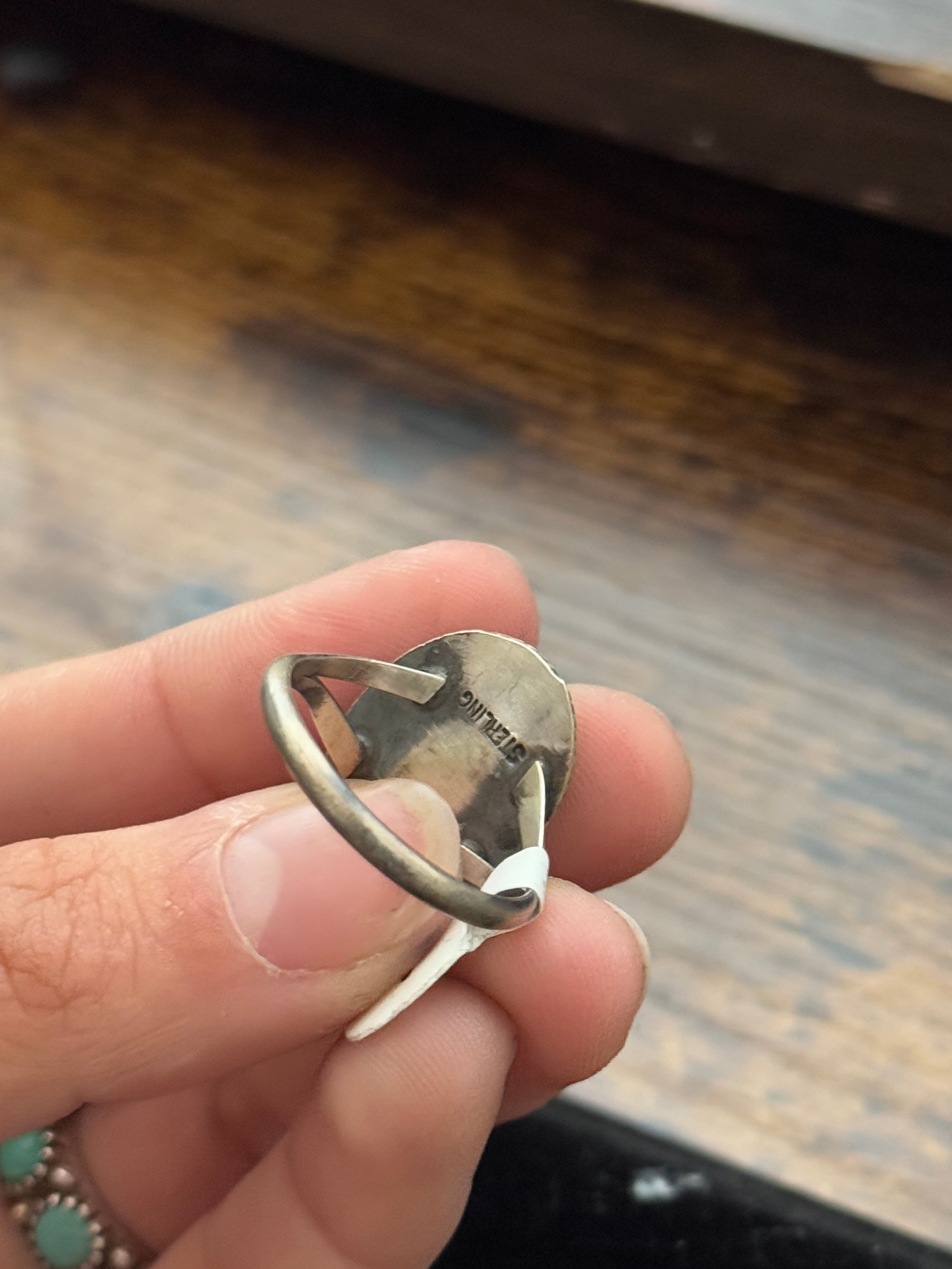 Navajo Made Hubei Turquoise & Sterling Silver Ring. It measures 5/8 of an inch long. Signed by the artist and stamped sterling silver.