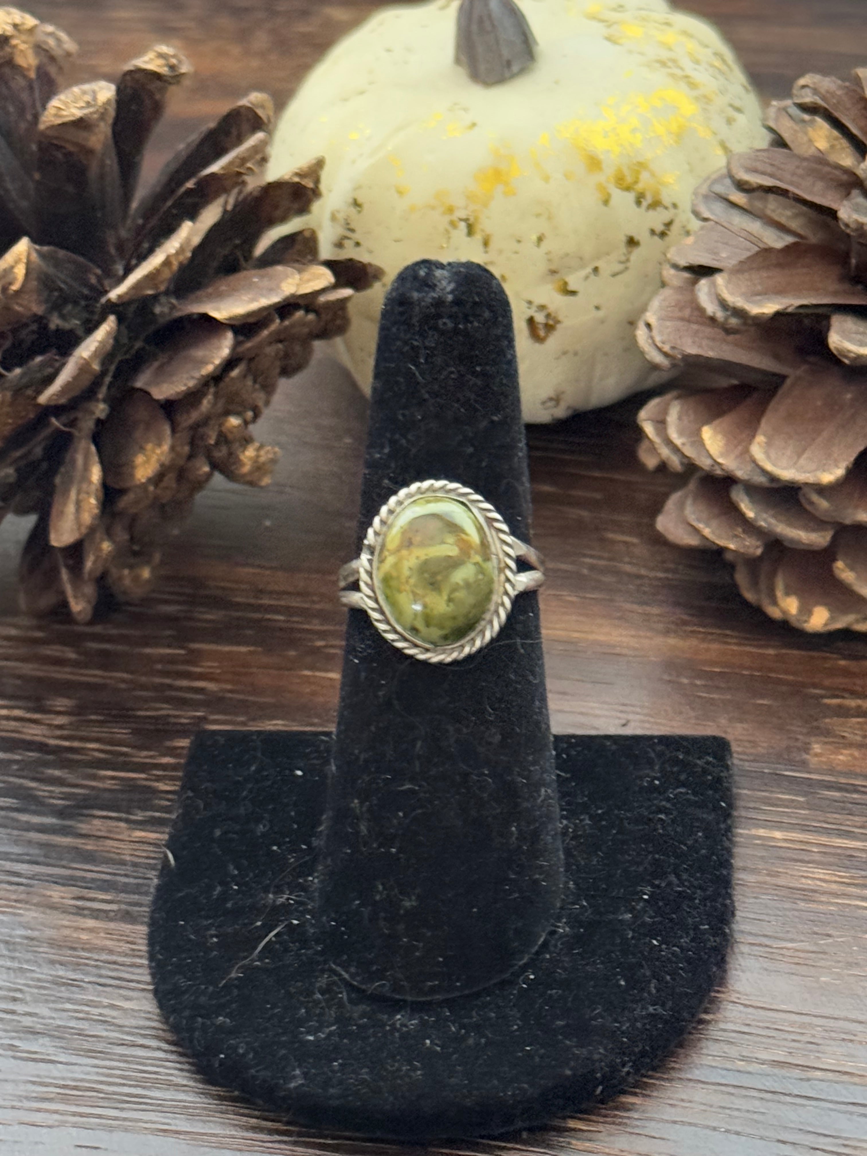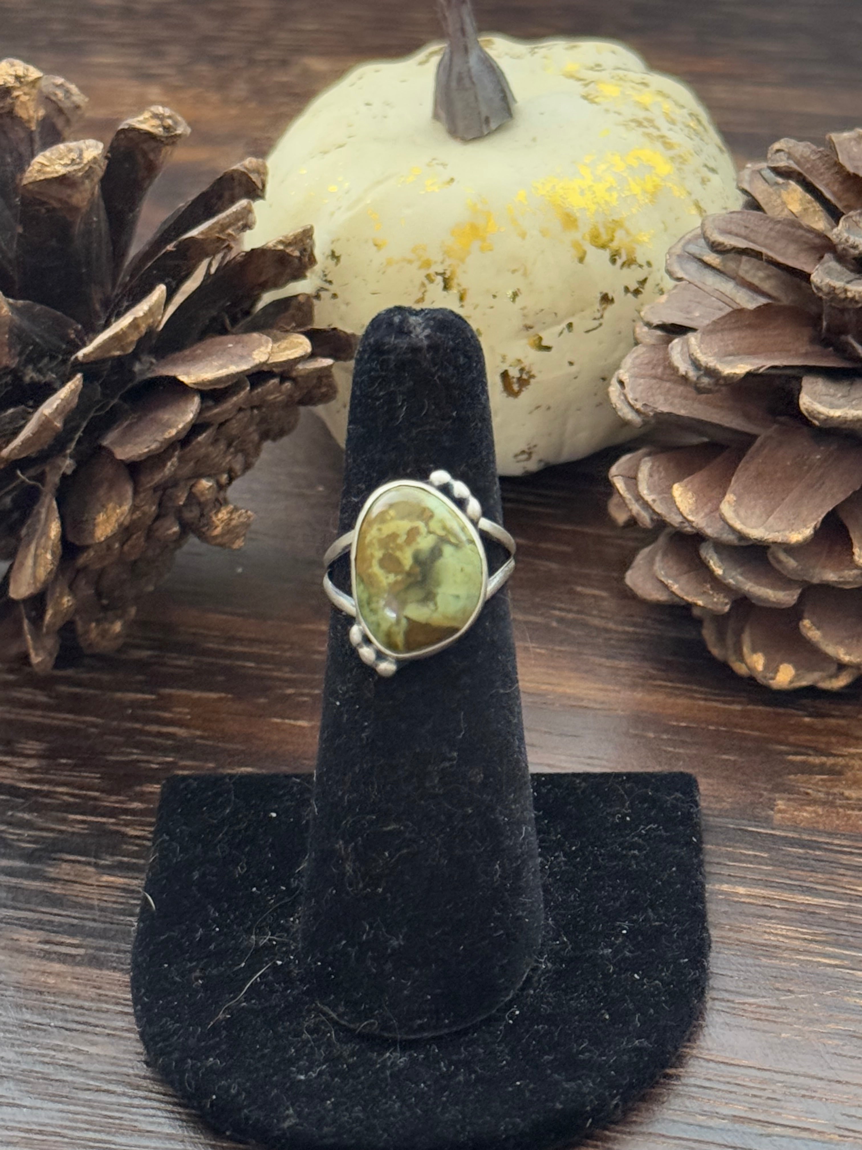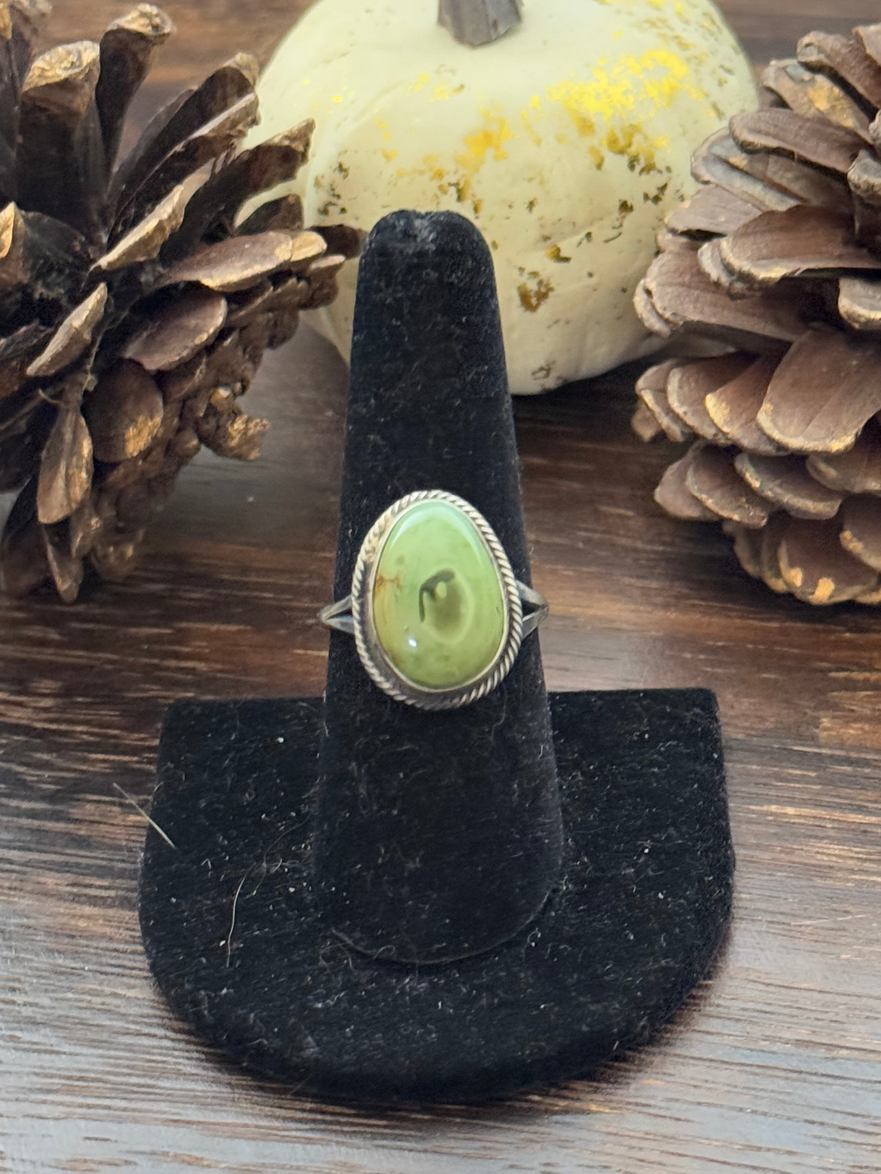 Navajo Made Hubei Turquoise & Sterling Silver Ring. It measures 5/8 of an inch long. Signed by the artist and stamped sterling silver.