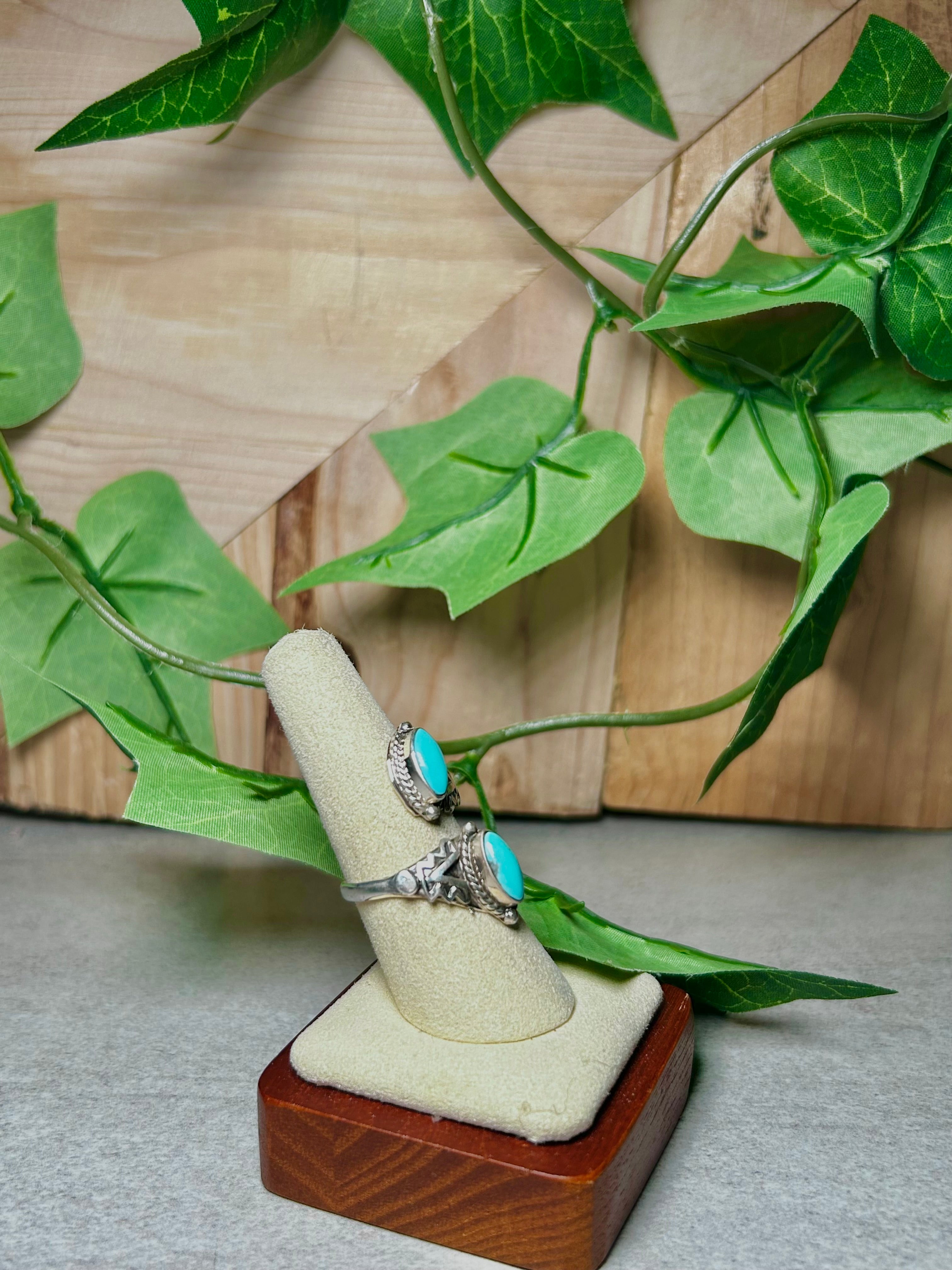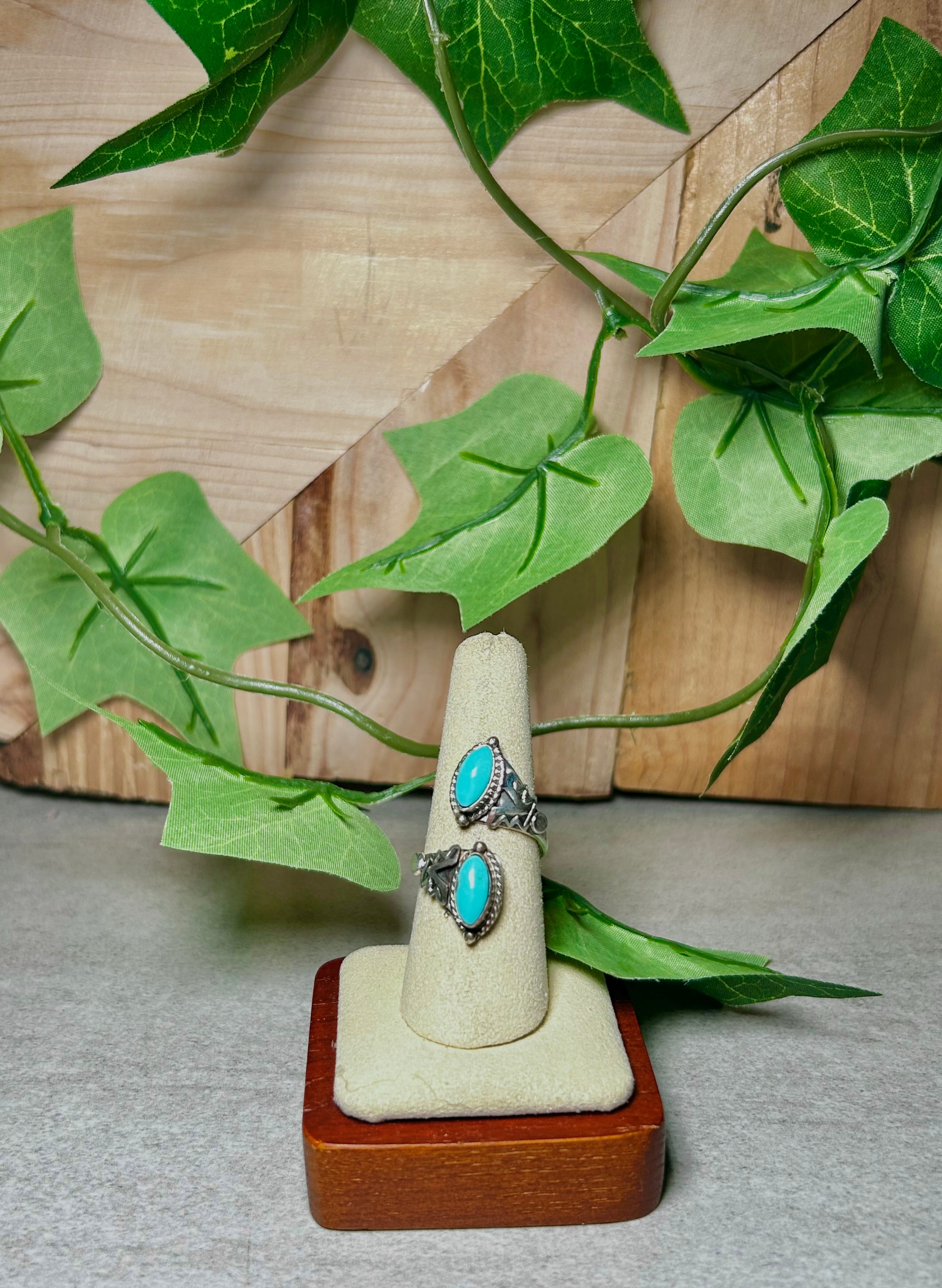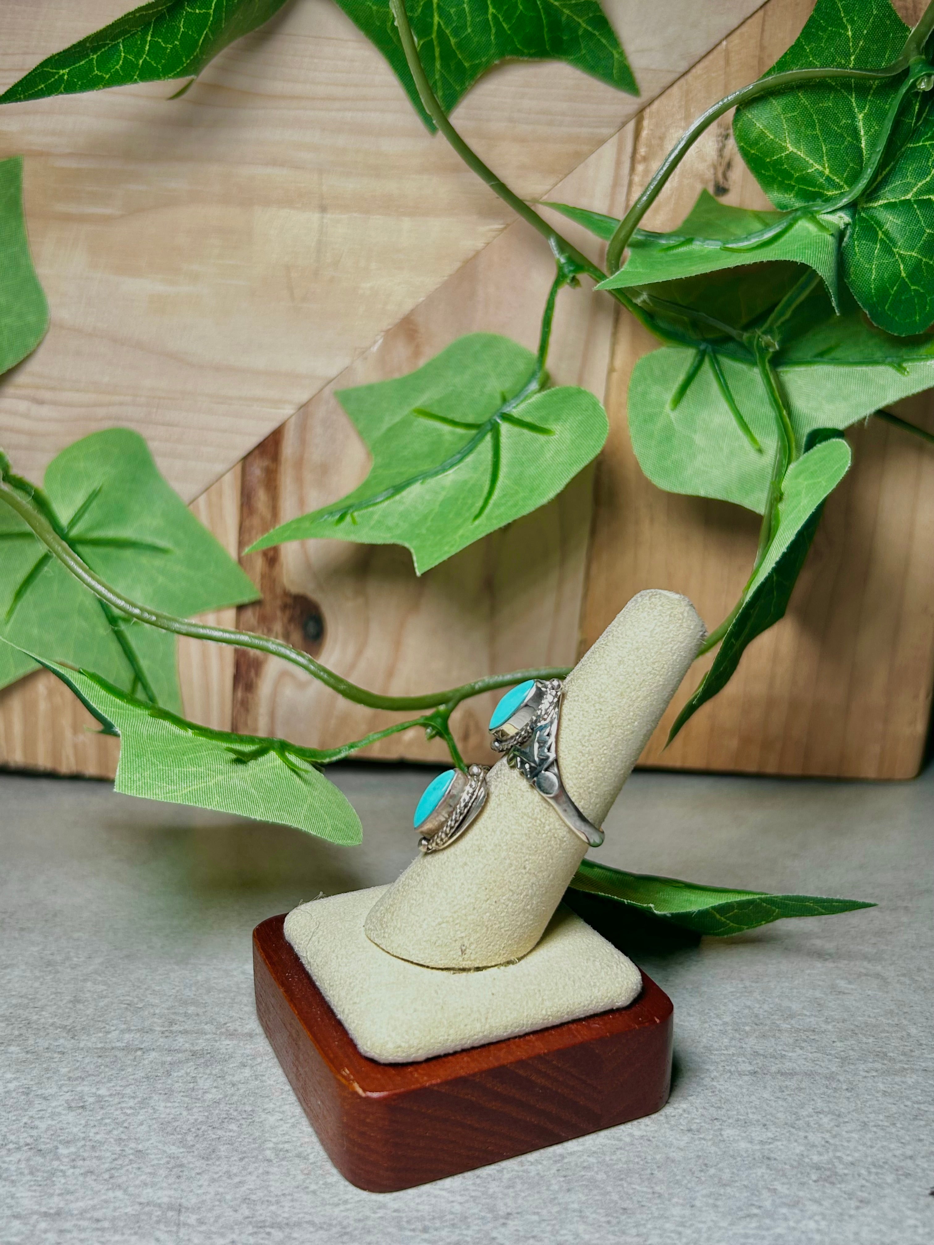 Navajo Made Kingman Turquoise and Sterling Silver Adjustable Ring. It measures 1 1/4 inches long and 3/4 of an inch wide. Signed by the artist and stamped sterling silver. Stones will vary due to natural stones.