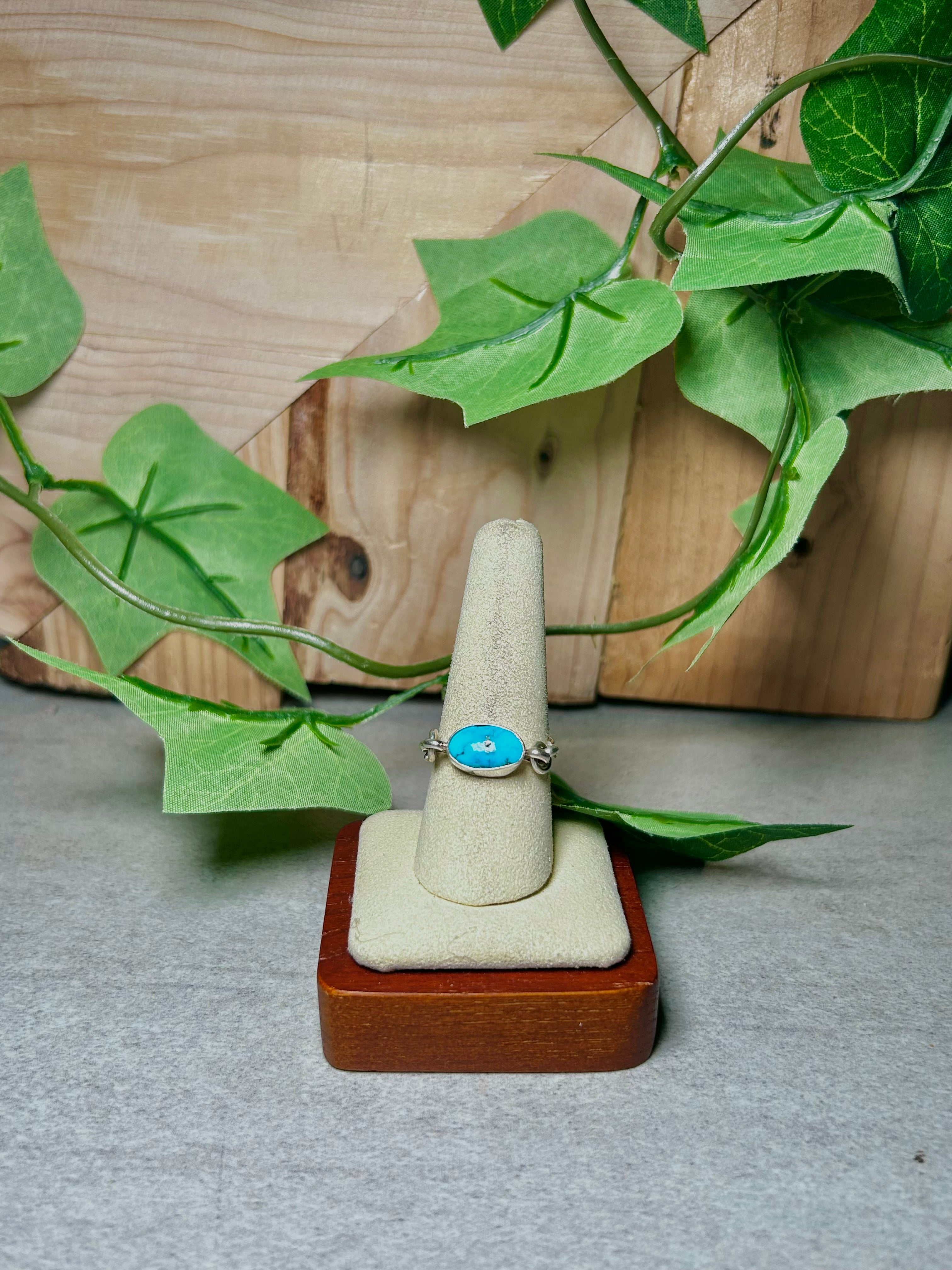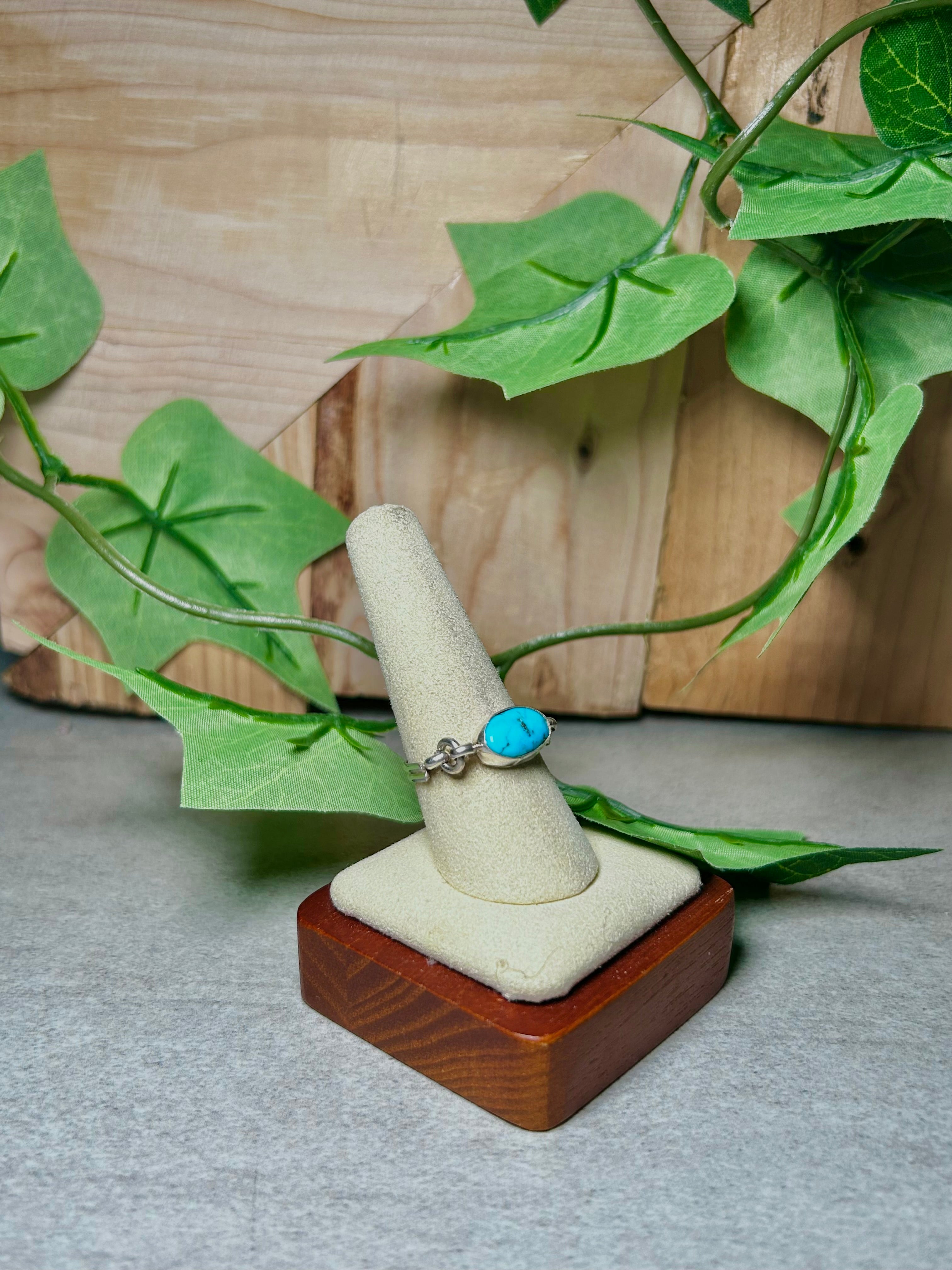 Navajo Made Kingman Turquoise and Sterling Silver Ring Size 9.25. It measures 3/8 of an inch long and 1/2 of an inch wide. Signed by the artist and stamped sterling silver.