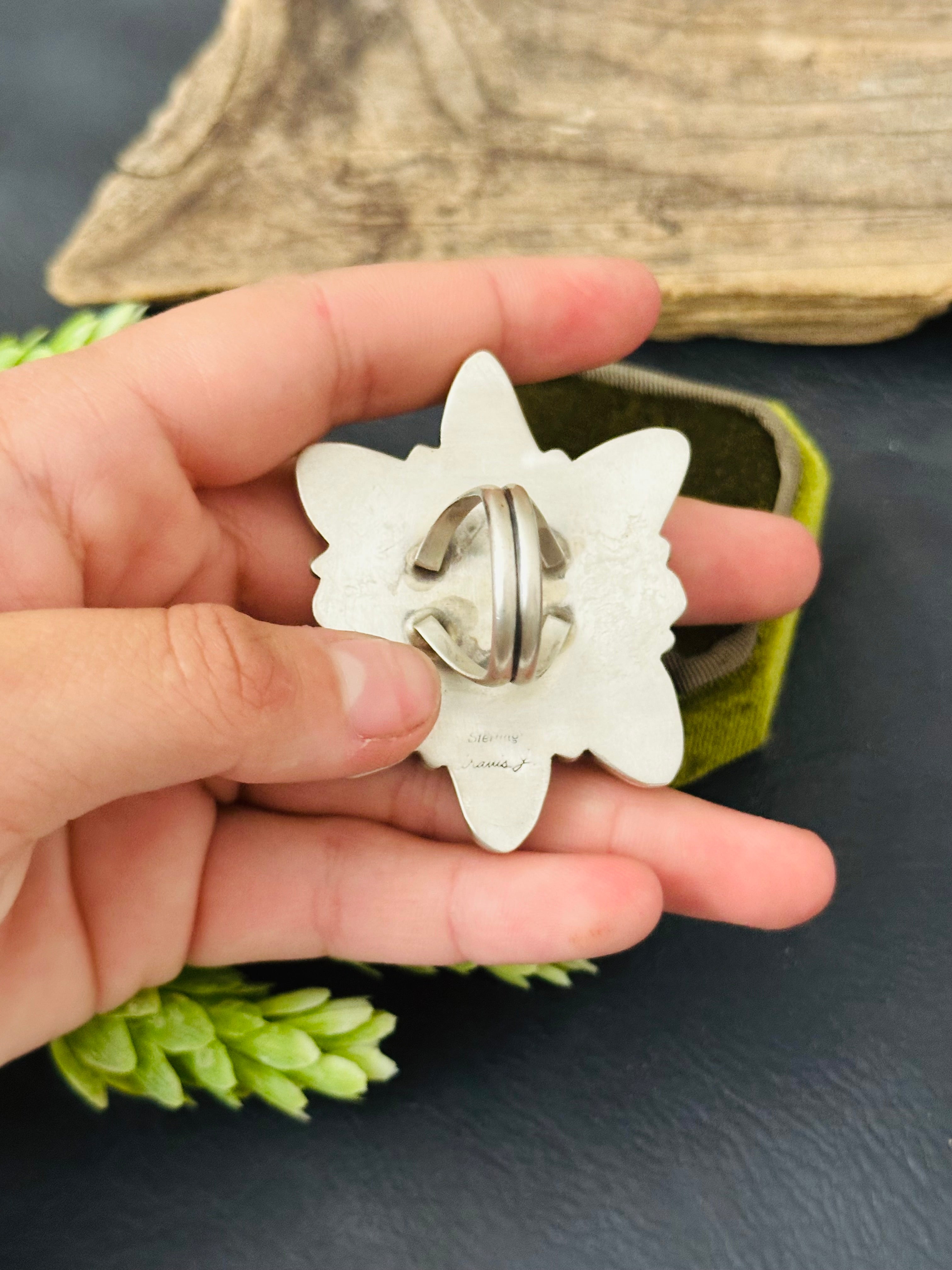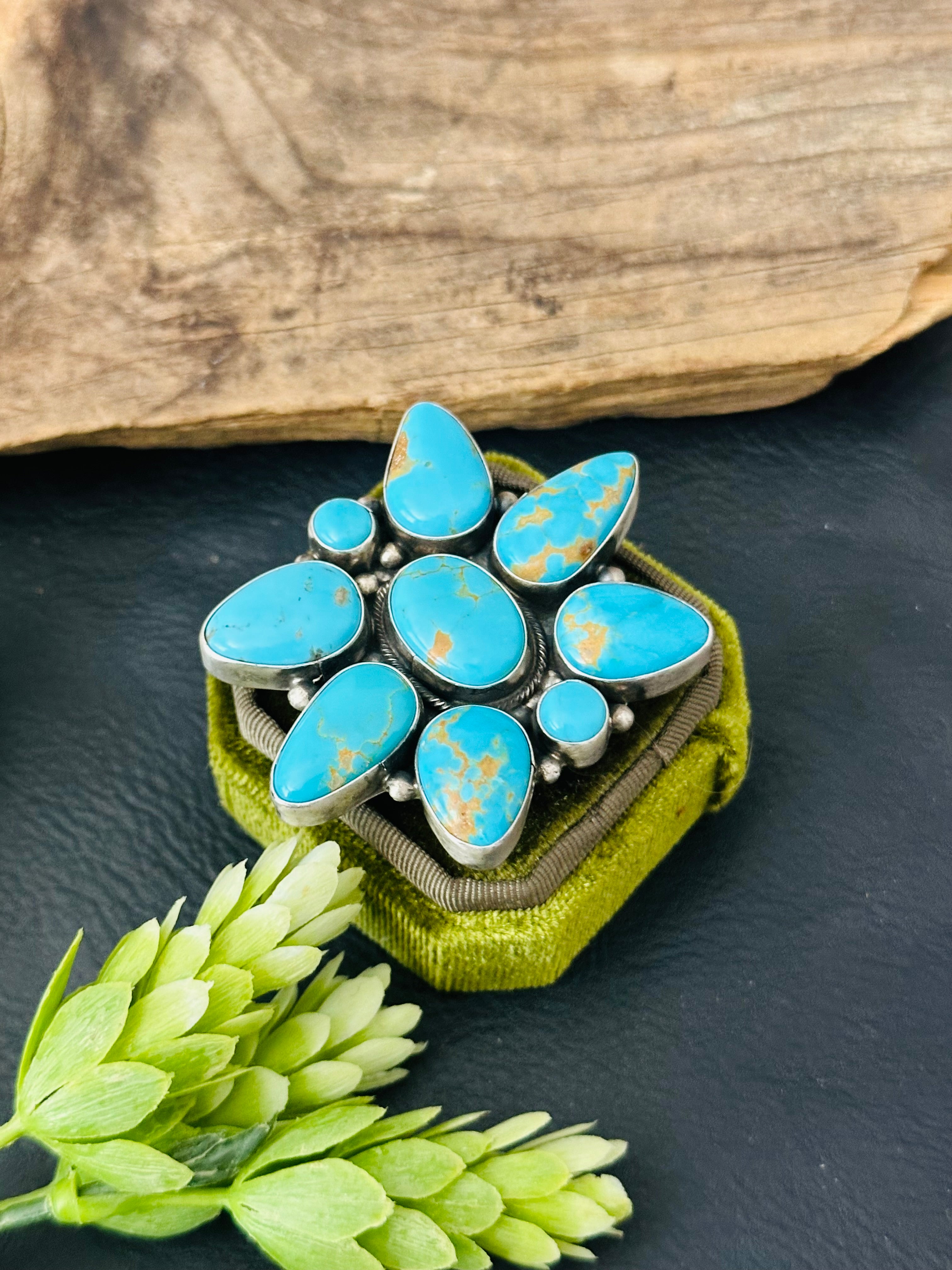Beautiful ring.Navajo Made Kingman Turquoise & Sterling Silver Cluster Ring Size 7.5. It measures 1 1/2 inches long and 2 inches wide. Stamped sterling silver and signed.