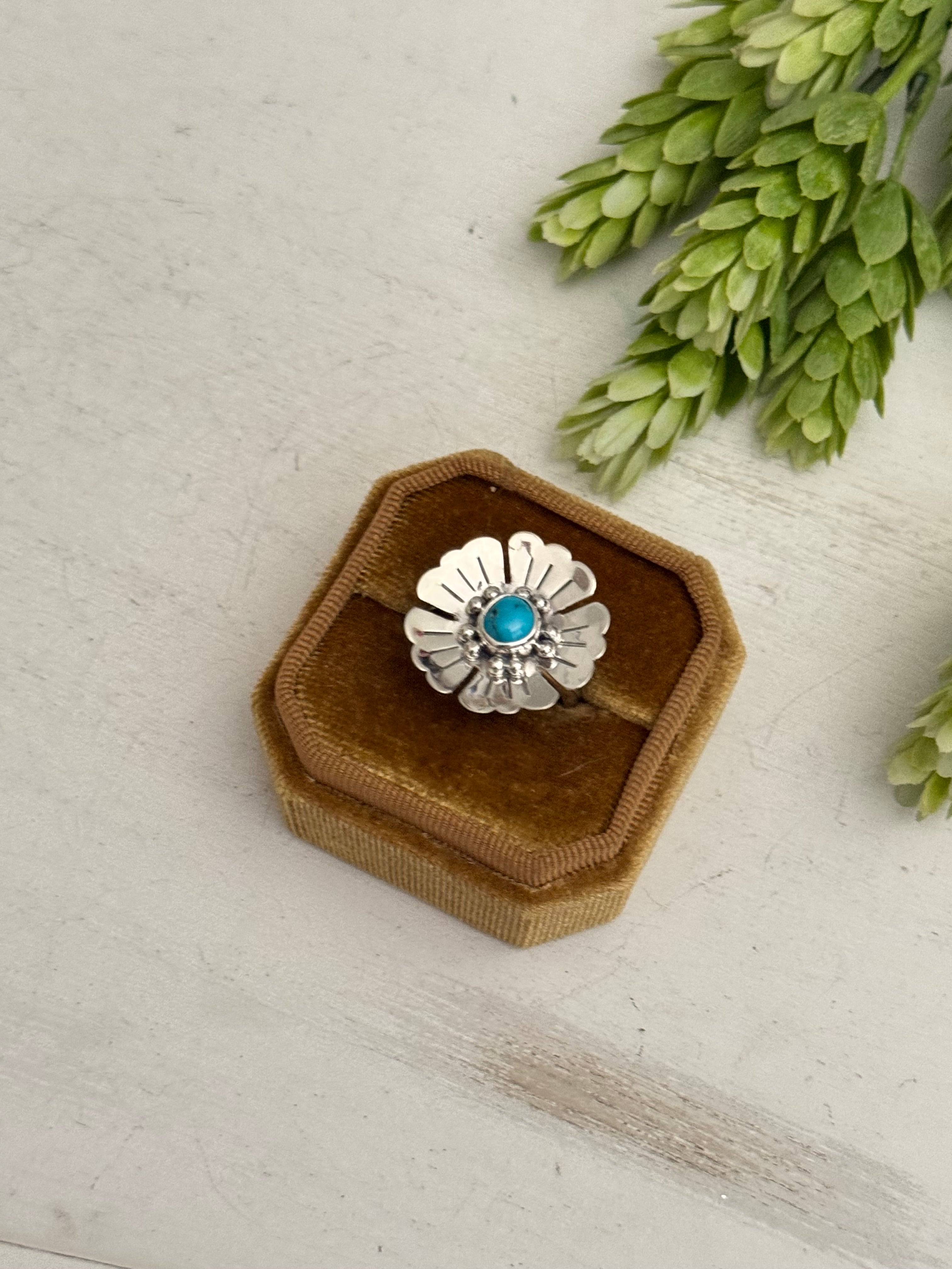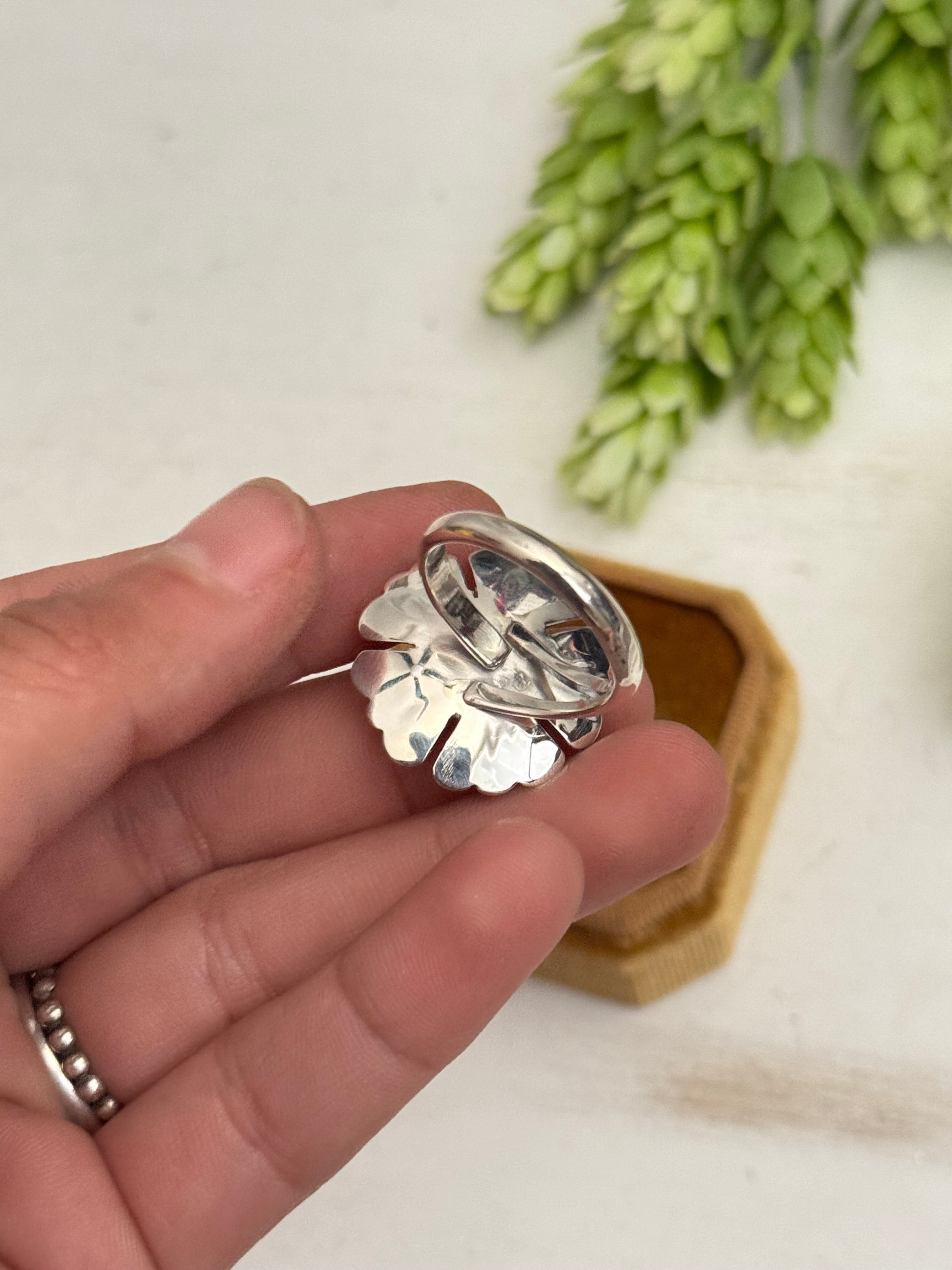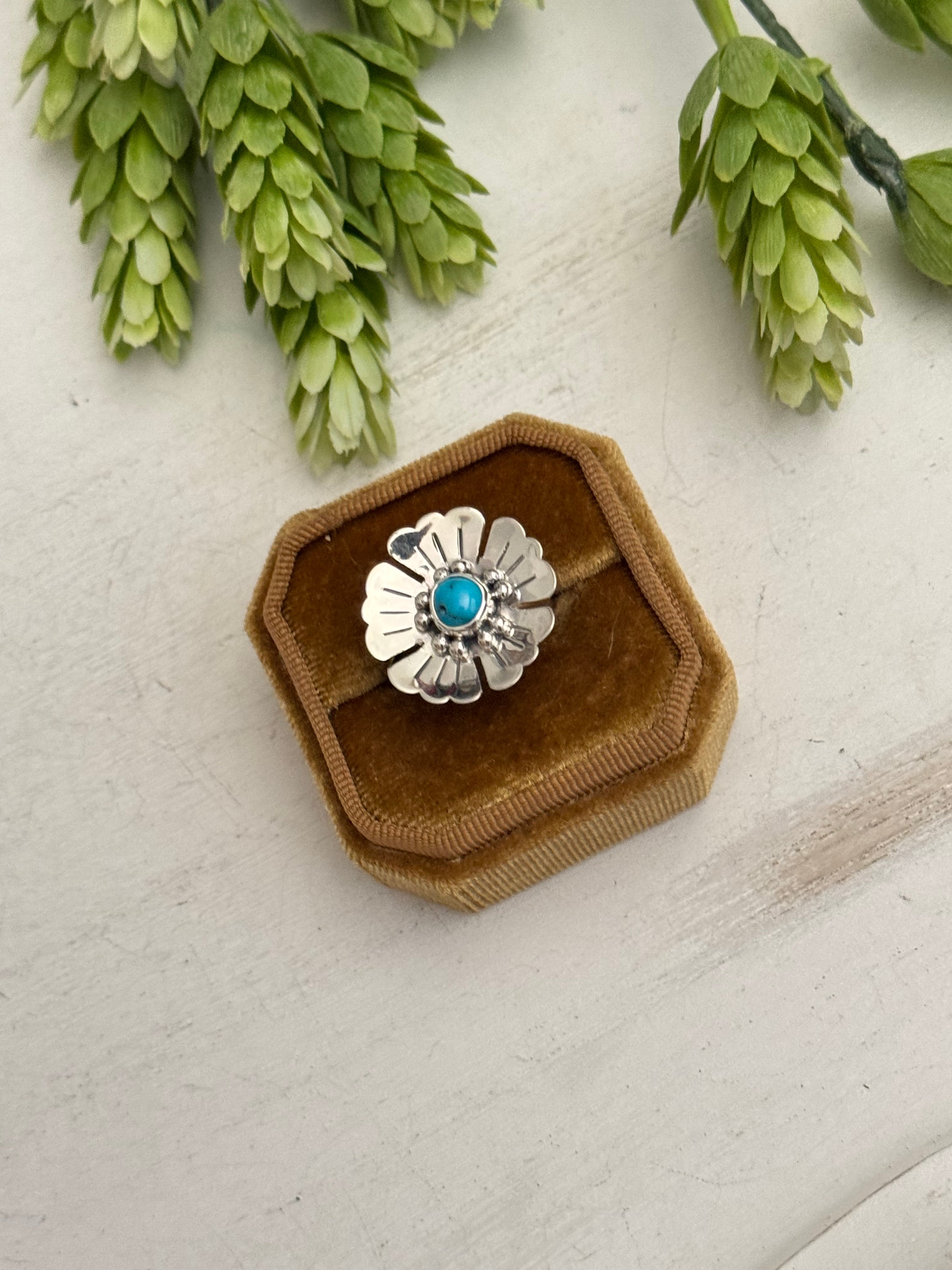 Navajo Made Kingman Turquoise & Sterling Silver Adjustable Flower Ring