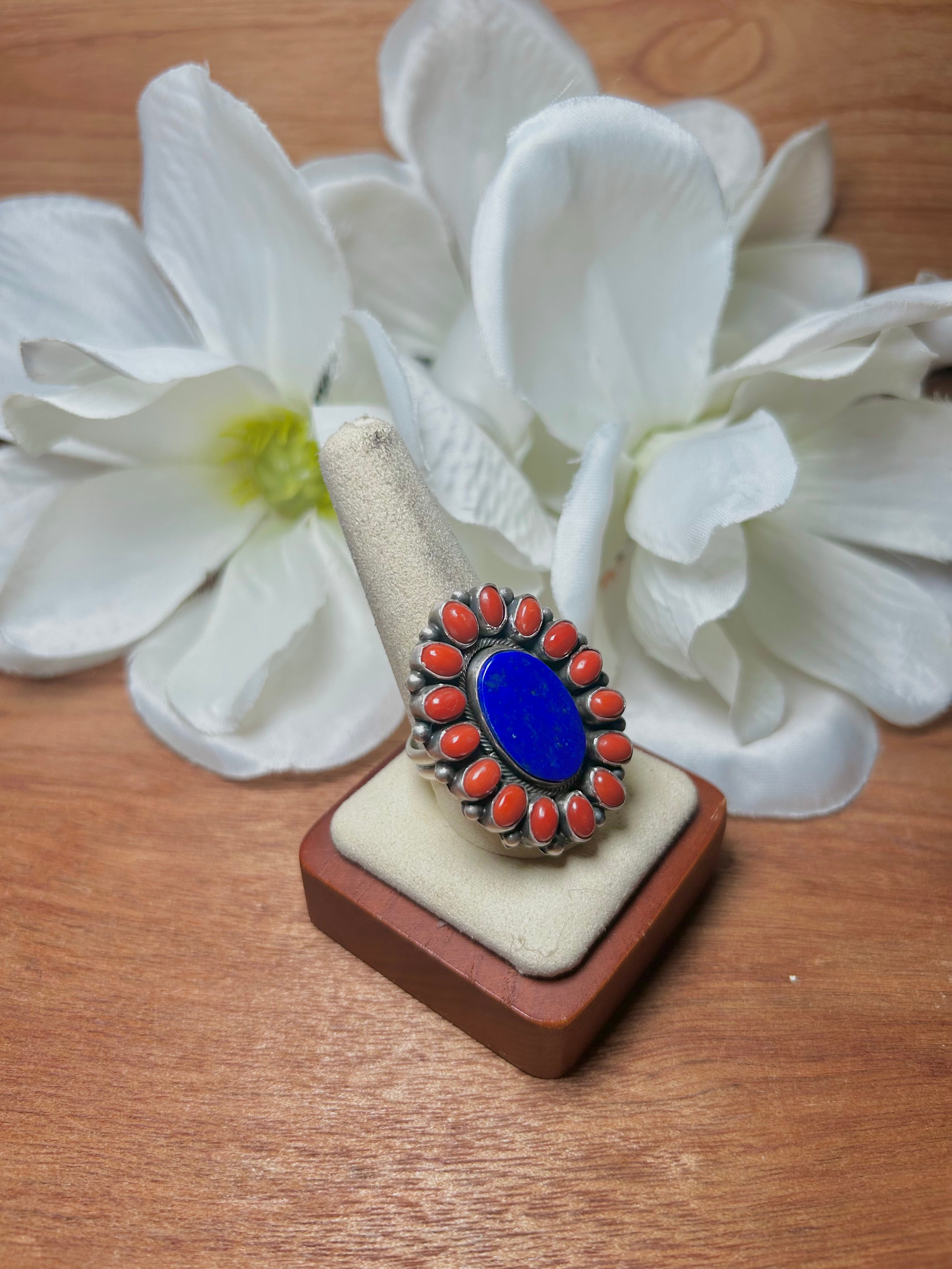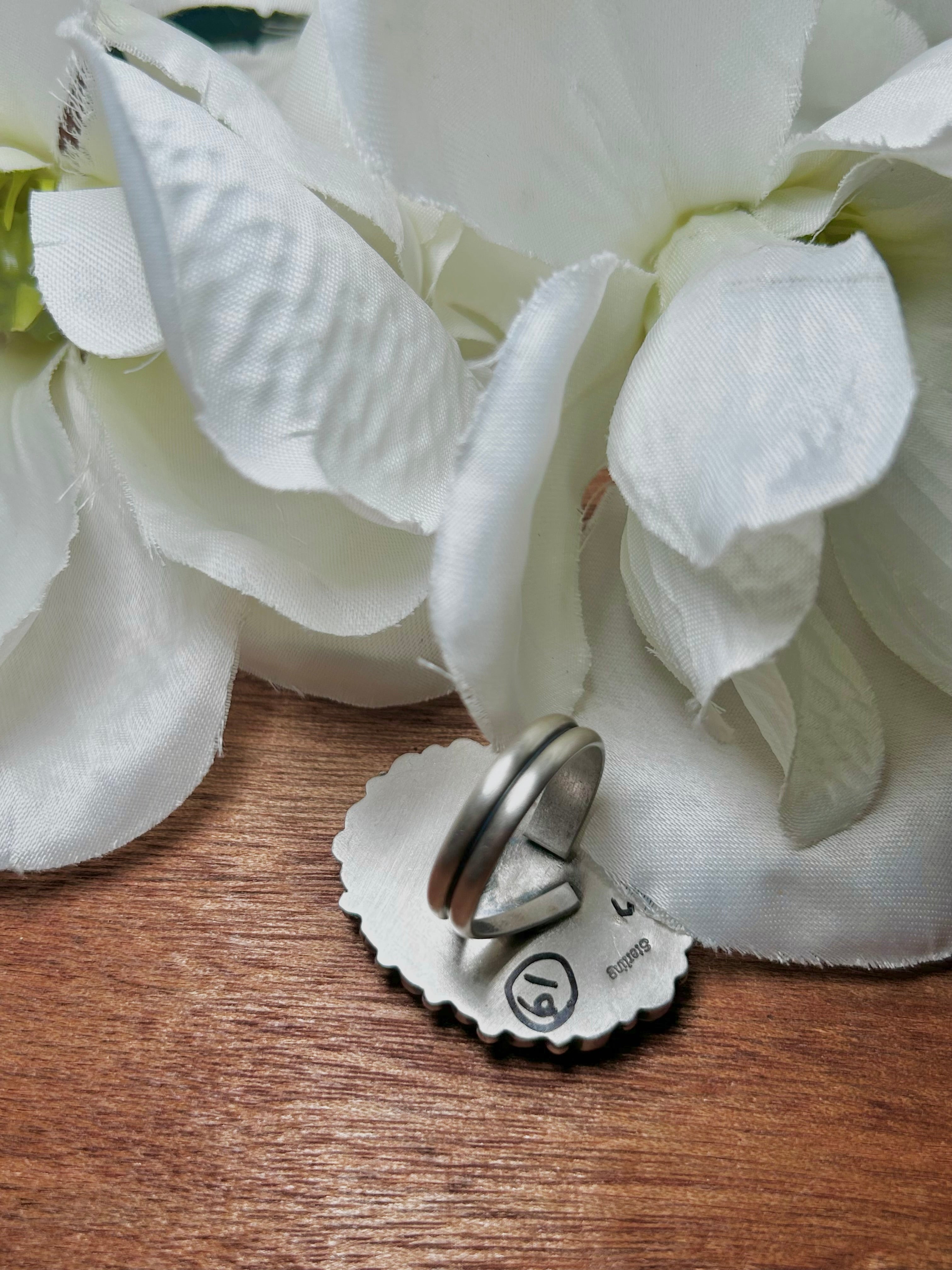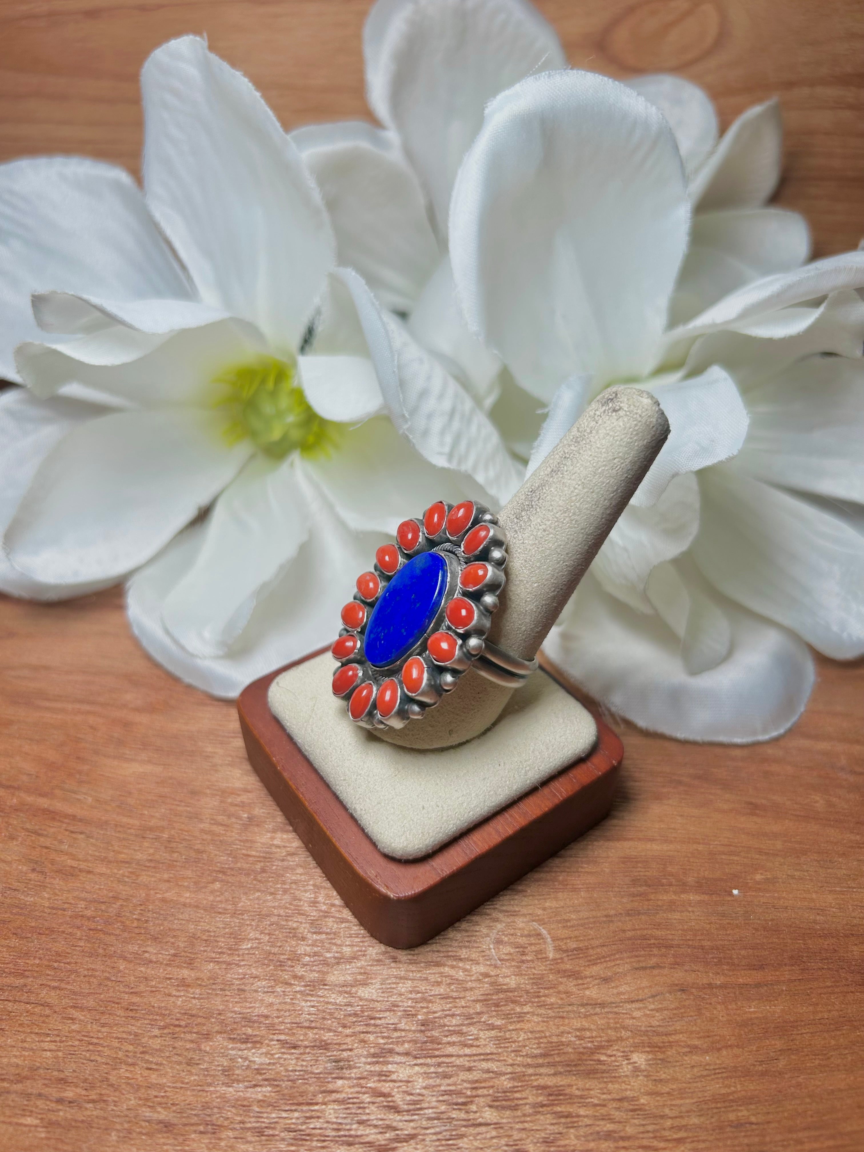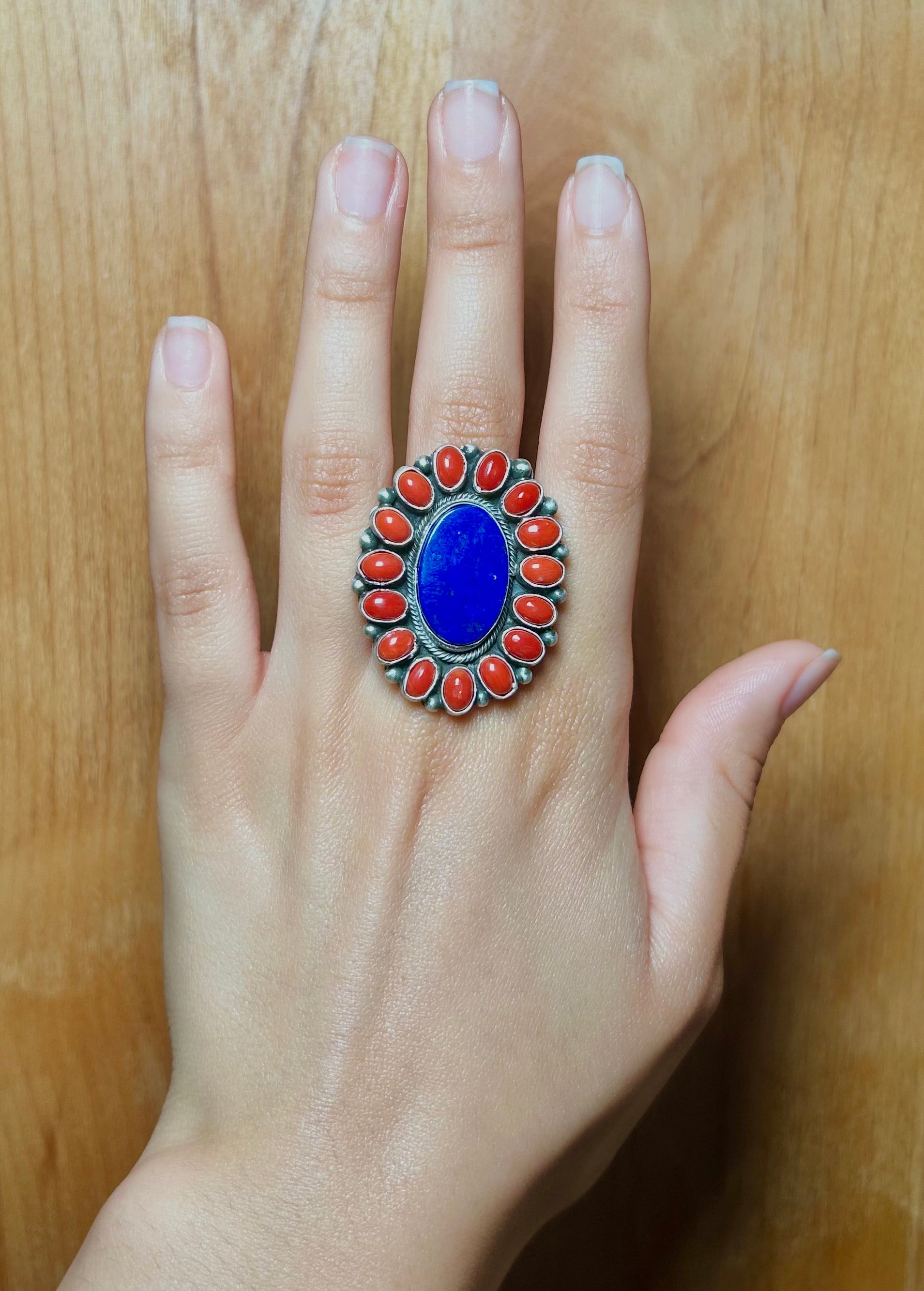 Navajo Made Multi Stone & Sterling Silver Adjustable Ring. It measures 1 1/2 inches long and 1 1/4 inches wide. Signed by the artist and stamped sterling silver.