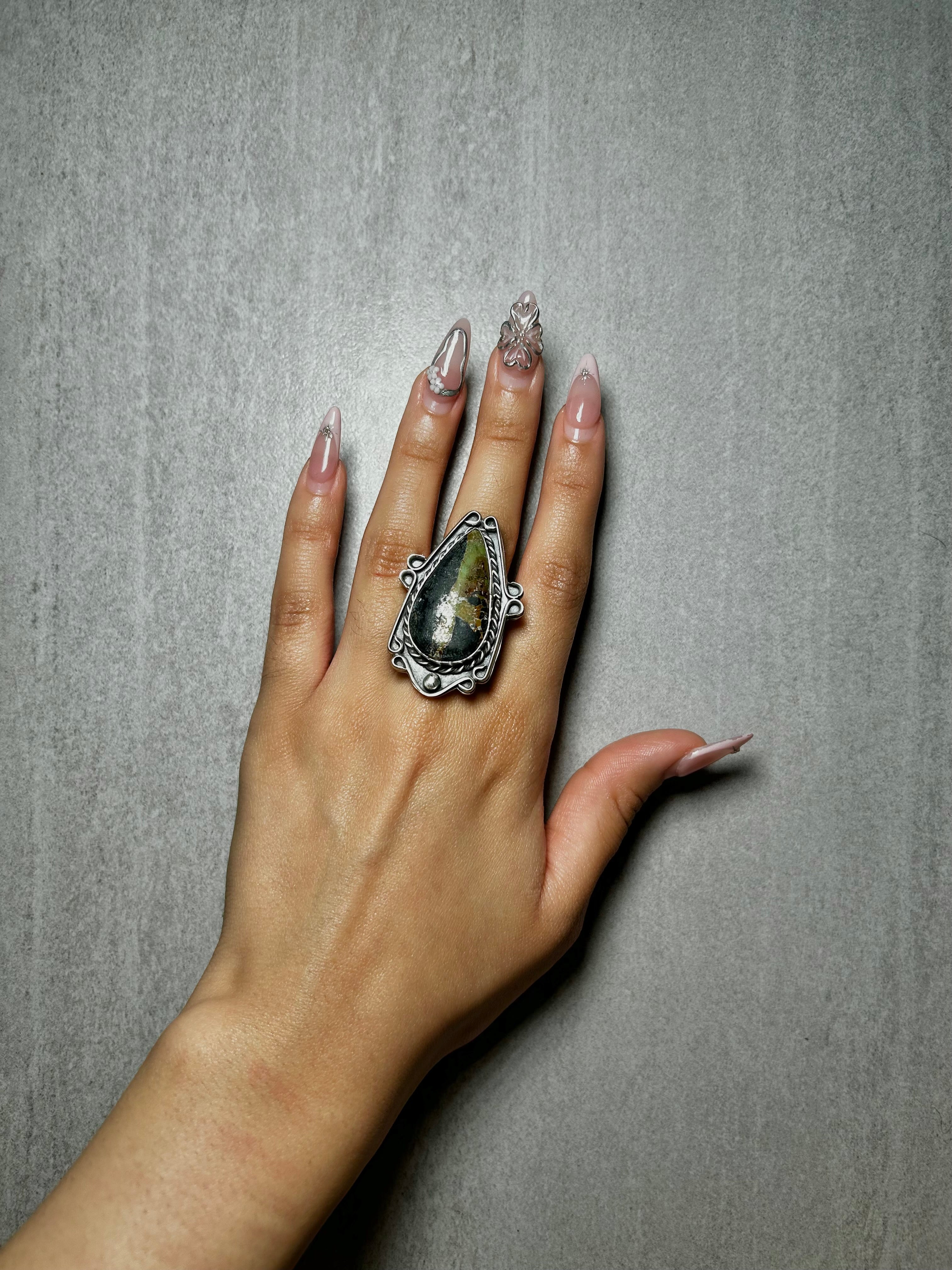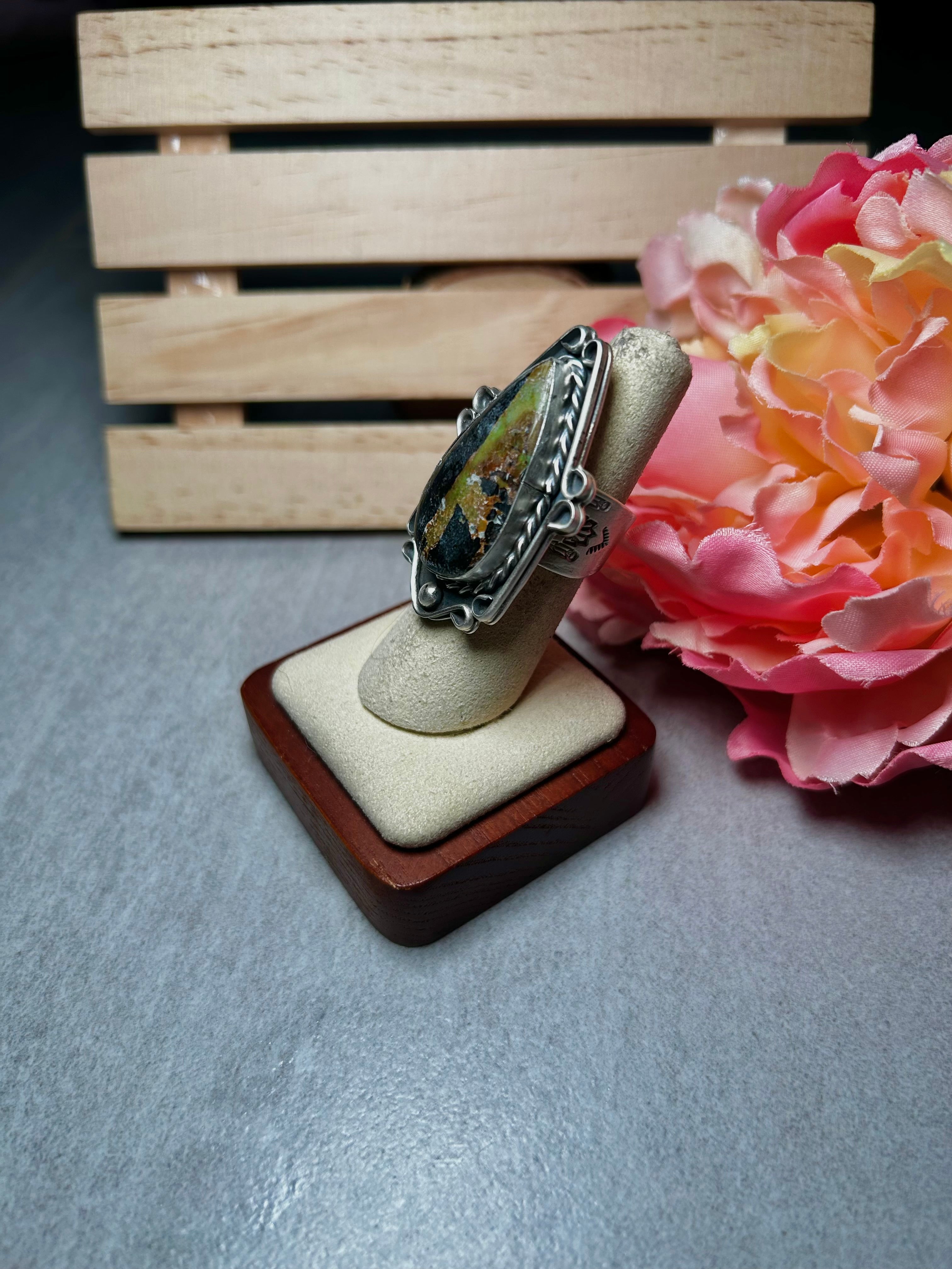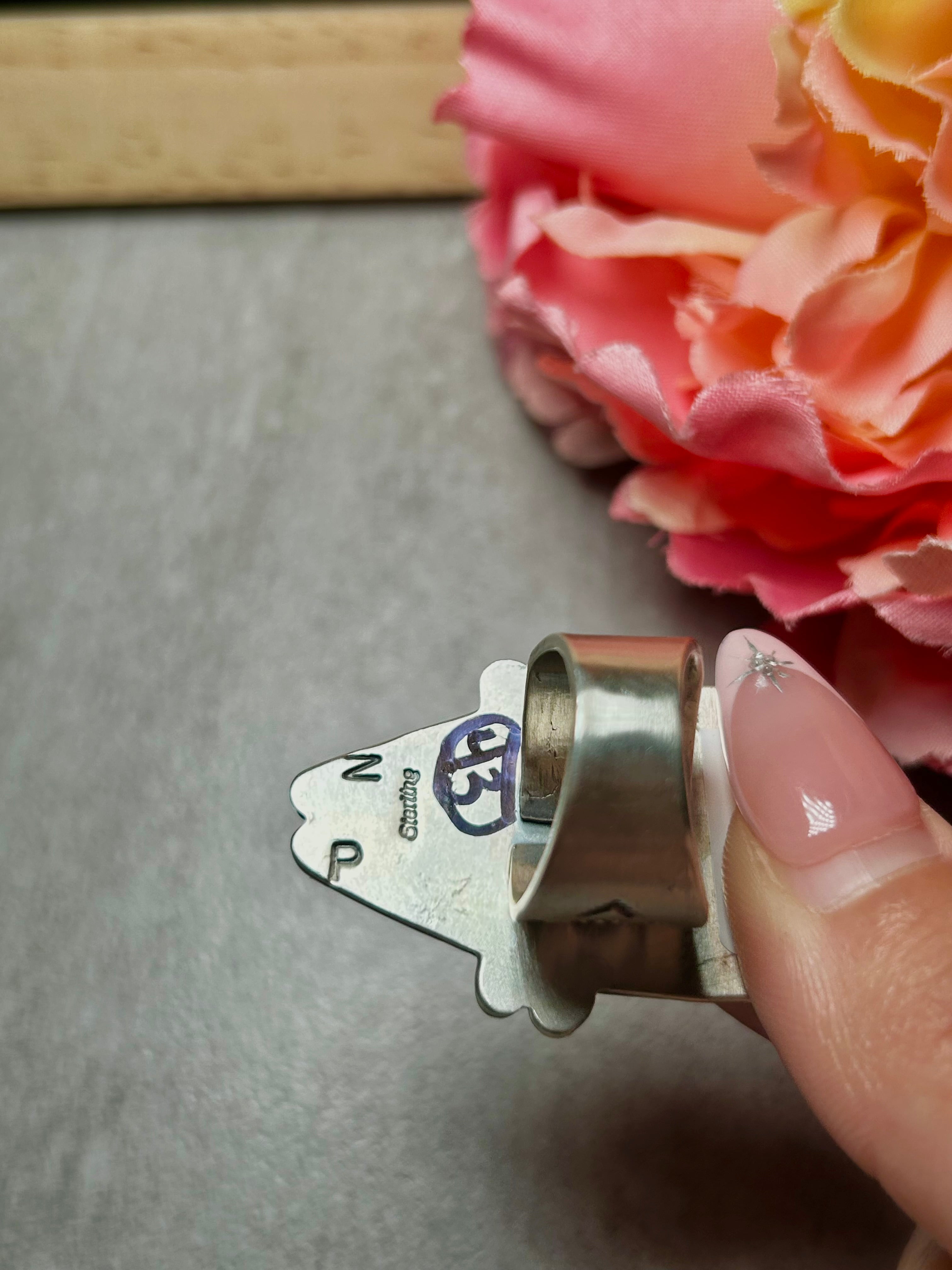 Navajo Made Black Jack Turquoise & Sterling Silver Adjustable Ring. It measures 1 3/4 inches long and 1 1/8 inches wide. Stamped sterling silver and signed.