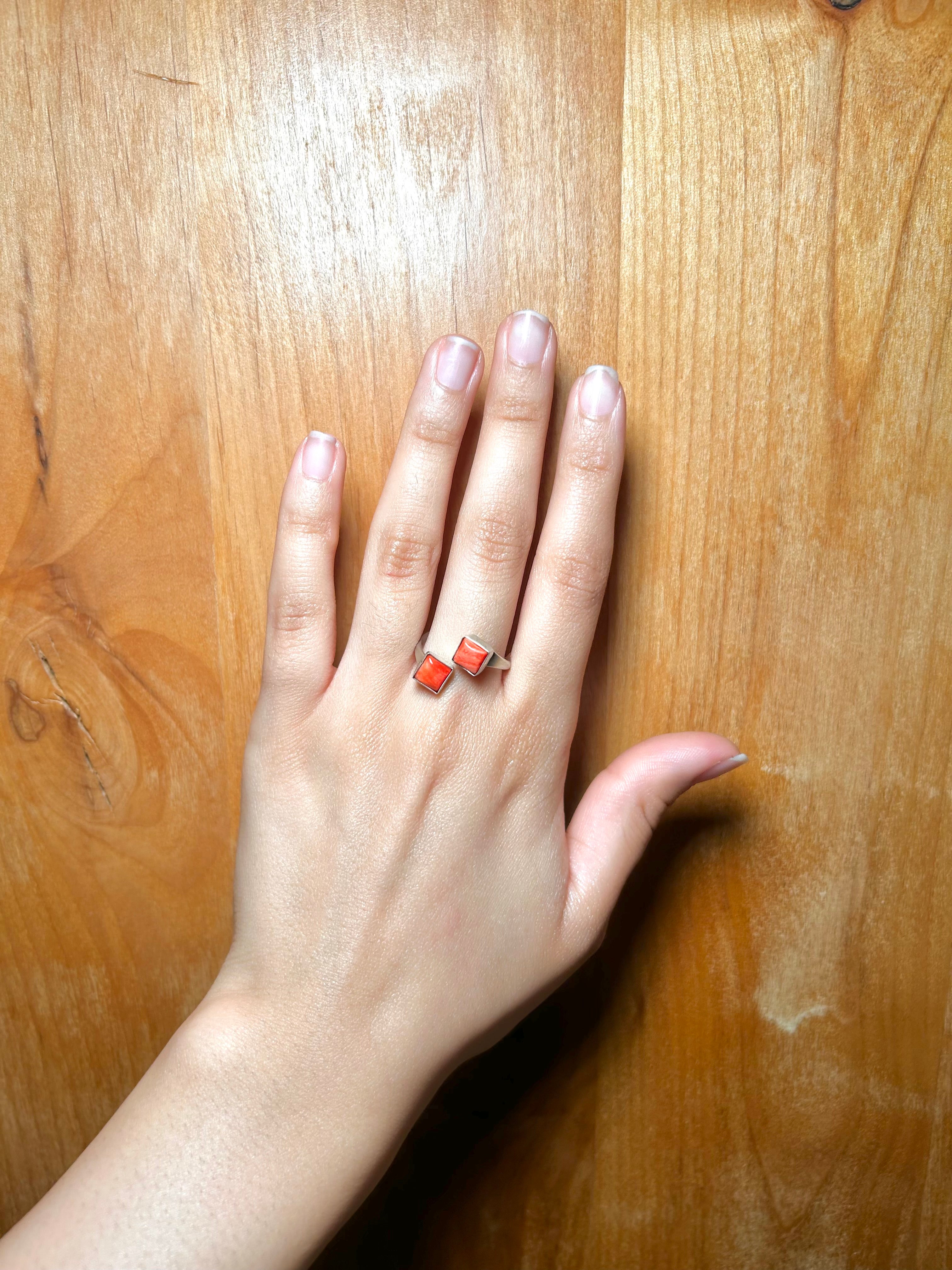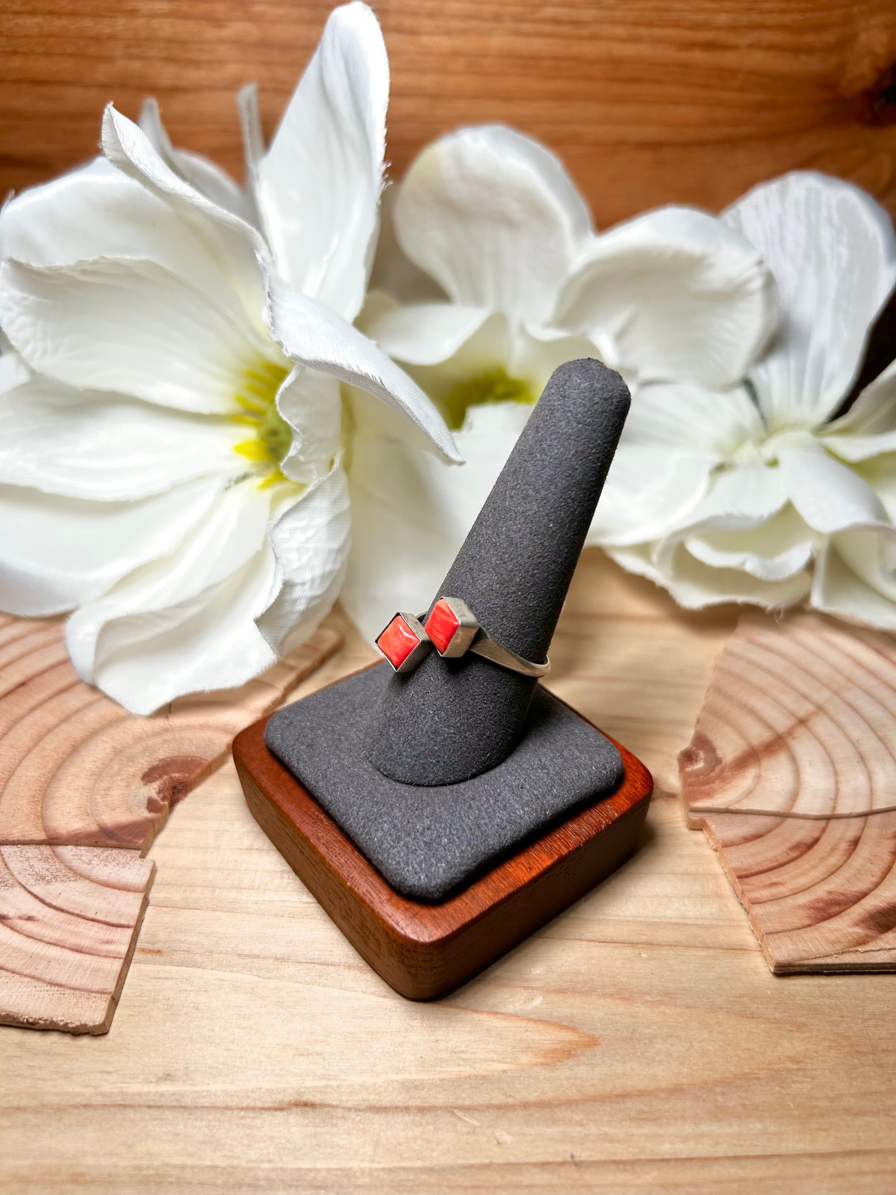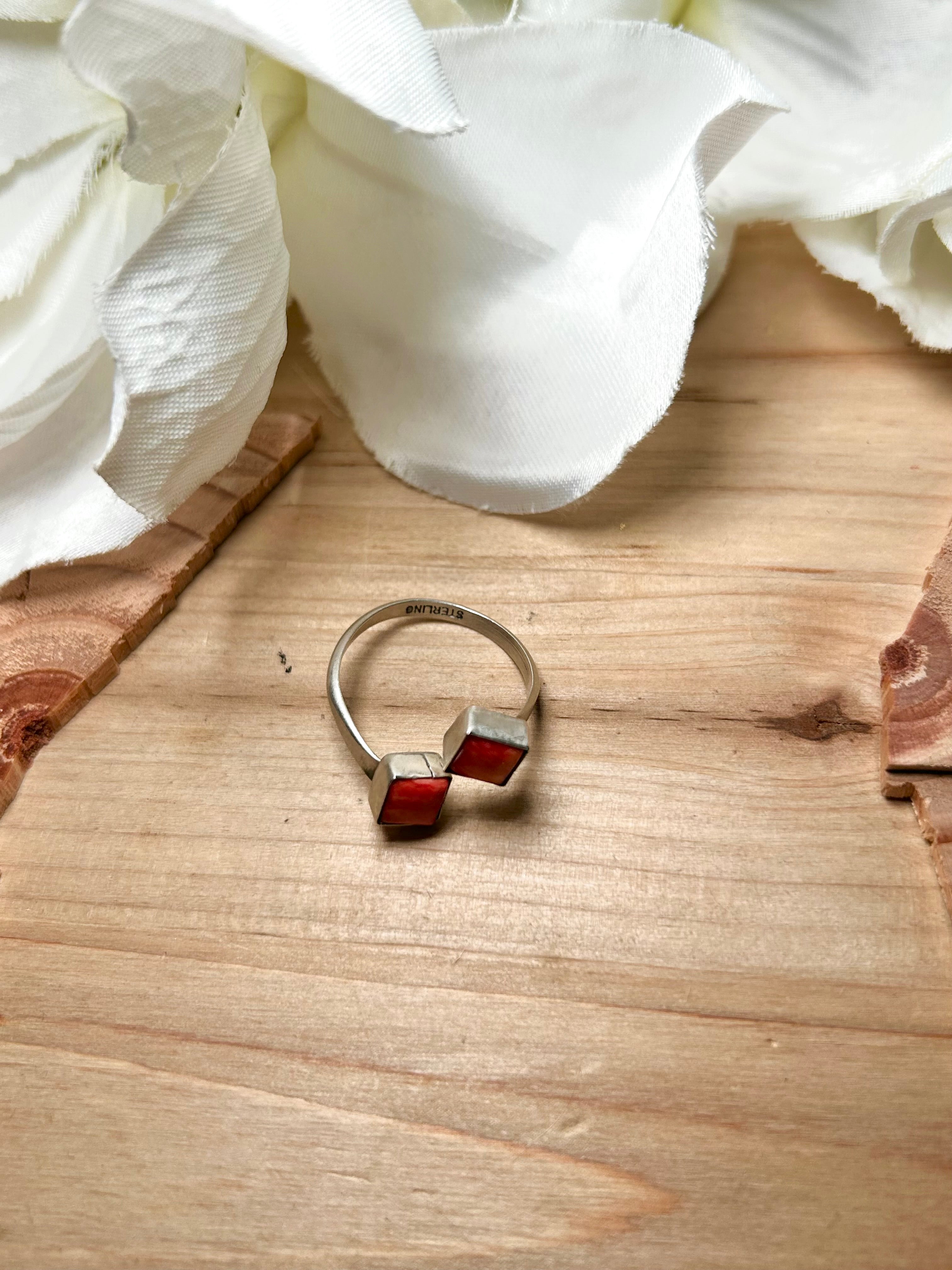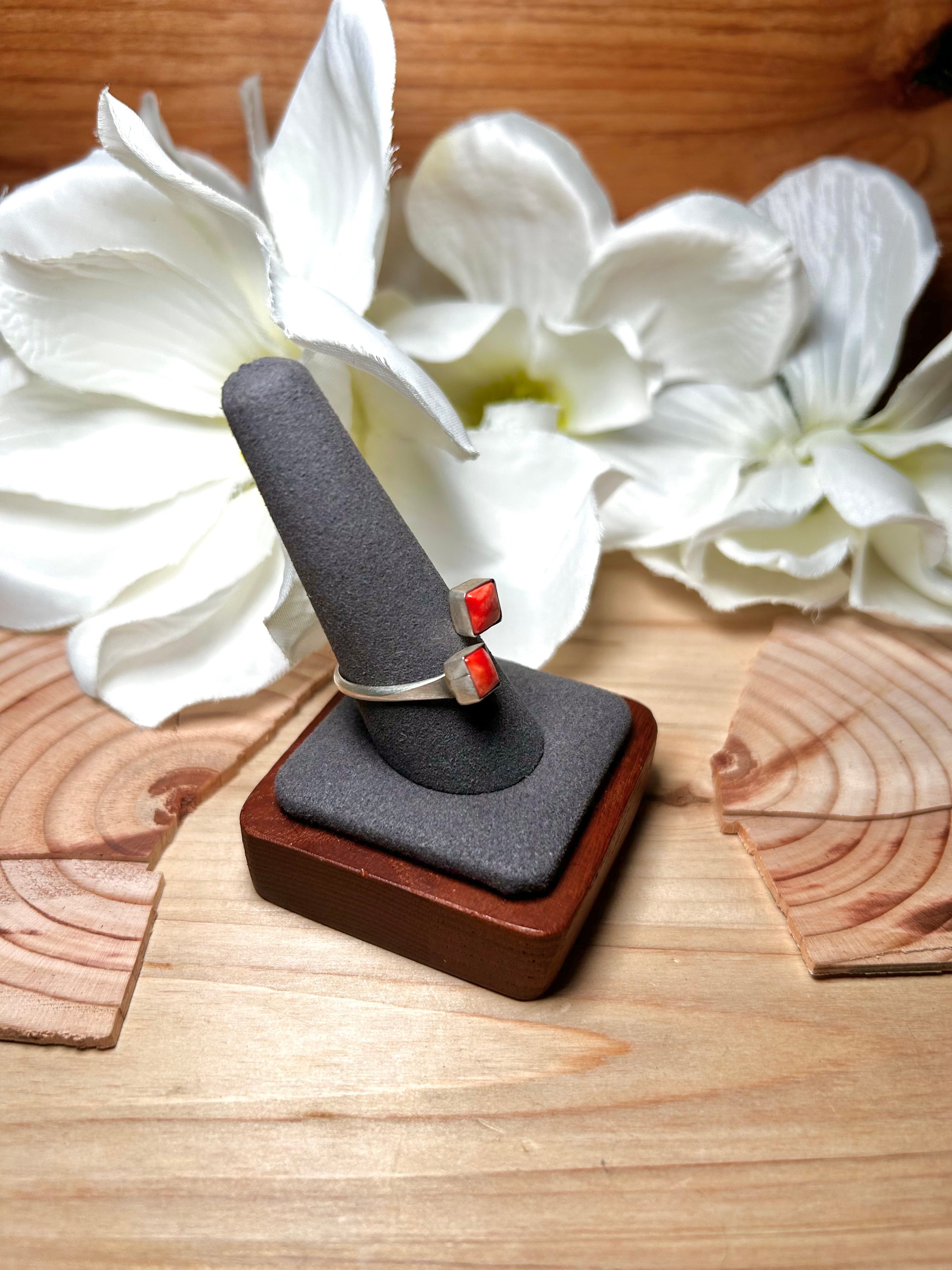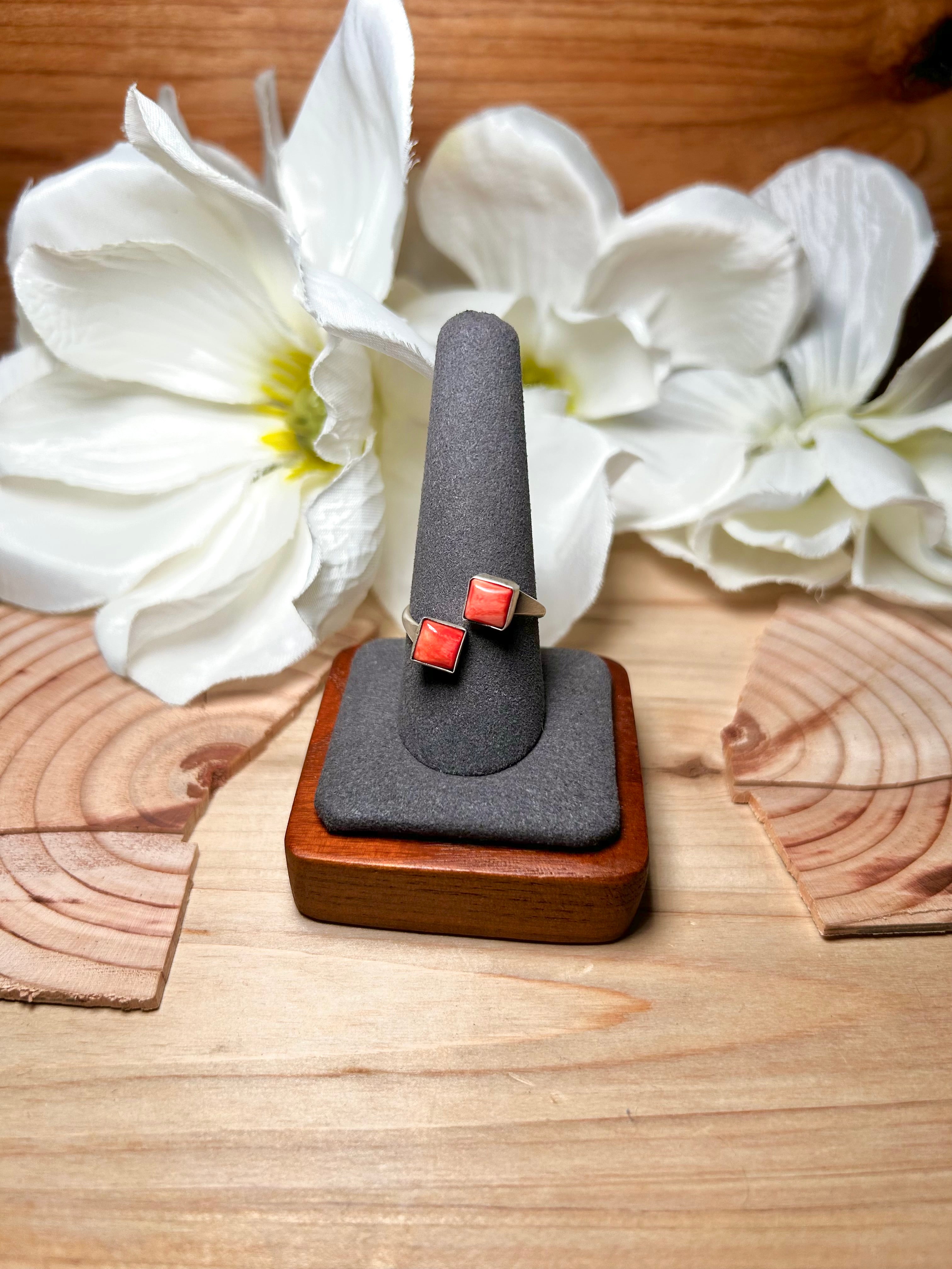 Navajo Made Spiny Oyster & Sterling Silver Adjustable Ring. It measures 3/4 of an inch long and 3/4 of an inch wide. Signed by the artist and stamped sterling silver. Stones will slightly vary due to natural stones.