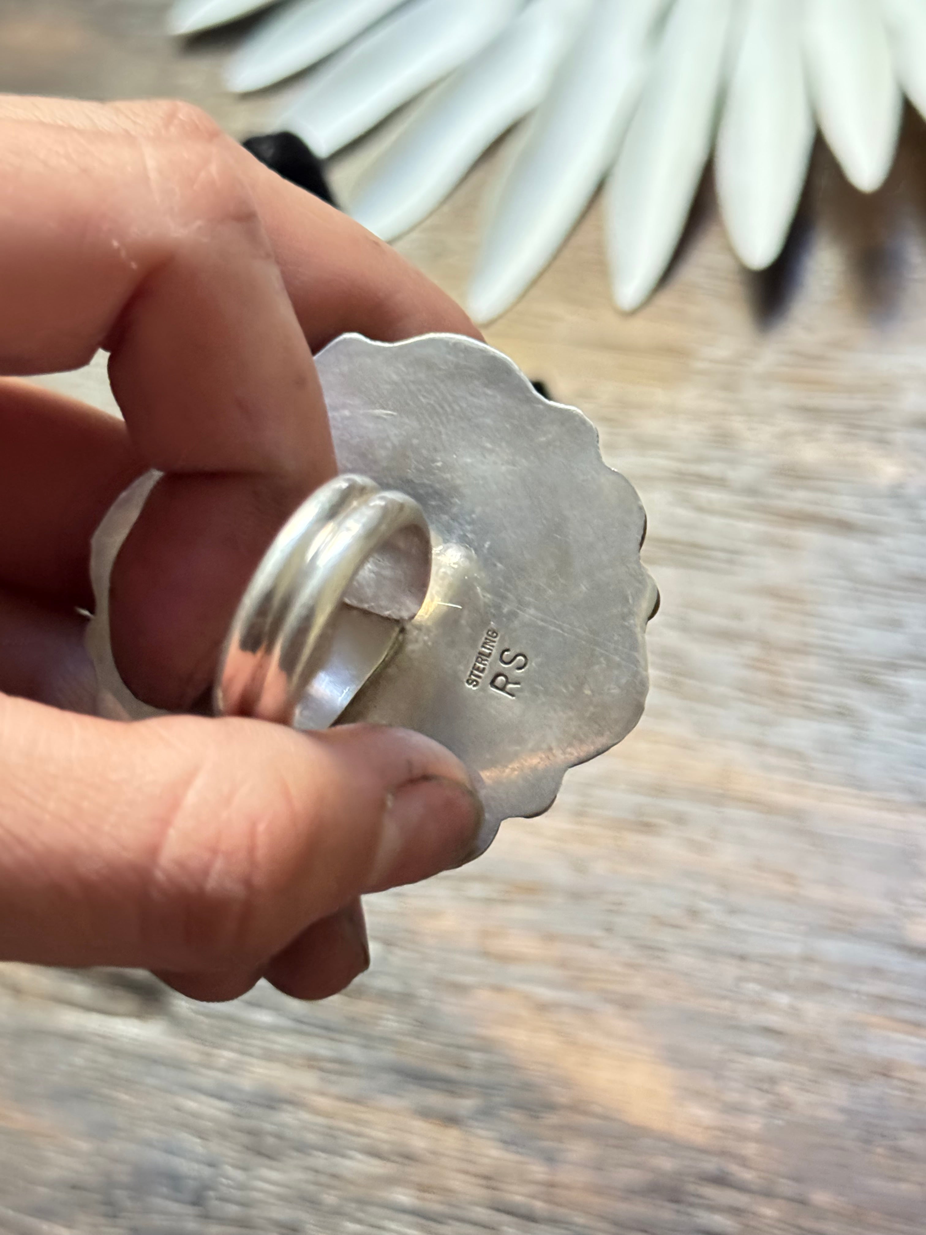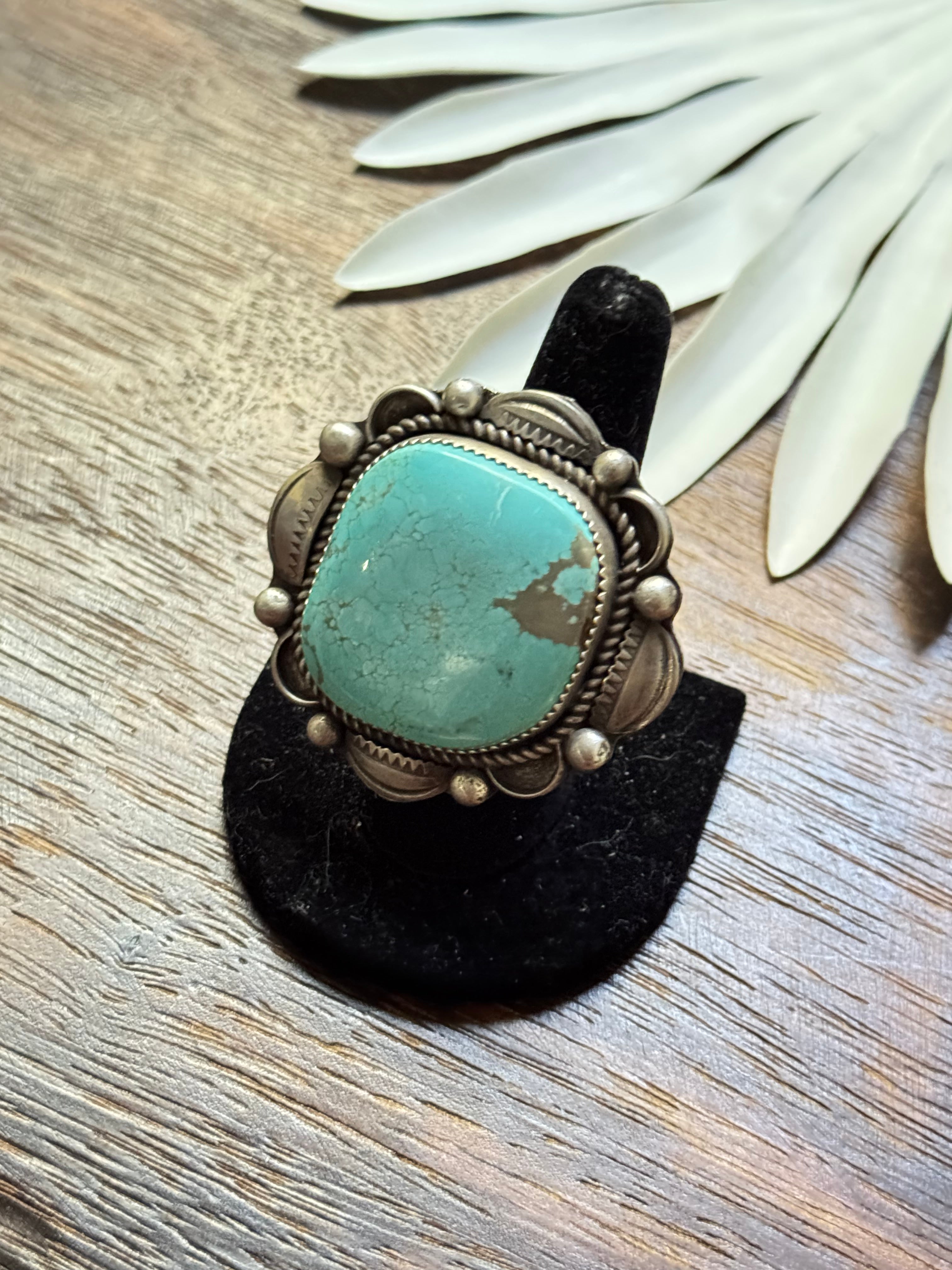 Beautiful ring.Navajo Made #8 Turquoise & Sterling Silver Adjustable Ring. It measures 1 3/4 inches long and 2 inches wide. Stamped sterling silver and signed.