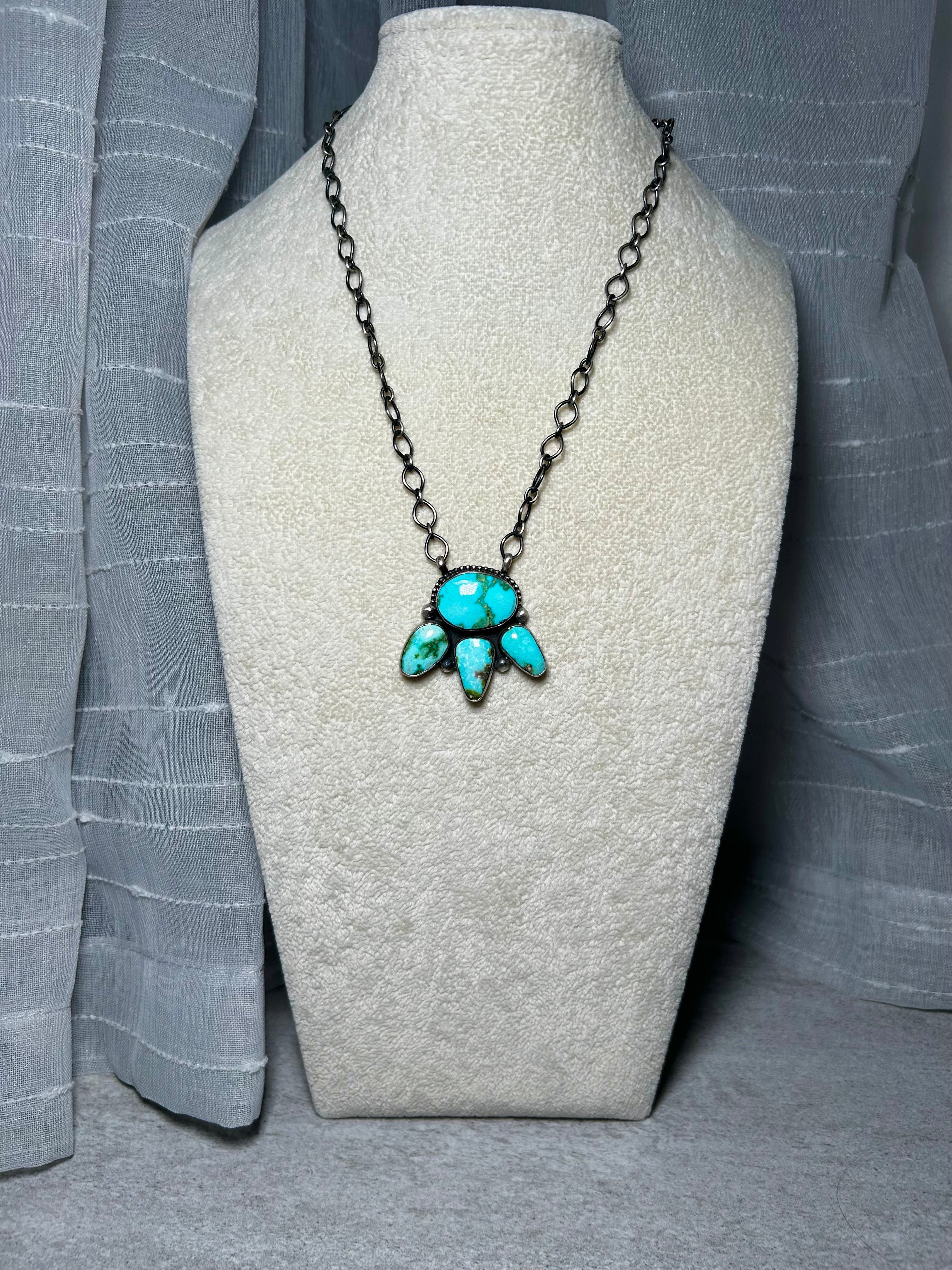 Navajo Made Sonoran Mountain Turquoise & Sterling Silver Cluster Necklace. It measures 20 inches long with hang while the chain by itself measures 17 inches long. Signed by the artist and stamped sterling silver.