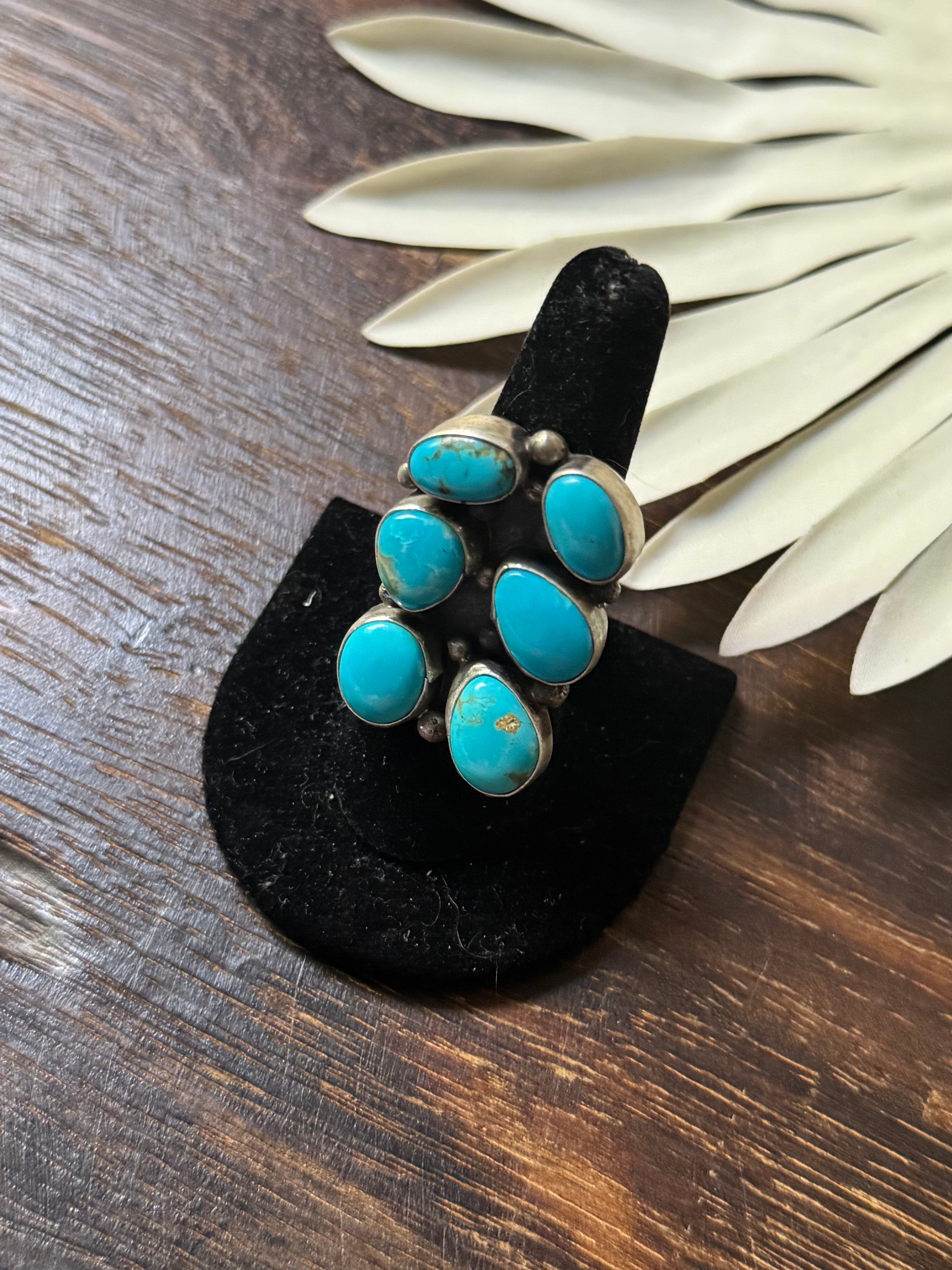Navajo Made Kingman Turquoise & Sterling Silver Cluster Ring Size 7.75