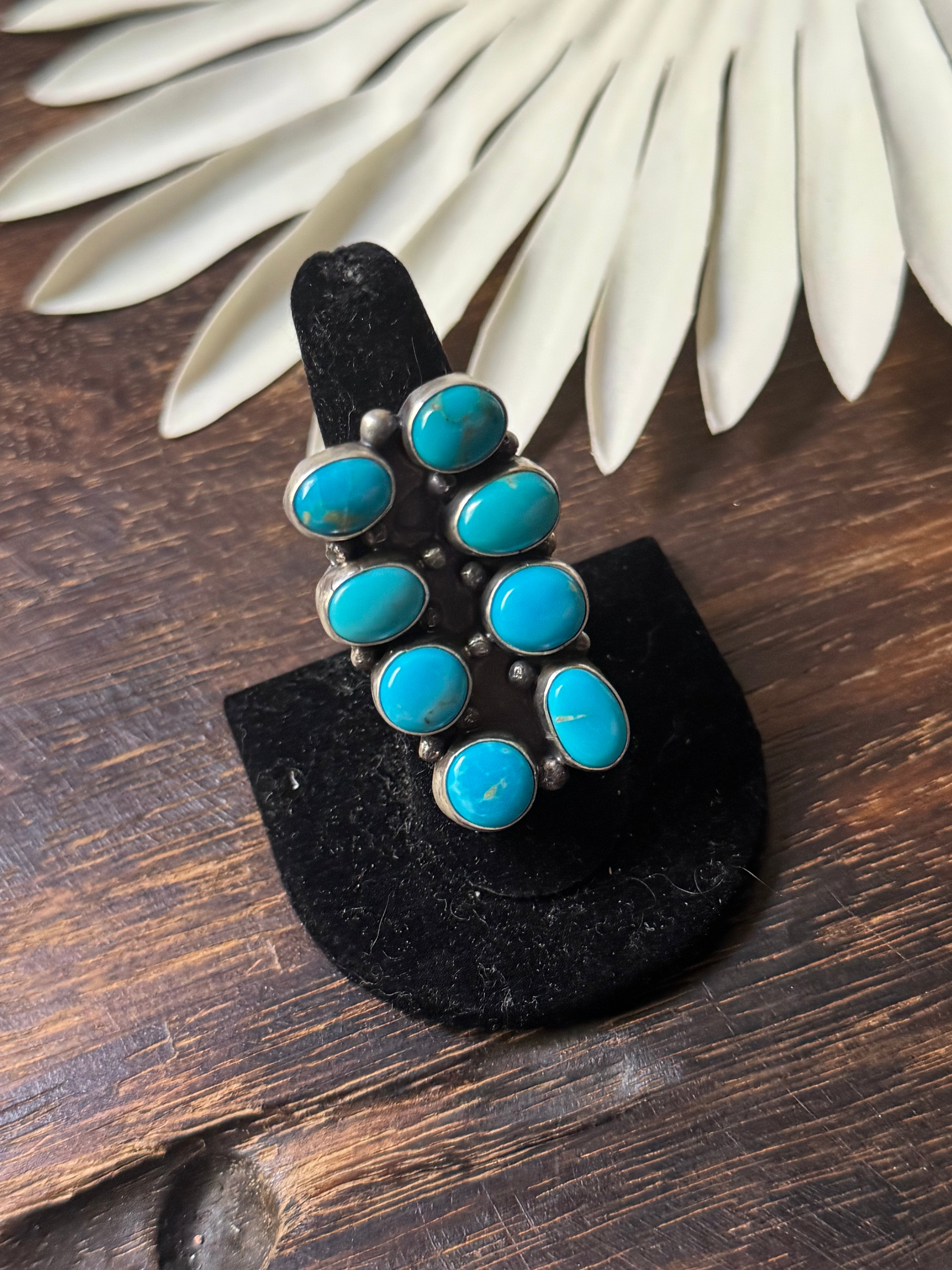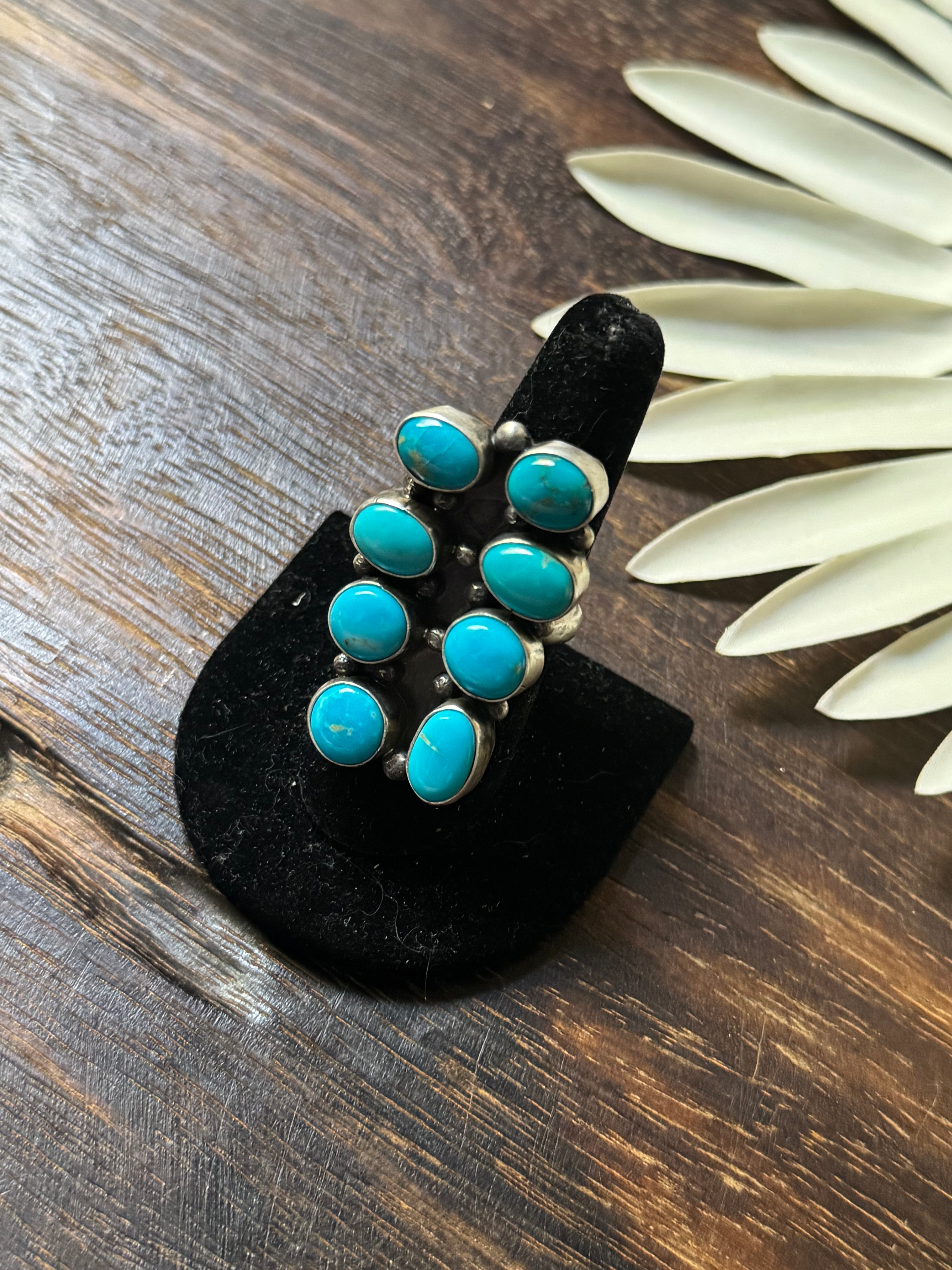 Navajo Made Kingman Turquoise & Sterling Silver Cluster Ring Size 8.25