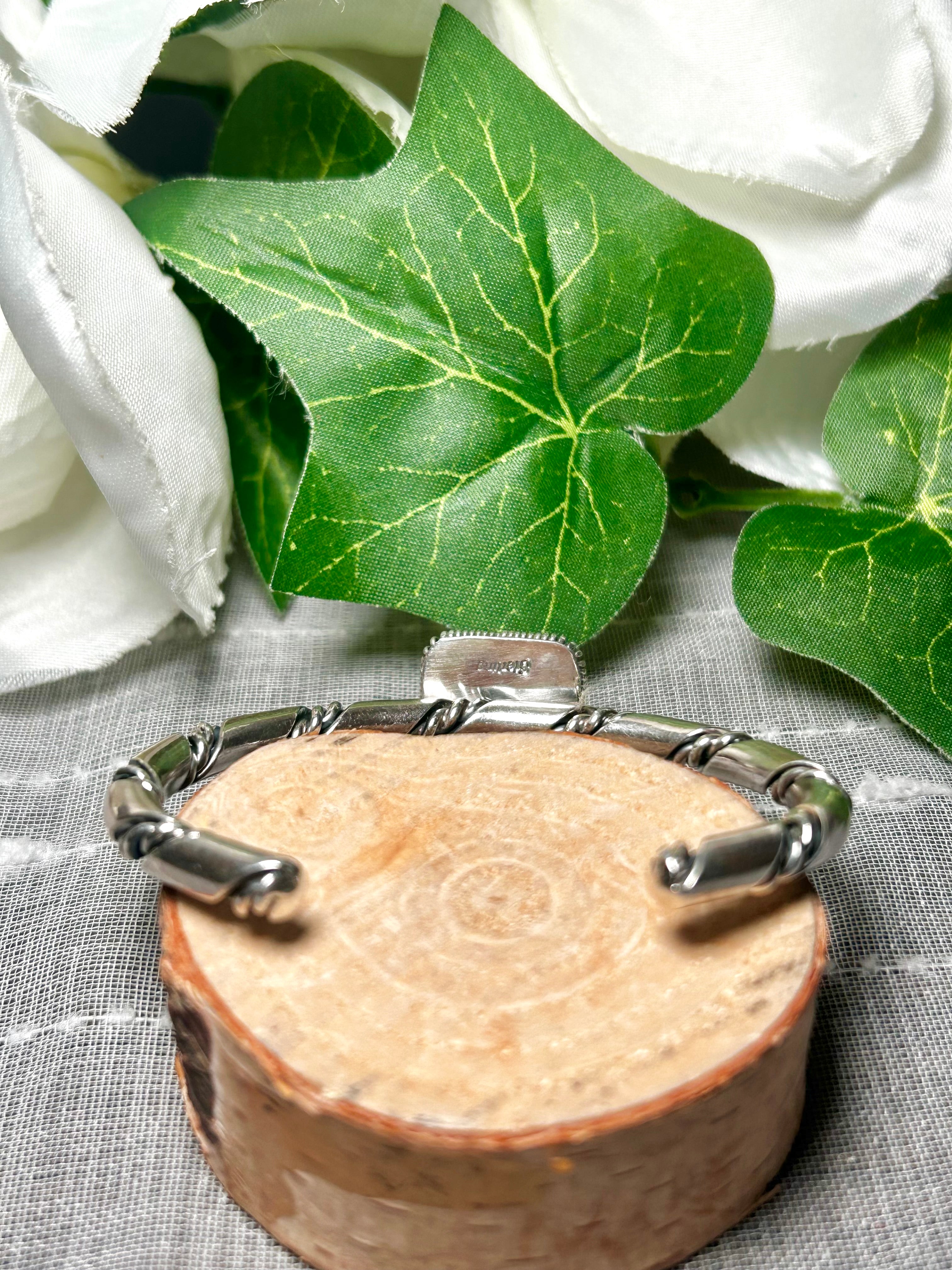 Wydell Billie Kingman Turquoise & Sterling Silver Cuff Bracelet. It measures 5/8 of an inch wide with an inside circumference of 5 1/8 inches and a gap of 1 inch. Signed by the artist and stamped sterling silver.