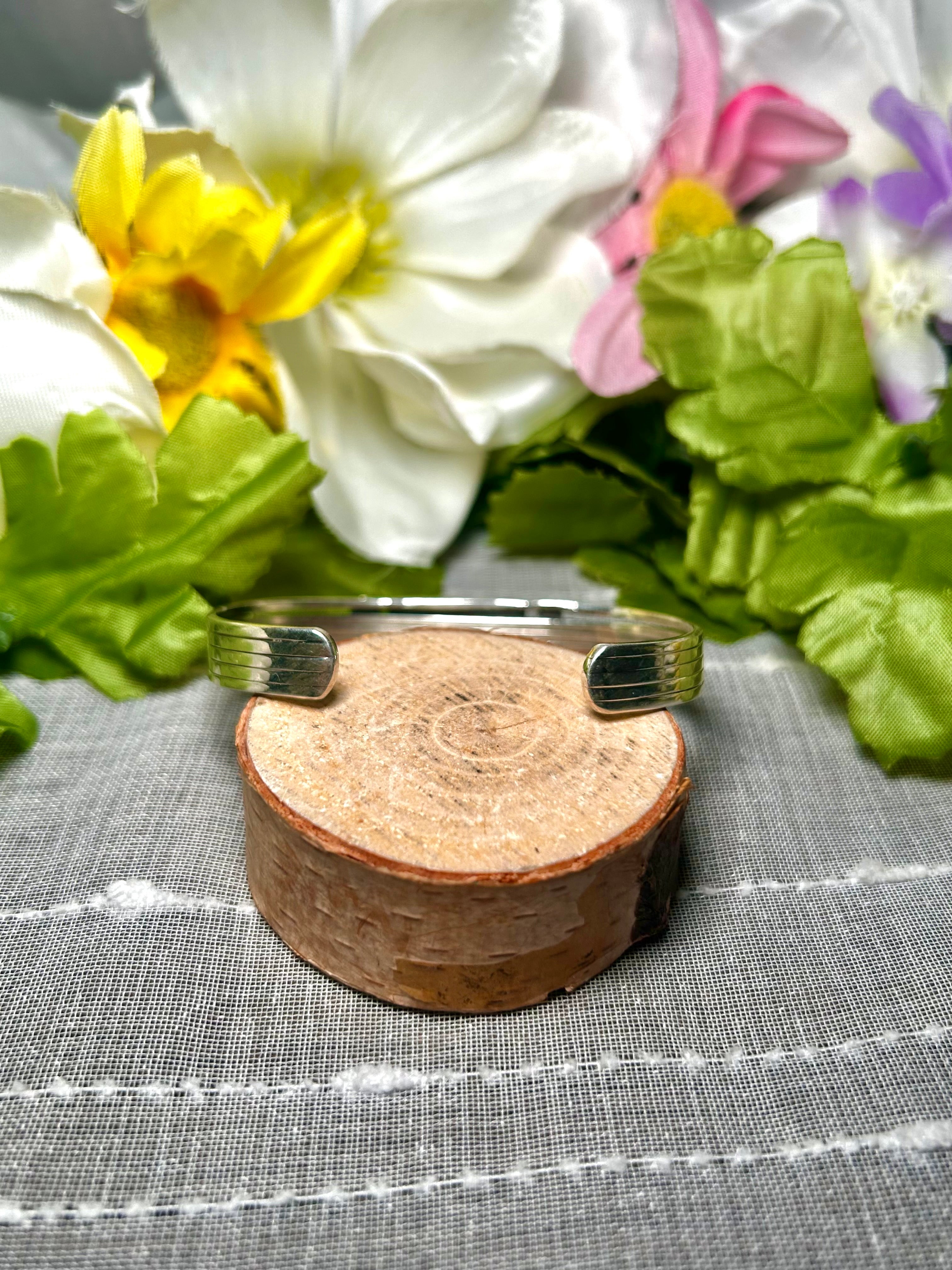 Navajo Made Kingman Turquoise & Sterling Silver Cuff Bracelet. It measures 3/8 of an inch wide with an inside circumference of 5 3/8 inches and a gap of 1 1/8 inches. Signed by the artist and stamped sterling silver.