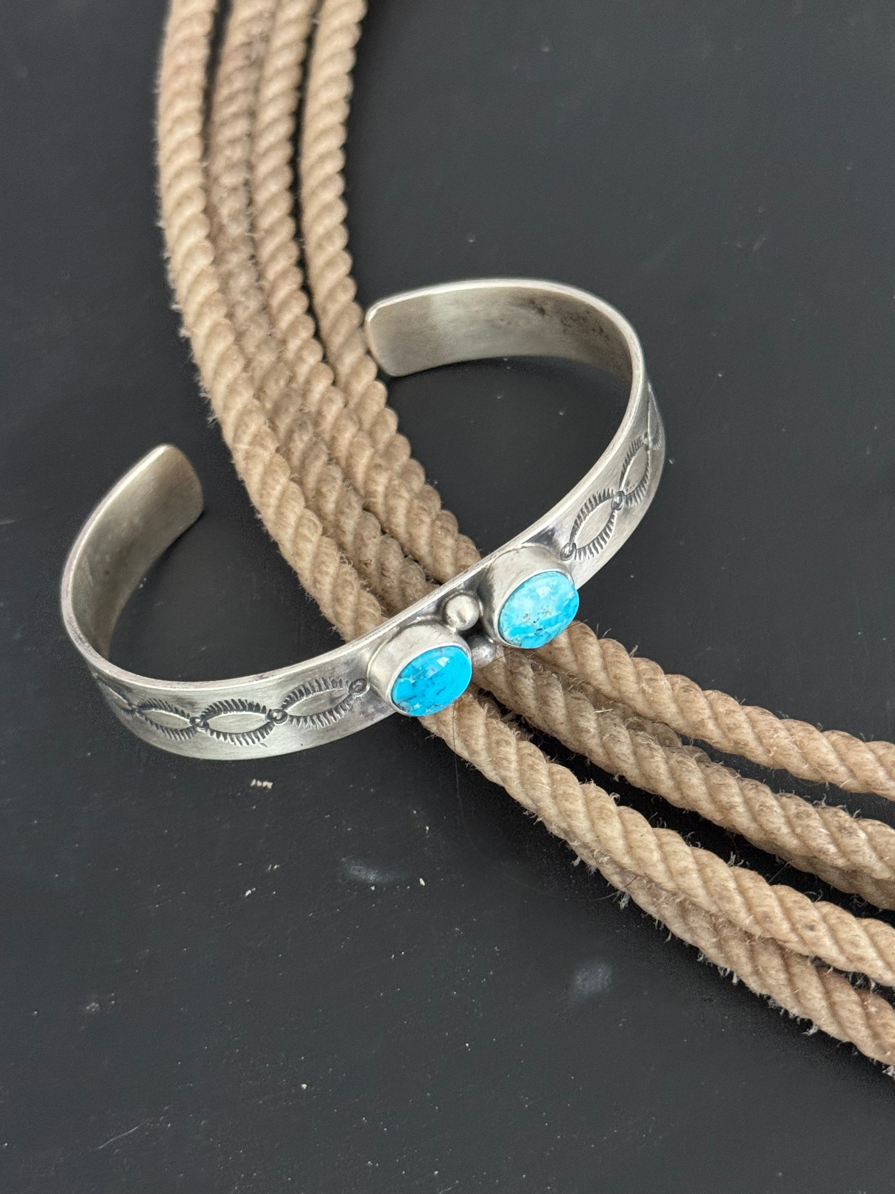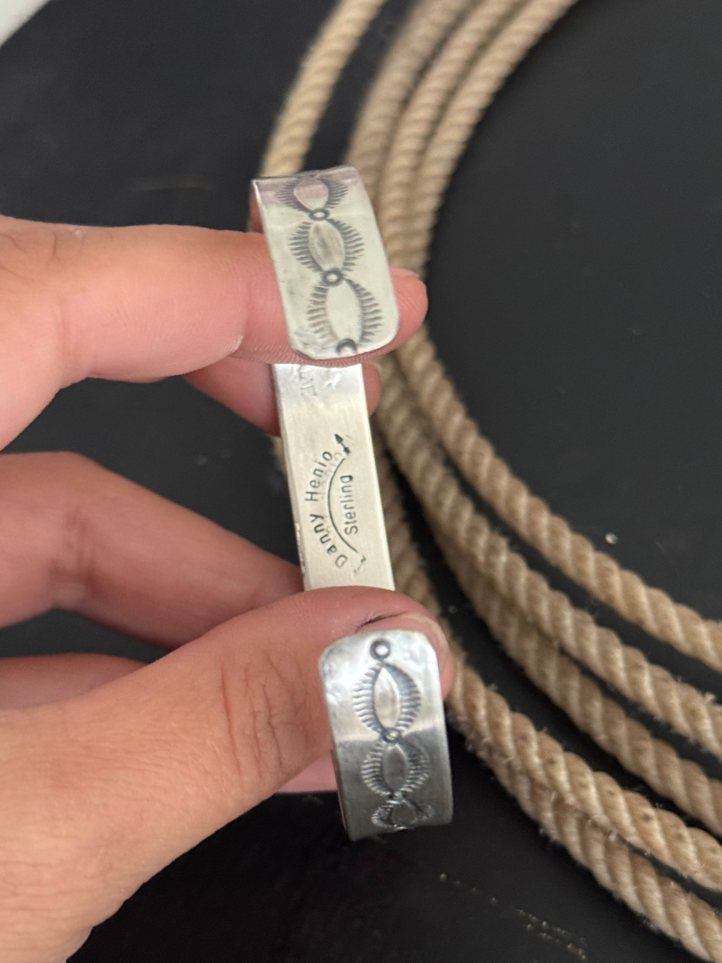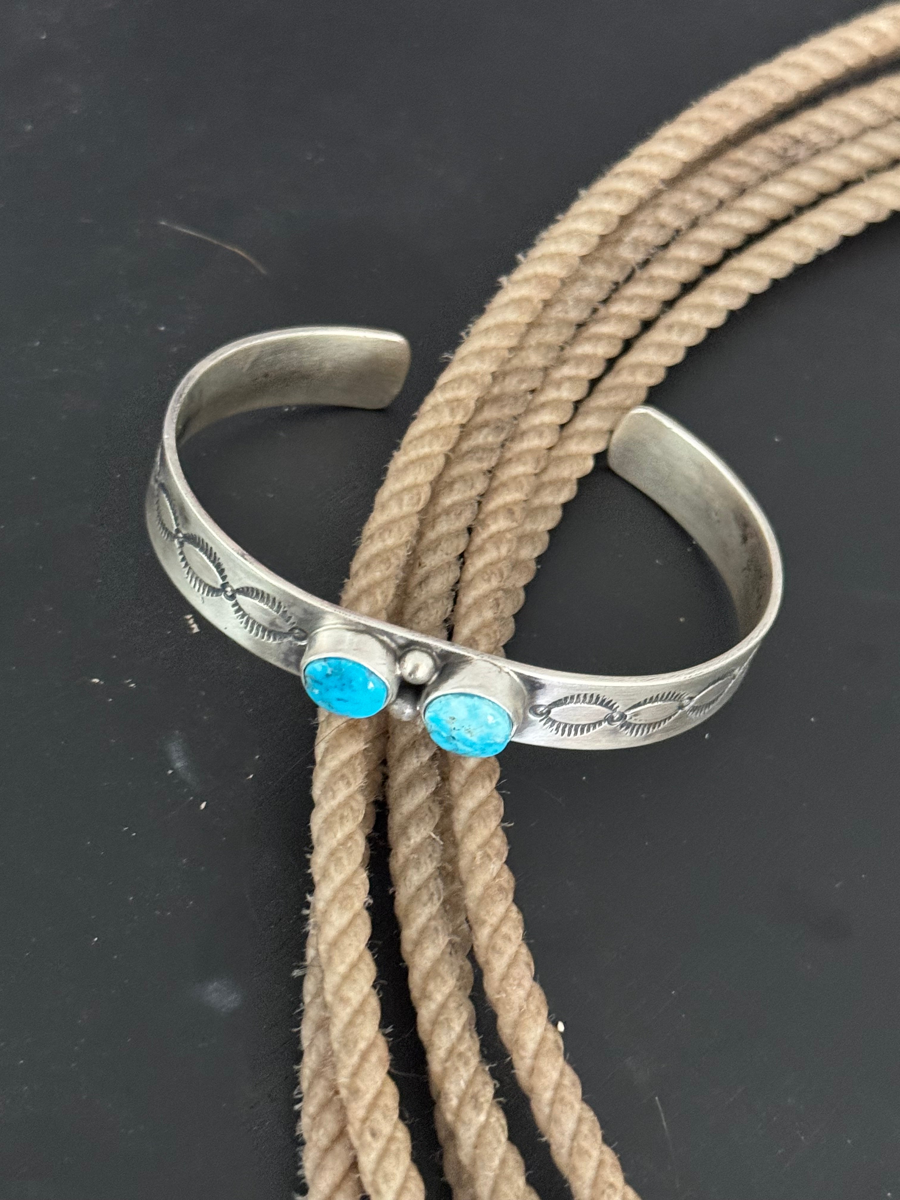 Danny Henio Blue Ridge Turquoise & Sterling Silver Cuff Bracelet. It measures 3/8 of an inch wide with an inside circumference of 5 3/4 inches and a gap of 1 inch. Stamped sterling silver and signed by the artist.