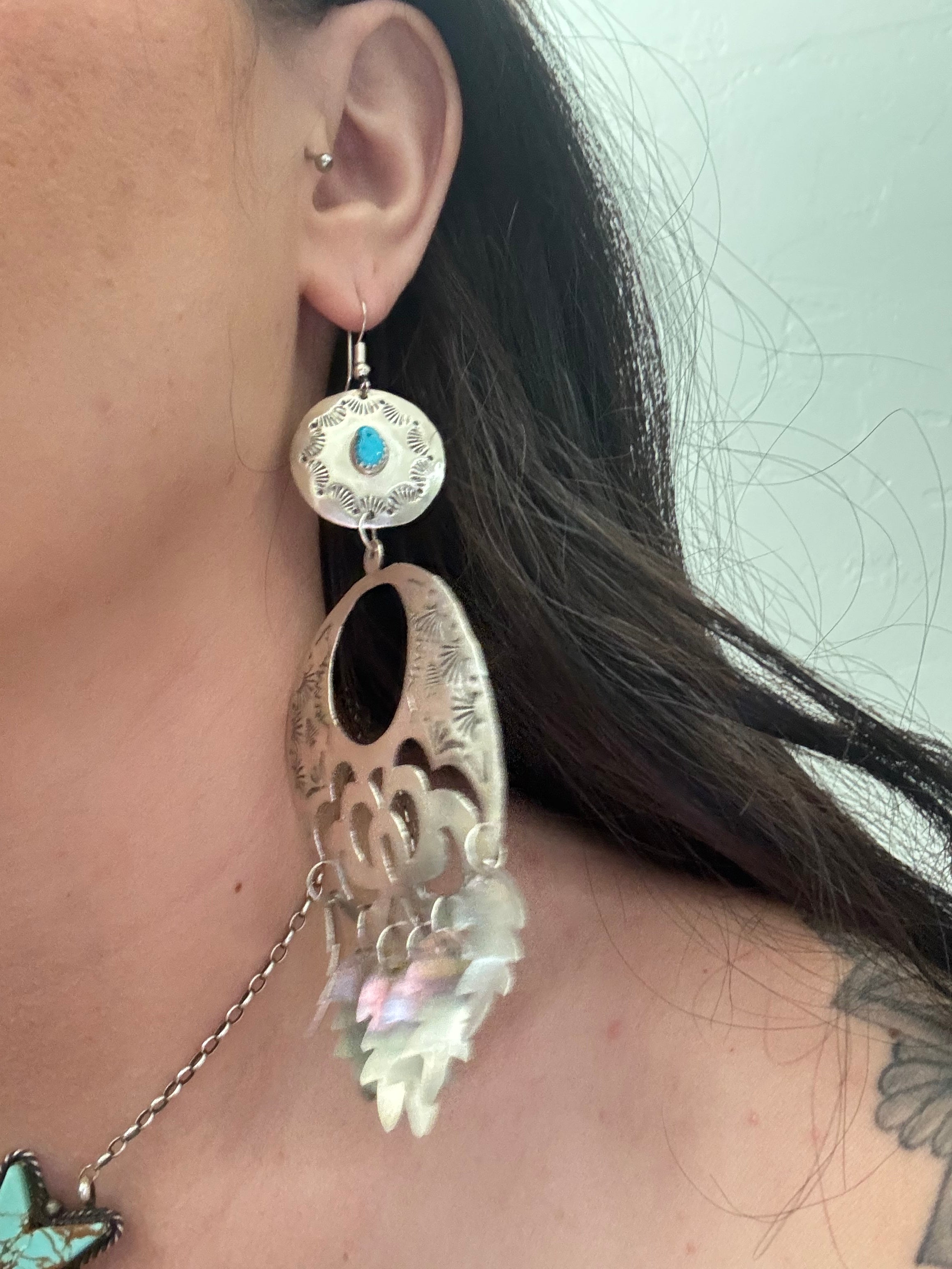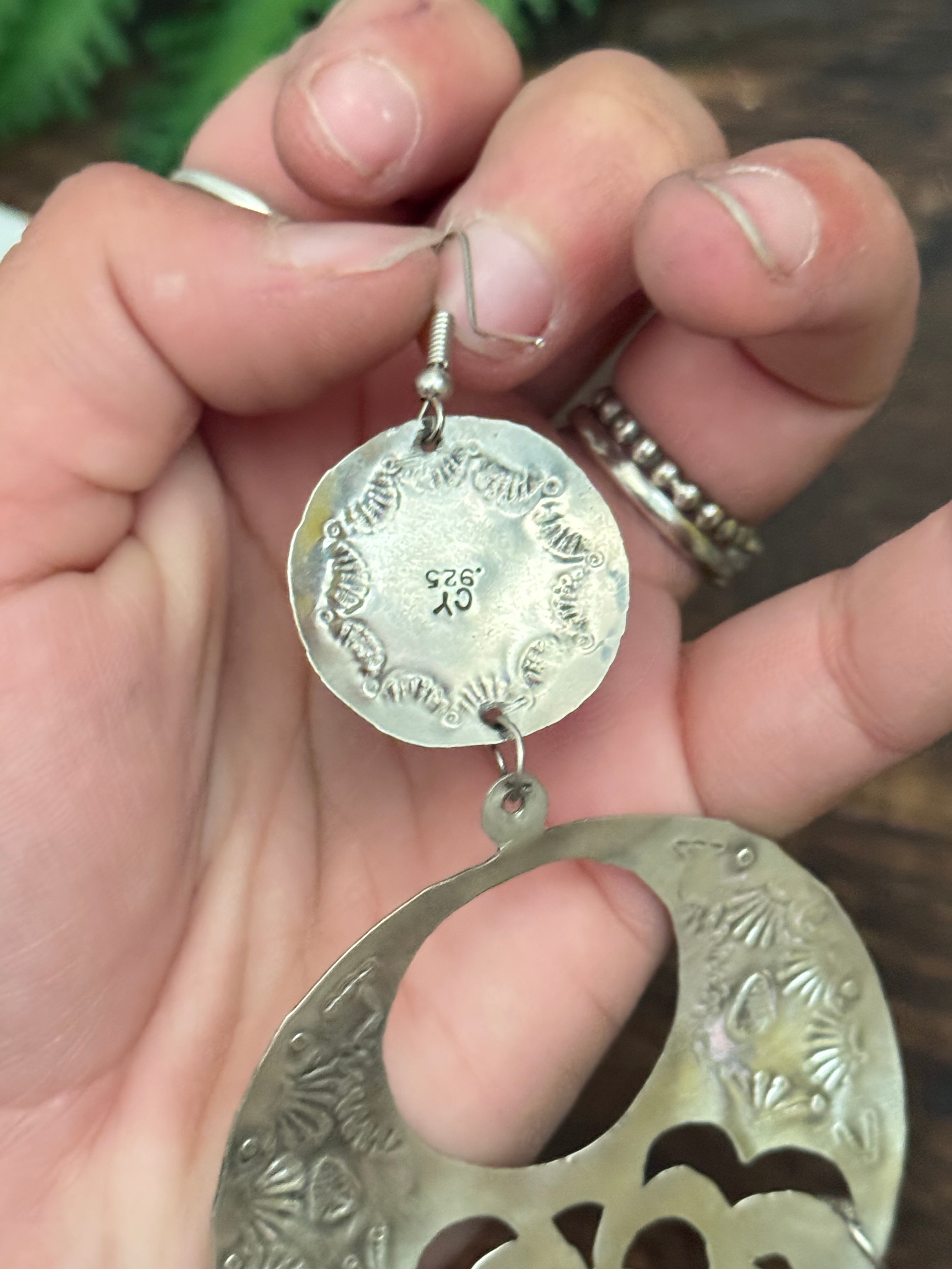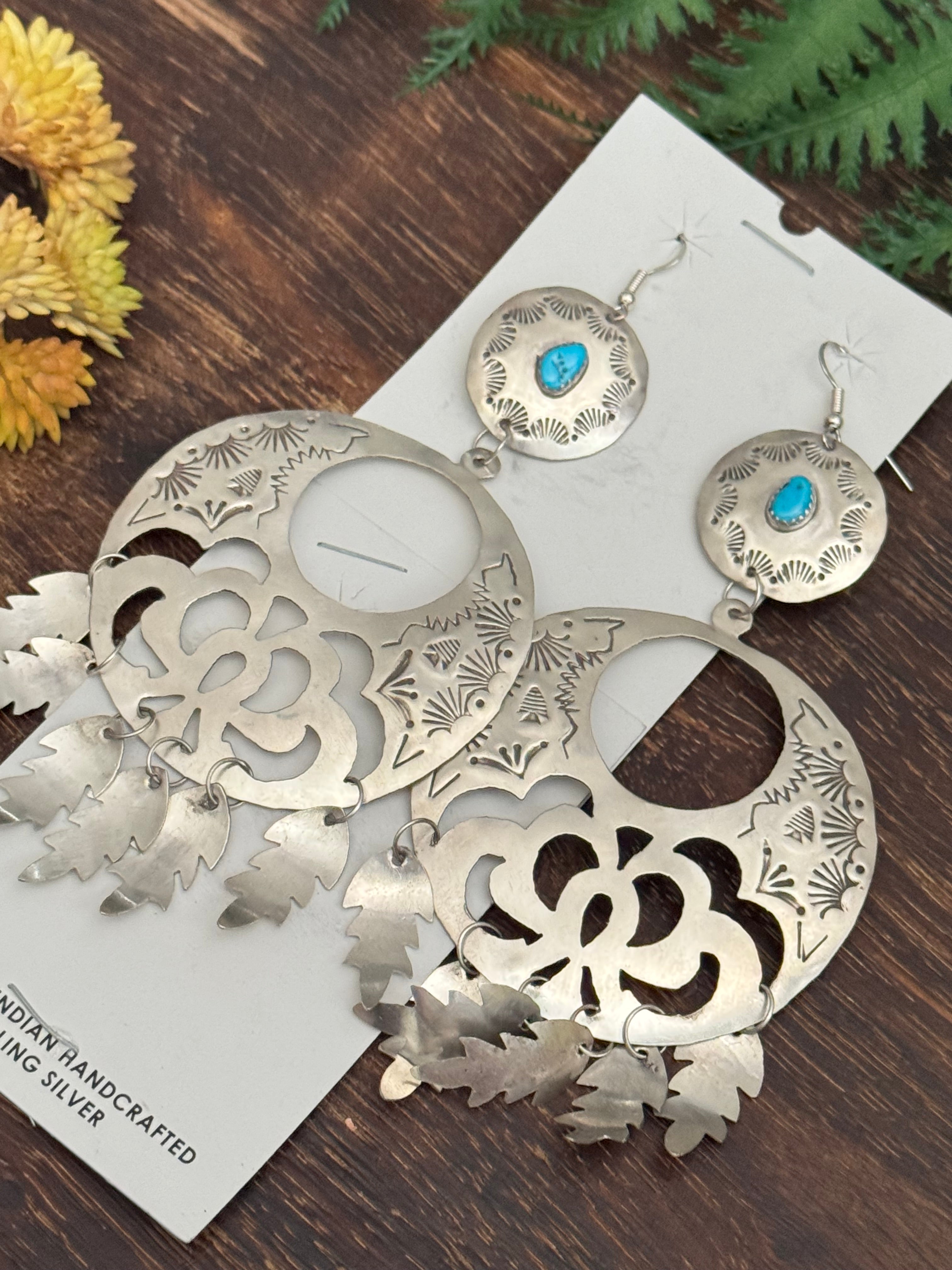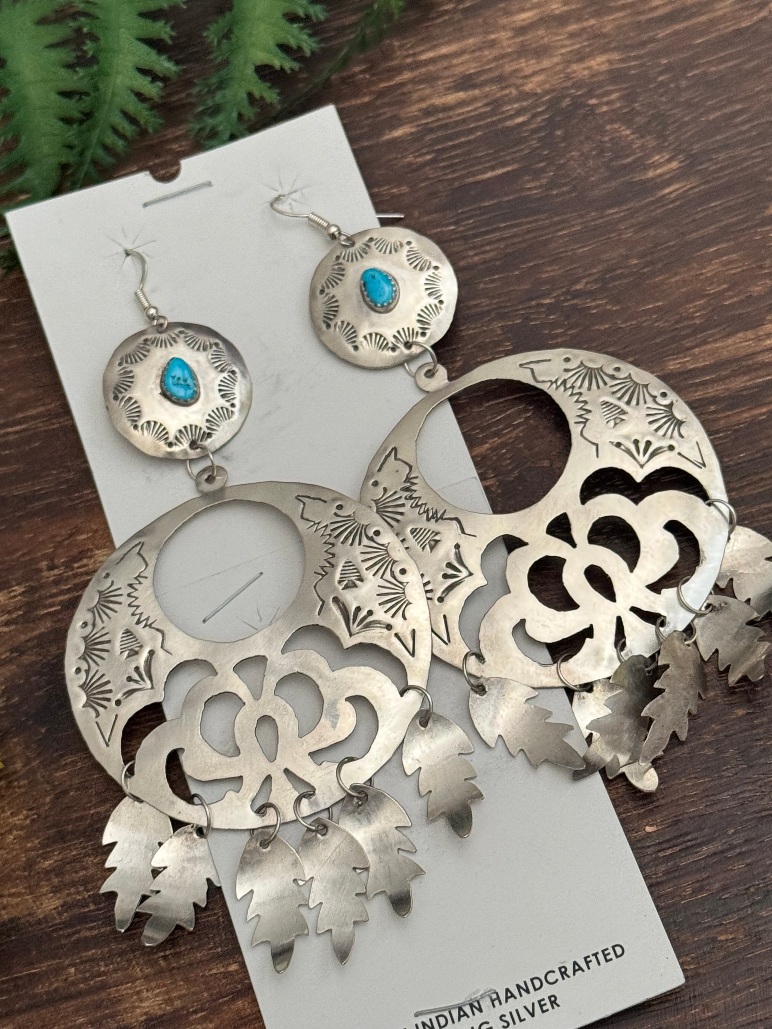Beautiful dangle earrings. Navajo Made Kingman Turquoise & Sterling Silver Dangle Earrings. It measures 5 1/8 inches long and just over 2 1/4 inches wide . Signed and stamped.