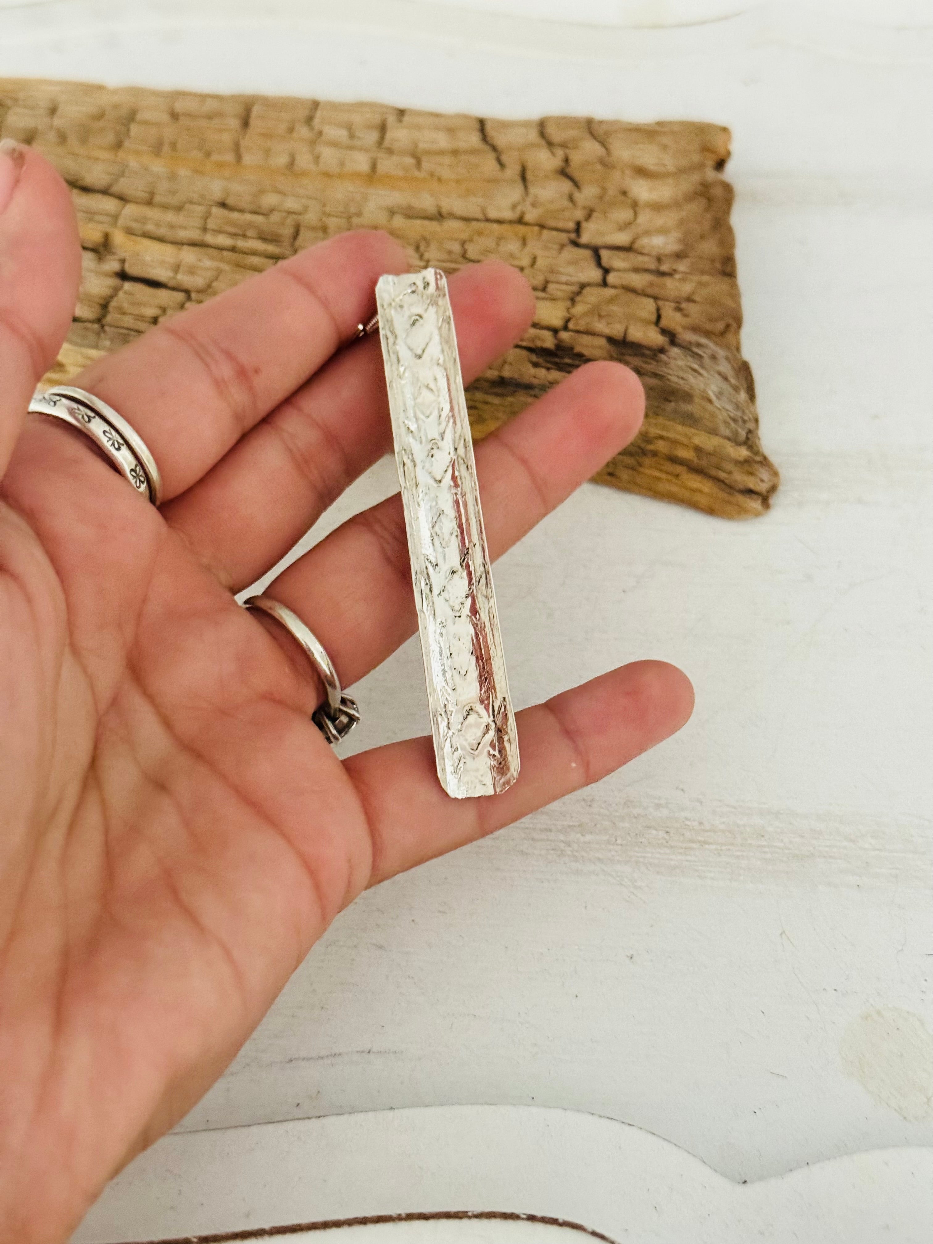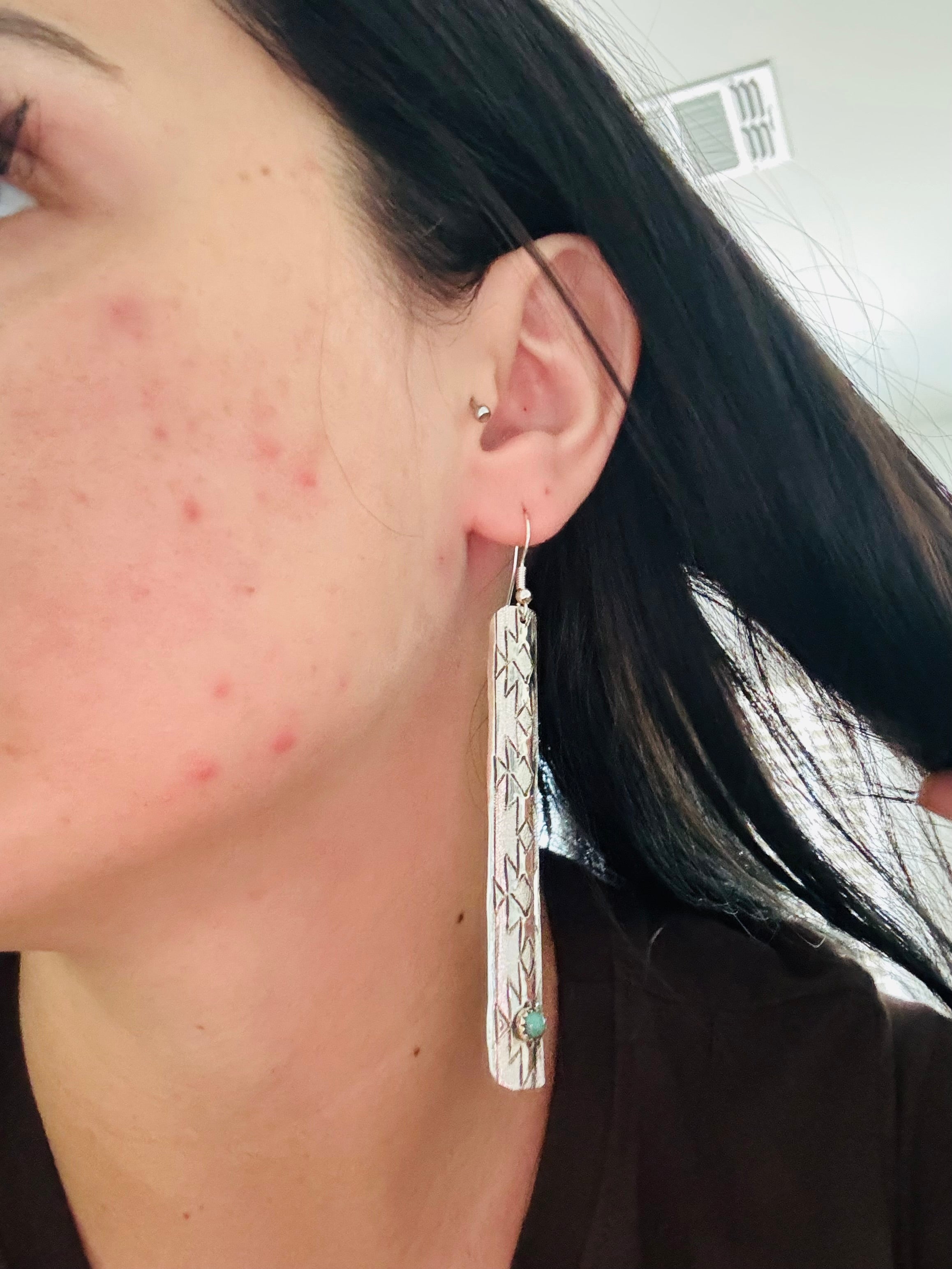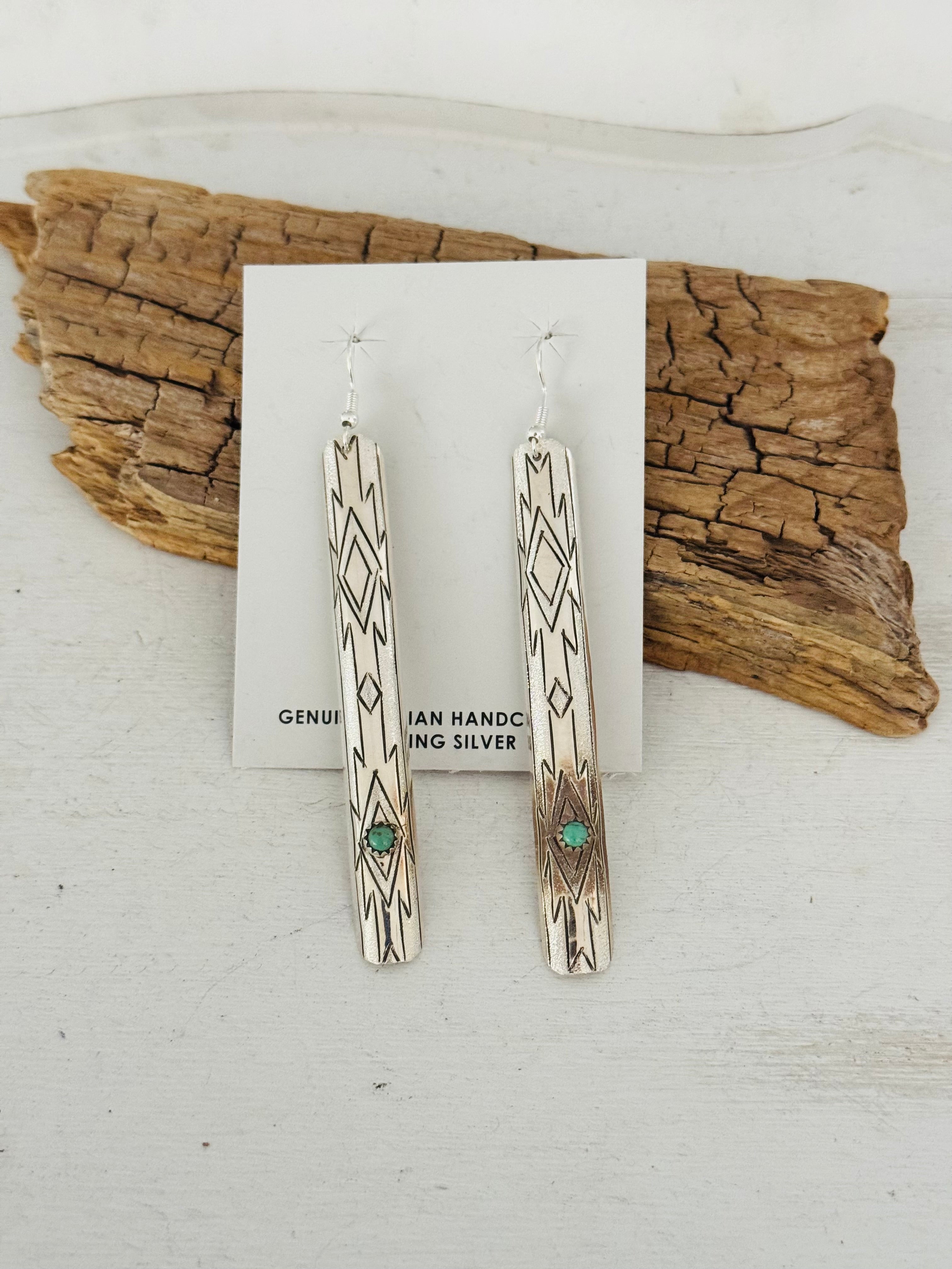Beautiful dangle earrings. Navajo Made Kingman Turquoise & Sterling Silver Dangle Earrings. It measures 3 3/4 inches long and 3/8 of an inch wide . Signed and stamped.