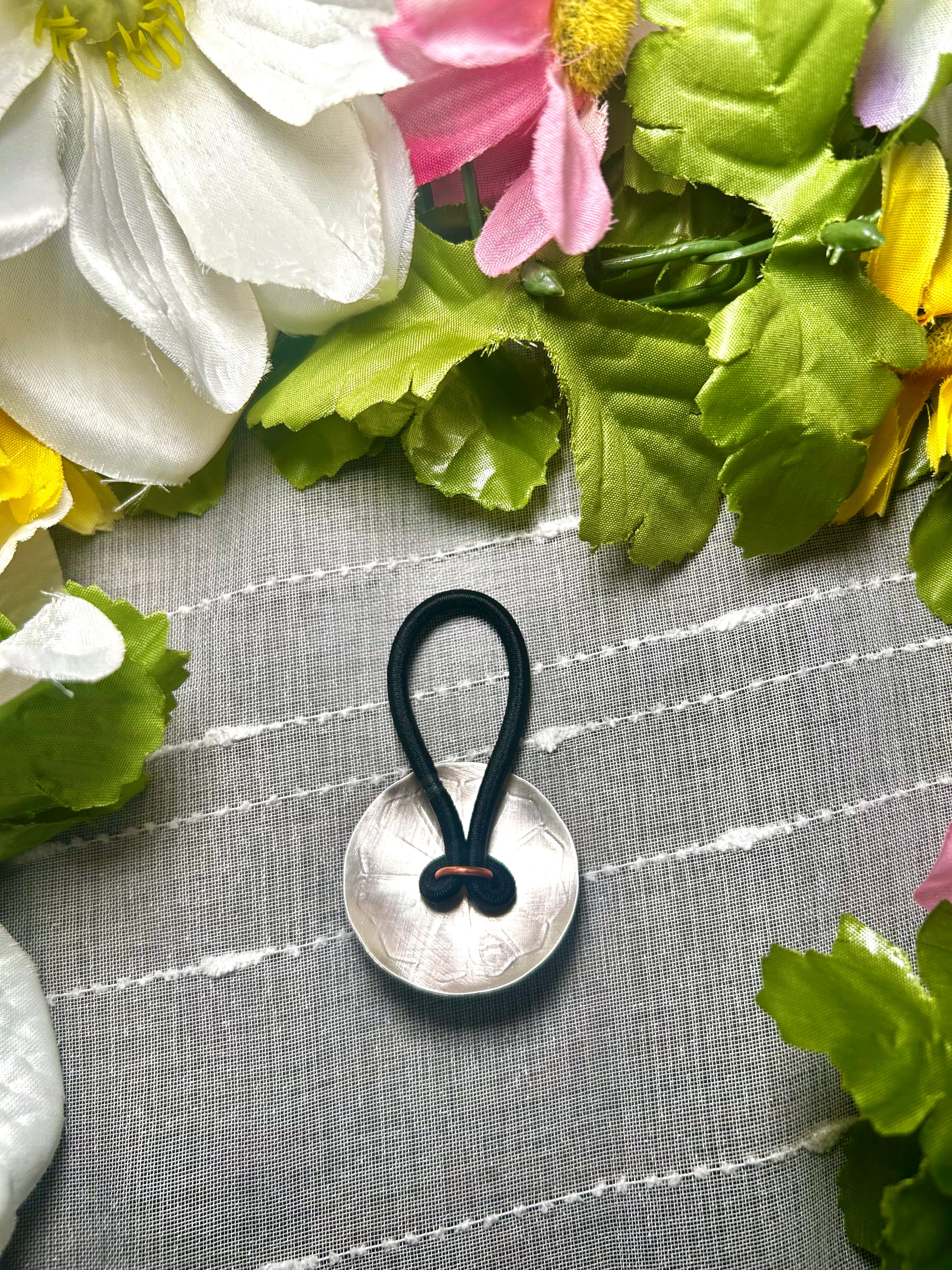 Navajo Made Mediterranean Coral & Sterling Silver Hair Tie. It measures 1 1/2 inches long and 1 1/2 inches wide. Signed by the artist and stamped sterling silver.