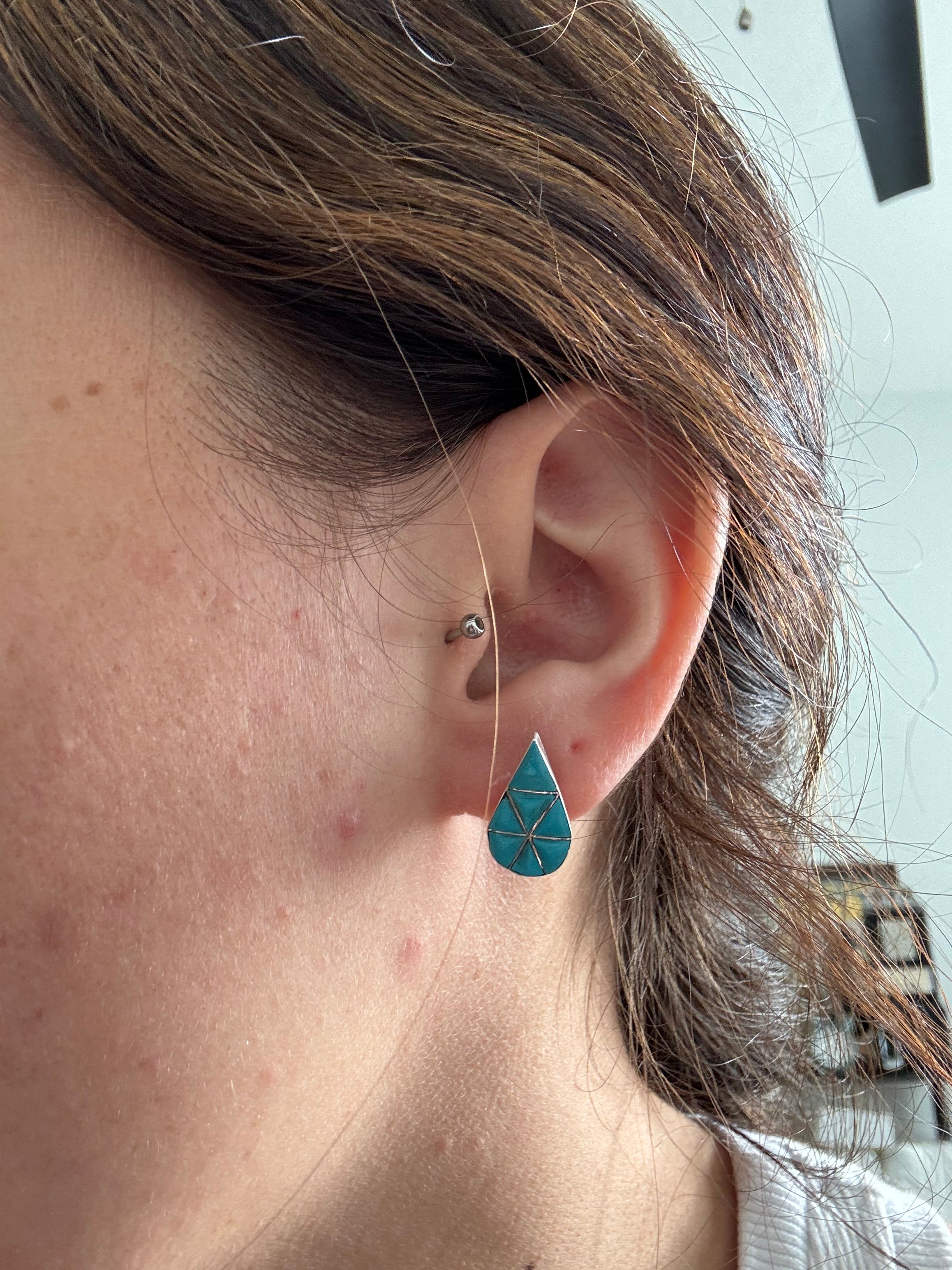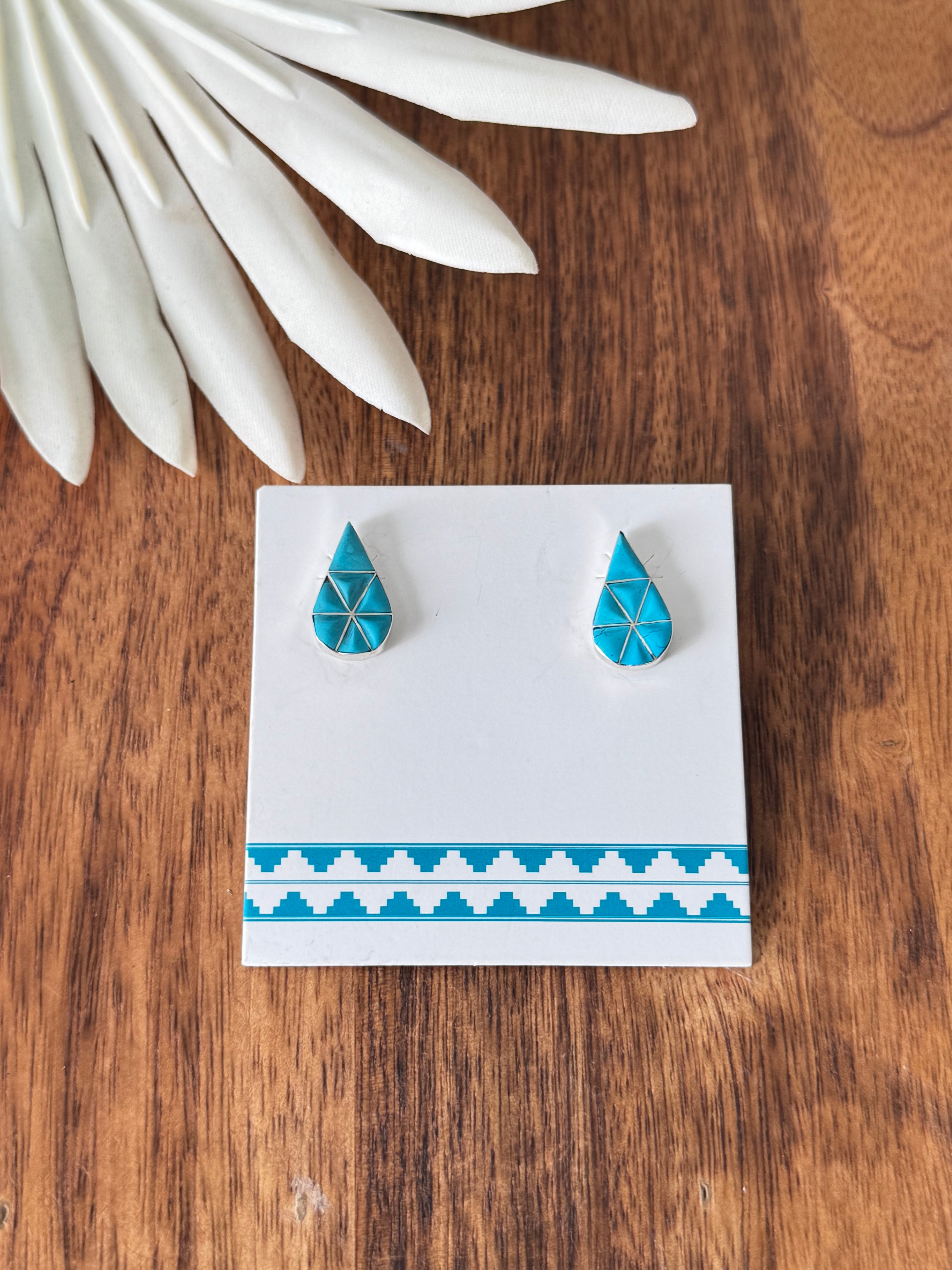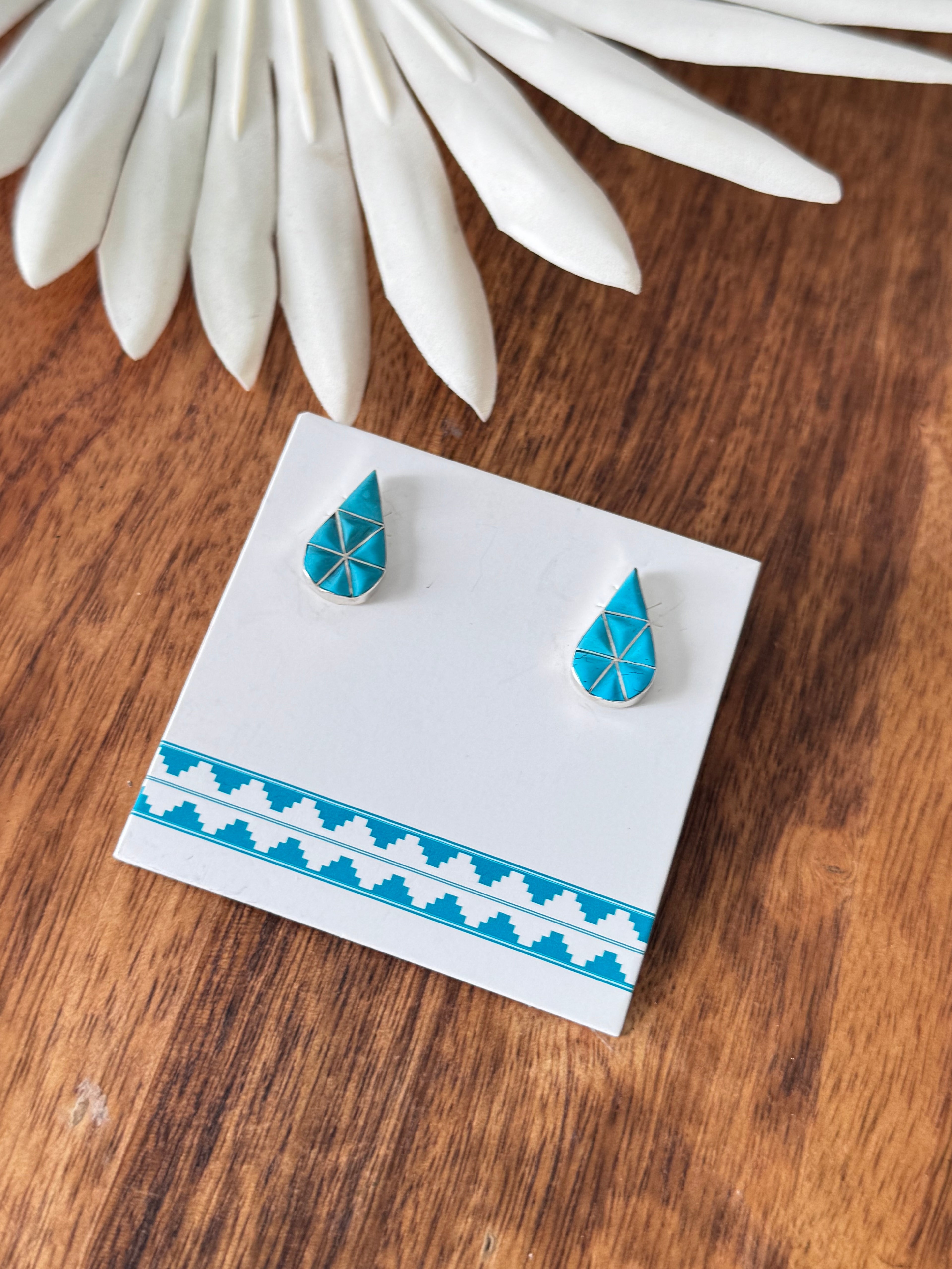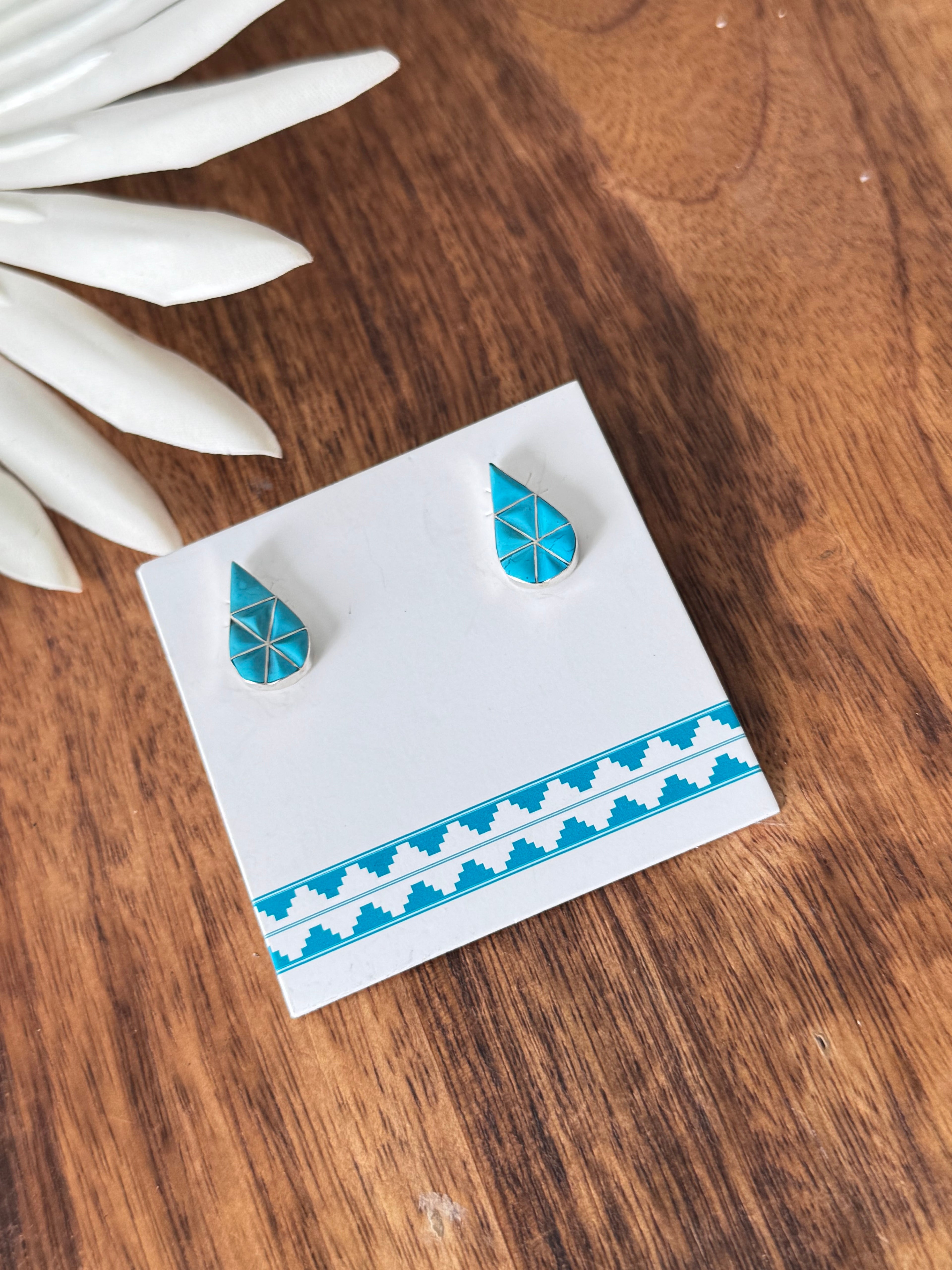 Zuni Made Turquoise & Sterling Silver Inlay Post Earrings. They measure just under 7/8 of an inch long and 5/8 of an inch wide. Stamped sterling silver.