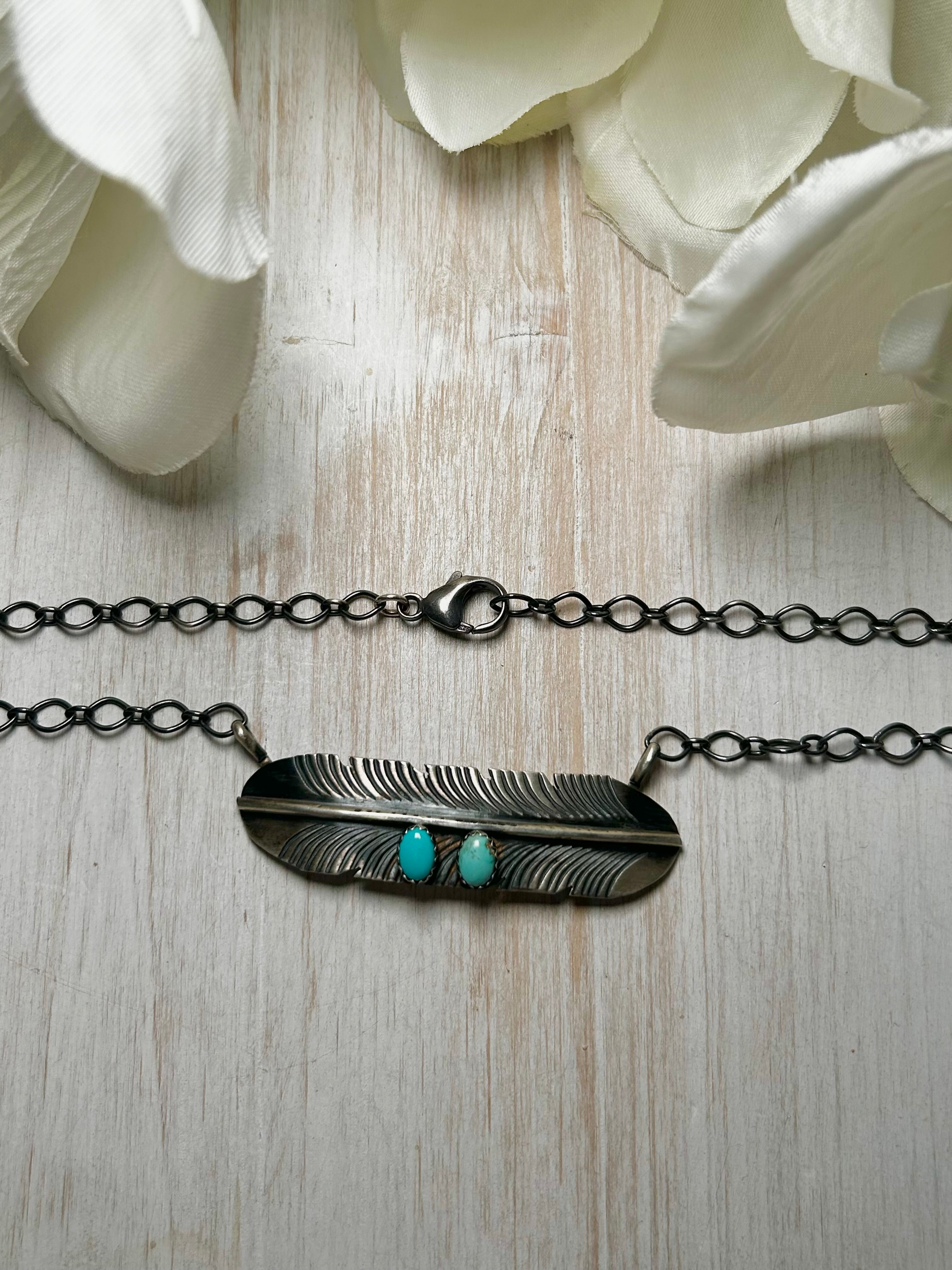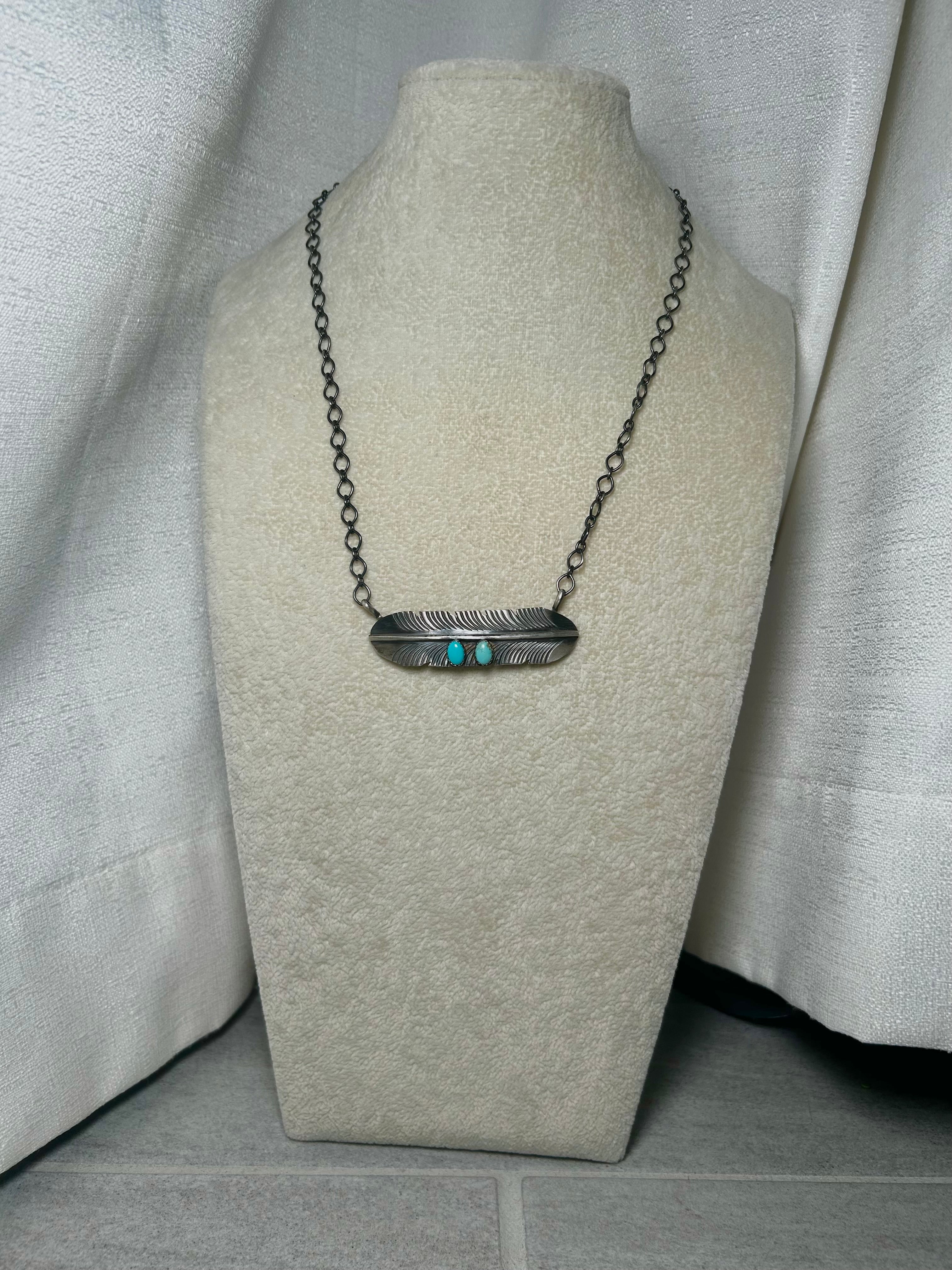 Navajo Made Kingman Turquoise & Sterling Silver Necklace. It measures 18 1/2 inches long with hang while the chain measures 17 inches long. Signed by the artist and stamped sterling silver.